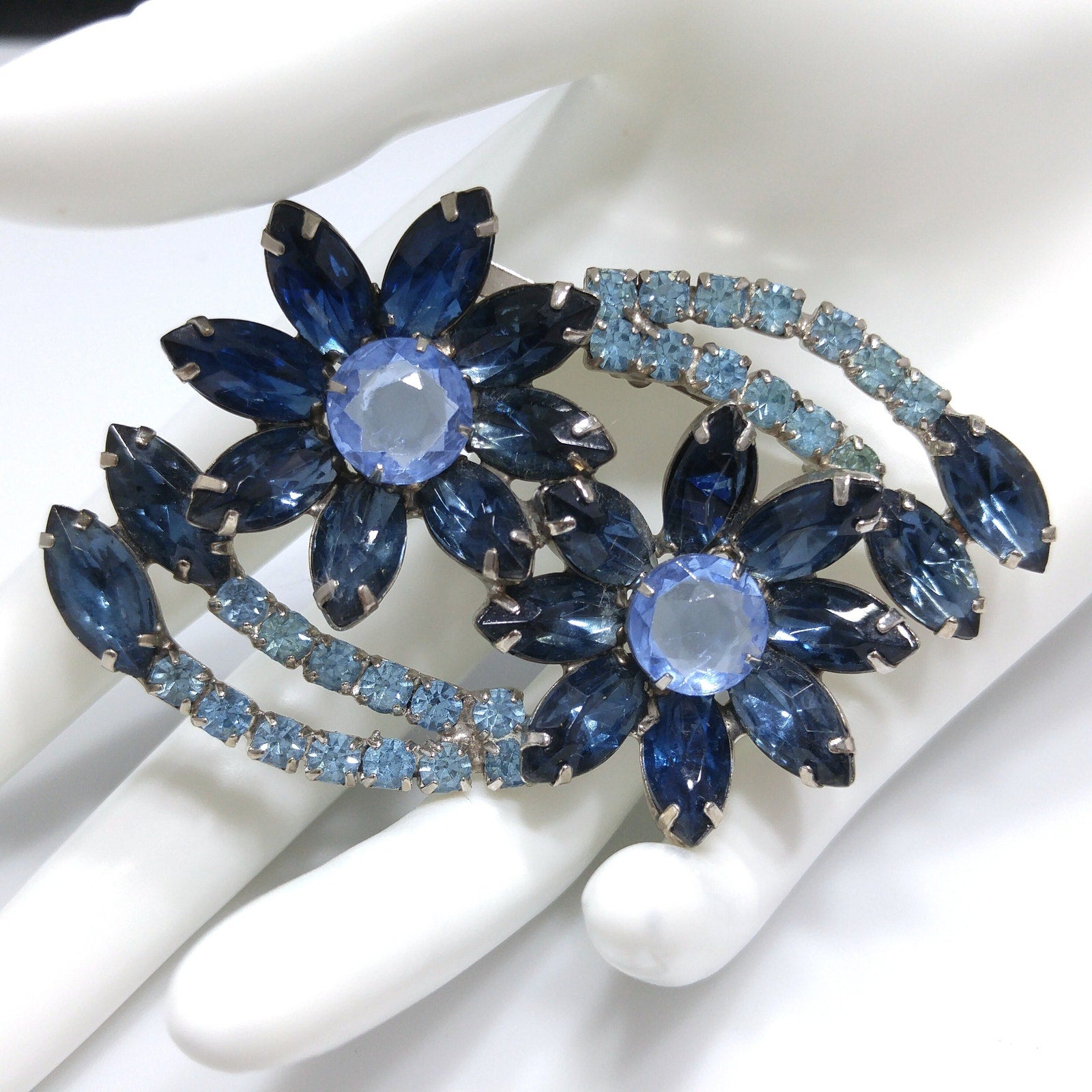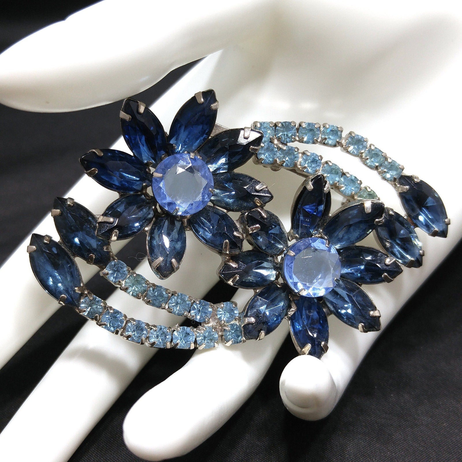 *Description: This is a beautiful large blue floral brooch from the 1960s. This large brooch has three shades of blue rhinestones on a rhodium plated backing. The two center flower rhinestones are open back so the light may shine through. This brooch is a little larger than average at 3 1/4 inches wide. Each rhinestone is prong set and designer made; even though unsigned. This would be a great addition to your vintage jewelry collection or make a great vintage gift!