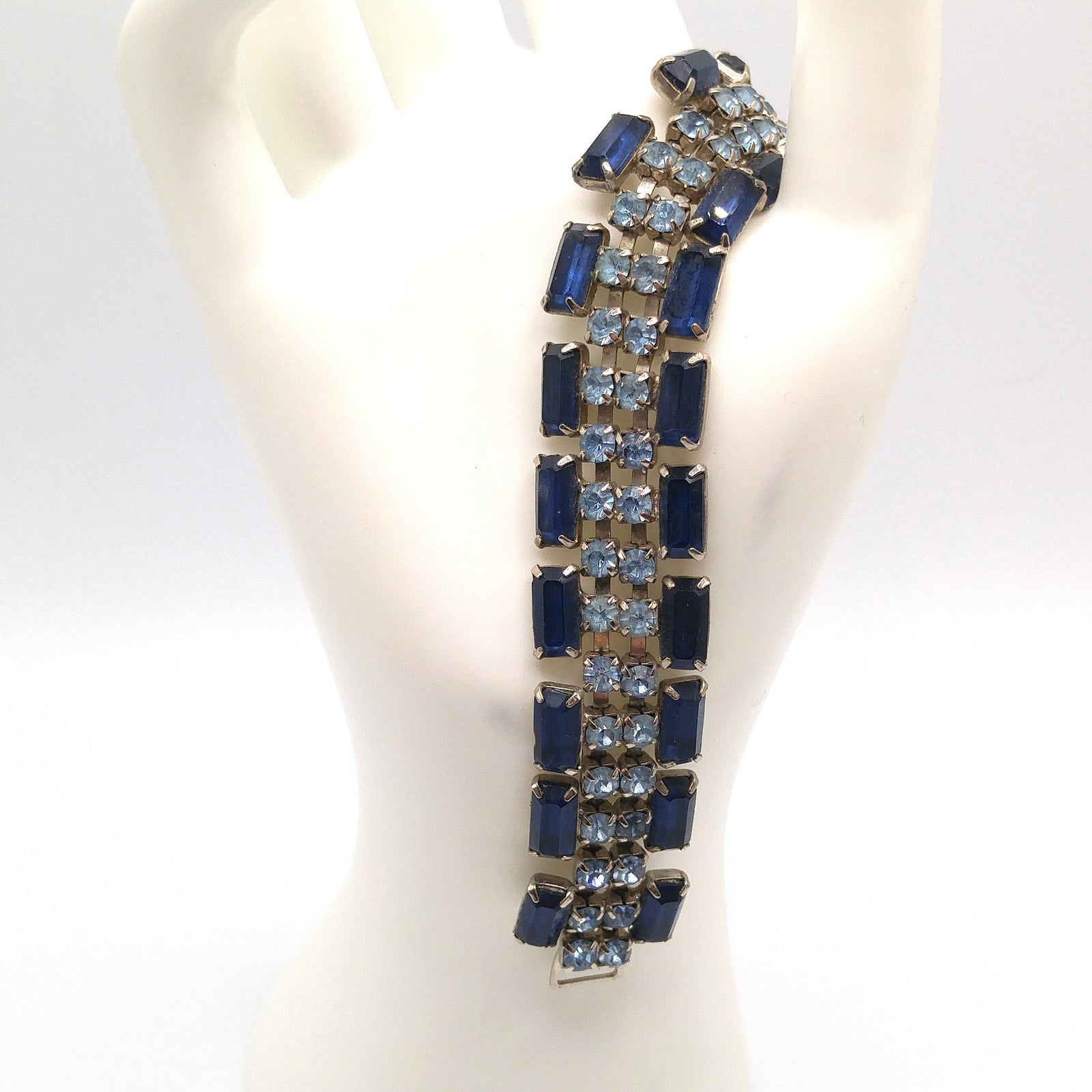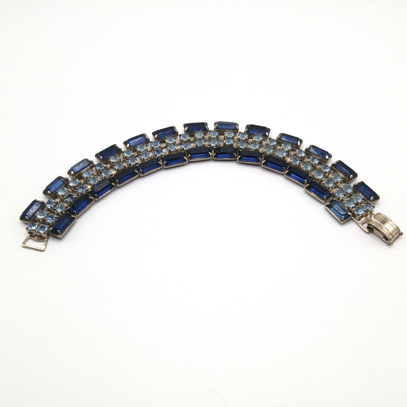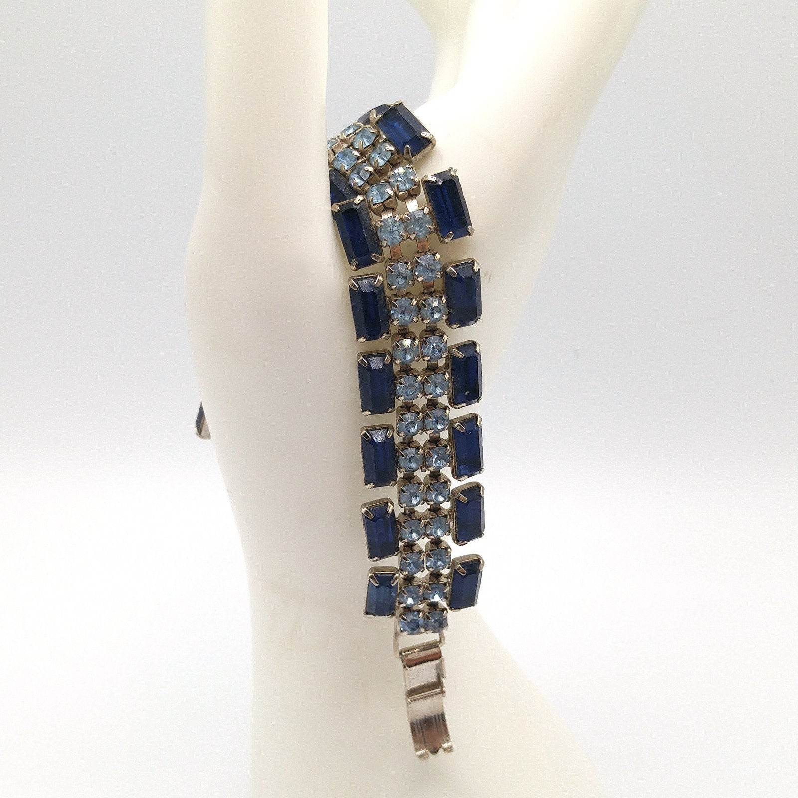 *Description: This is a great mid-century blue rhinestone wide bracelet on a silver tone backing from the 1950s. Each rhinestone is prong set and the outer rows are darker blue rectangular rhinestones and the two inner rows are chaton cut light blue rhinestones. The fold over clasp fits securely. Each rhinestone is in place. This would be a great addition to your vintage jewelry collection or make a great vintage gift!