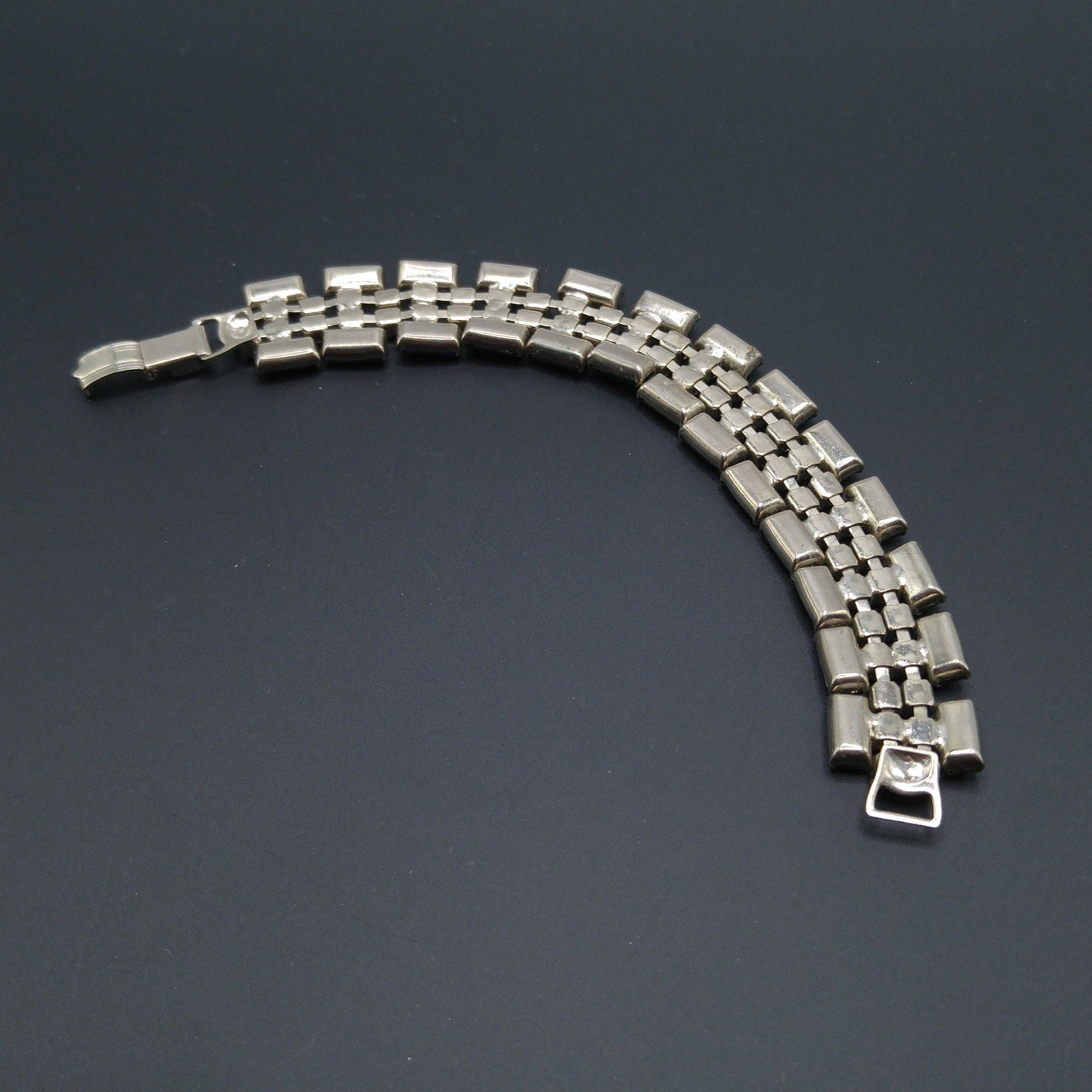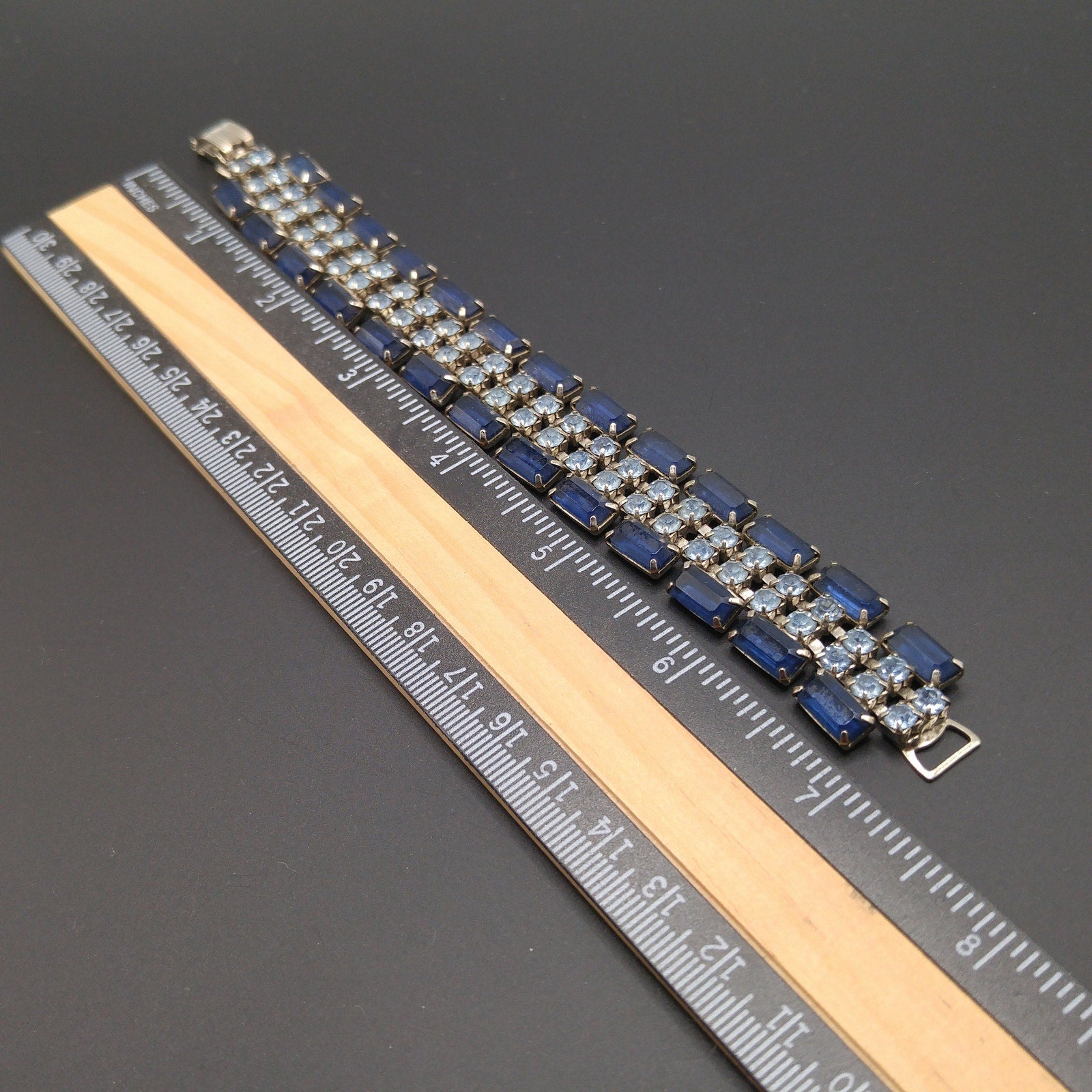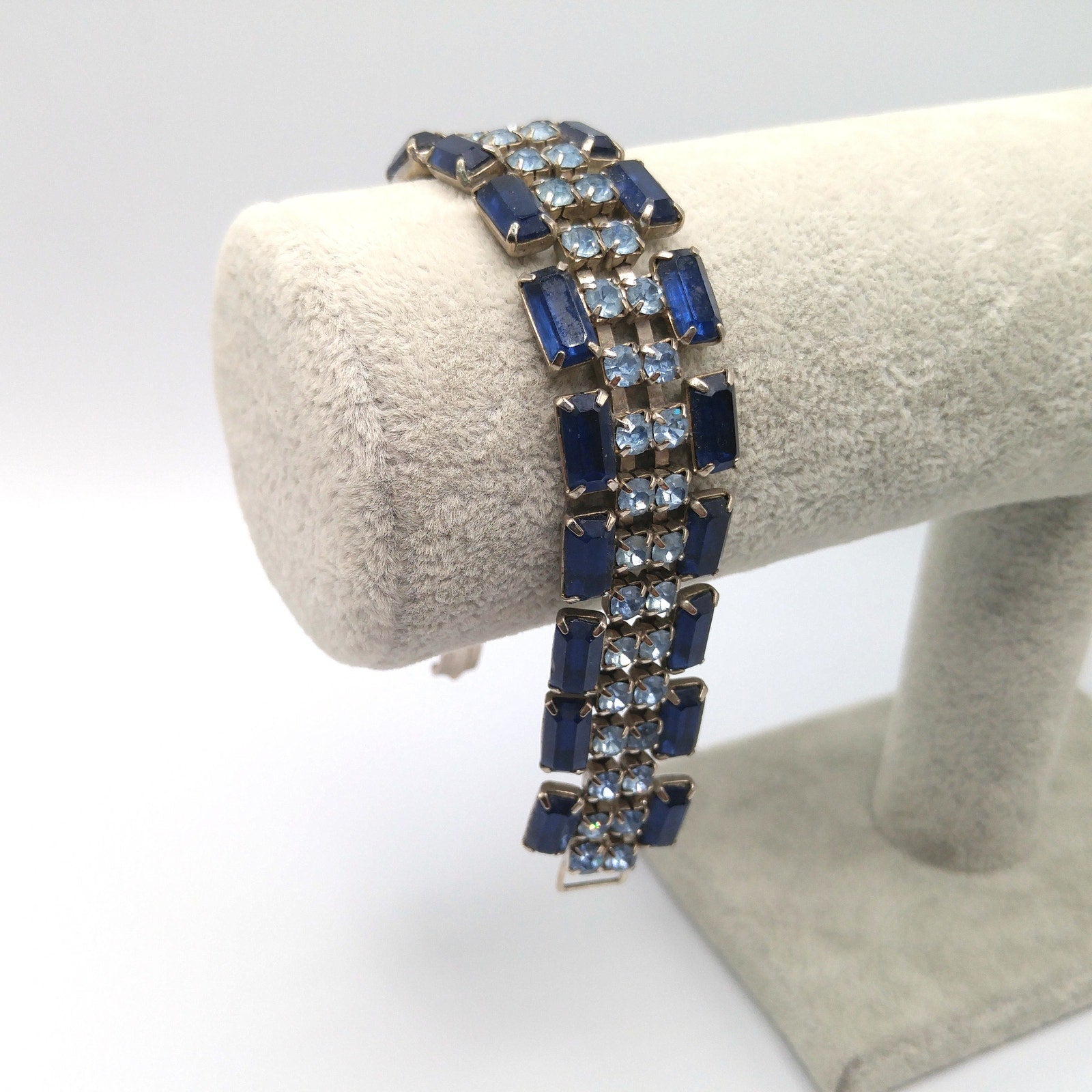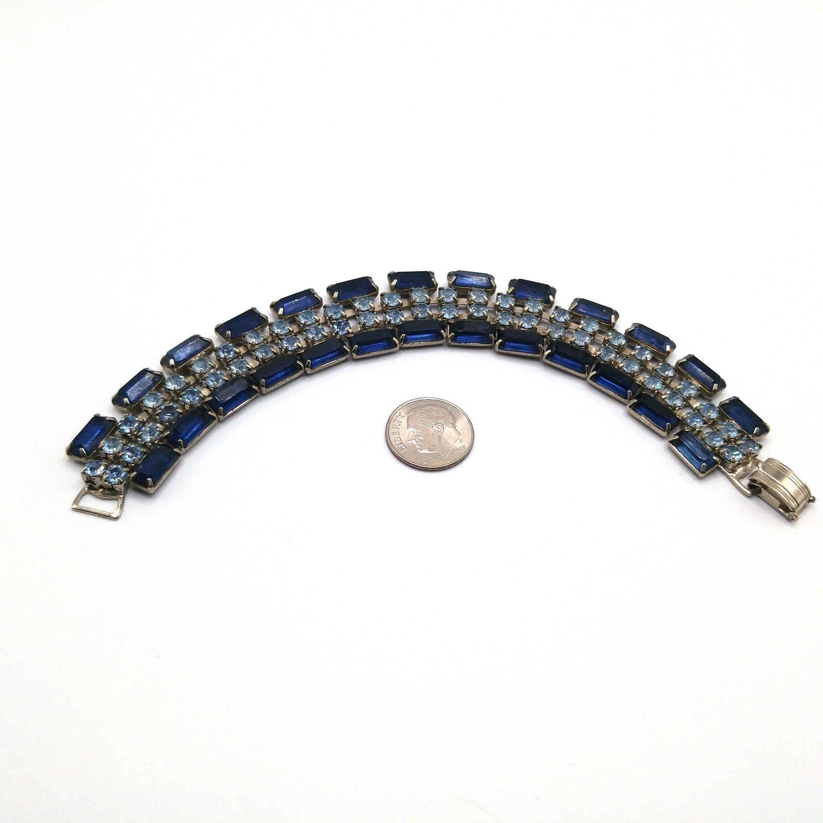*Description: This is a great mid-century blue rhinestone wide bracelet on a silver tone backing from the 1950s. Each rhinestone is prong set and the outer rows are darker blue rectangular rhinestones and the two inner rows are chaton cut light blue rhinestones. The fold over clasp fits securely. Each rhinestone is in place. This would be a great addition to your vintage jewelry collection or make a great vintage gift!