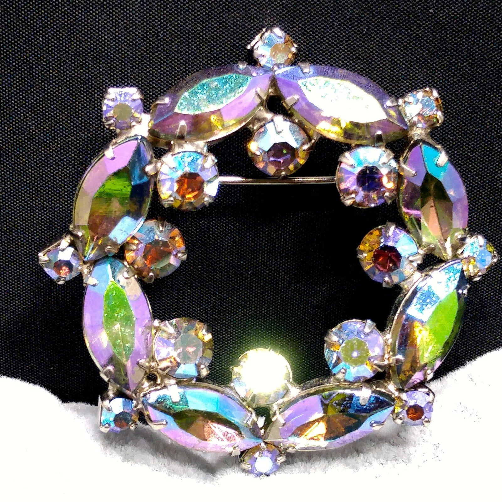 This brooch is unsigned but beautifully crafted and collectible. It would be a standout addition to any vintage jewelry collection or a thoughtful gift for someone who loves iridescent rhinestones.