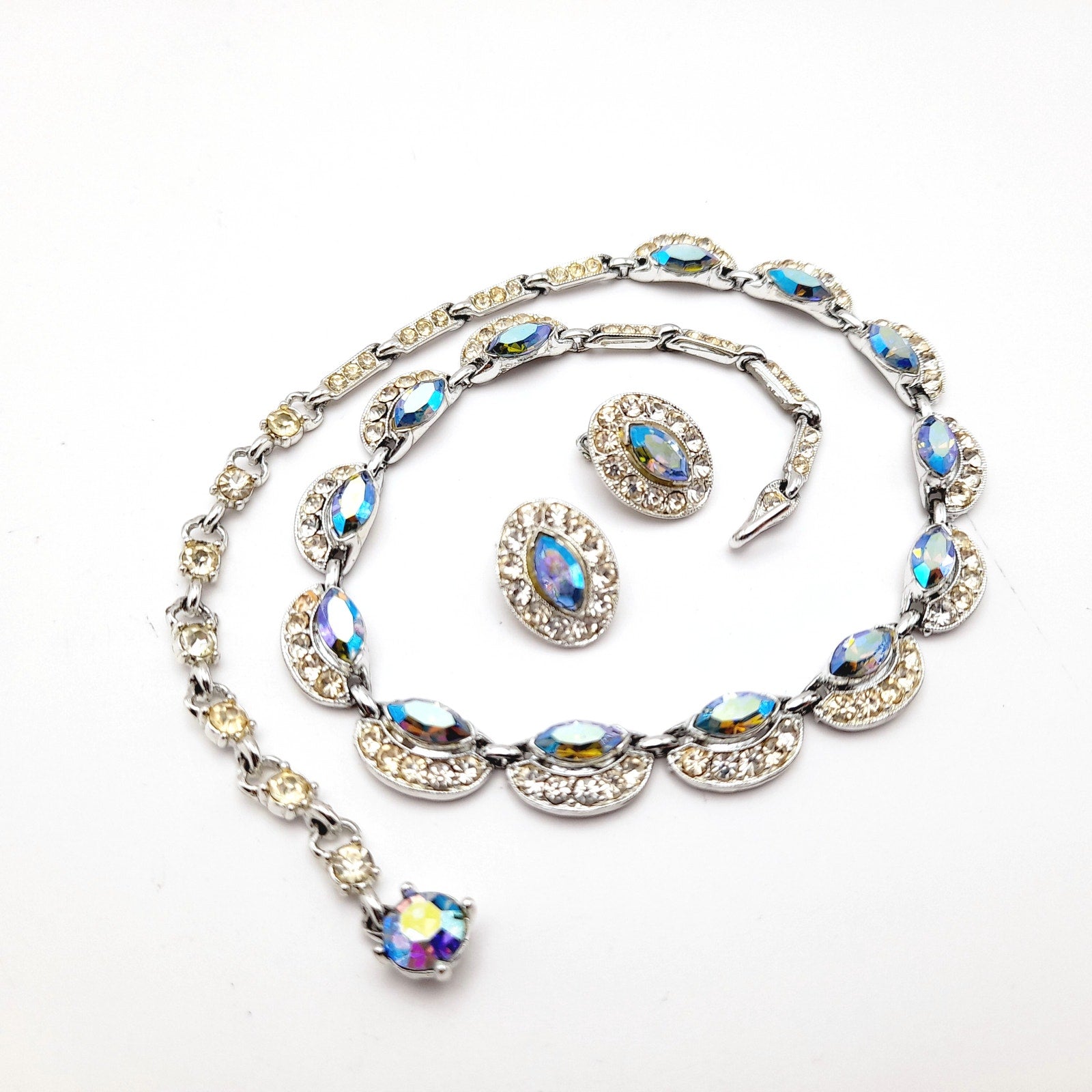 The necklace sits elegantly on the neck, while the clip earrings are comfortable and secure. This set is in excellent condition and ready to wear. Don't miss the chance to own this exquisite vintage jewelry set!