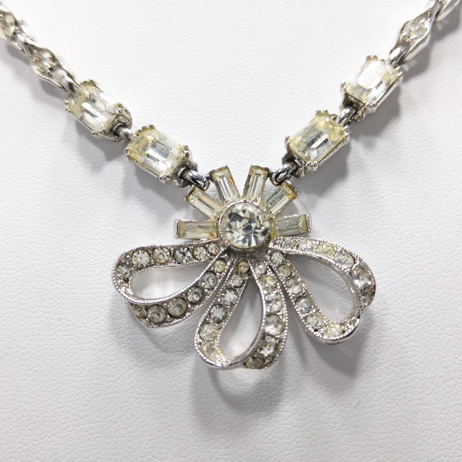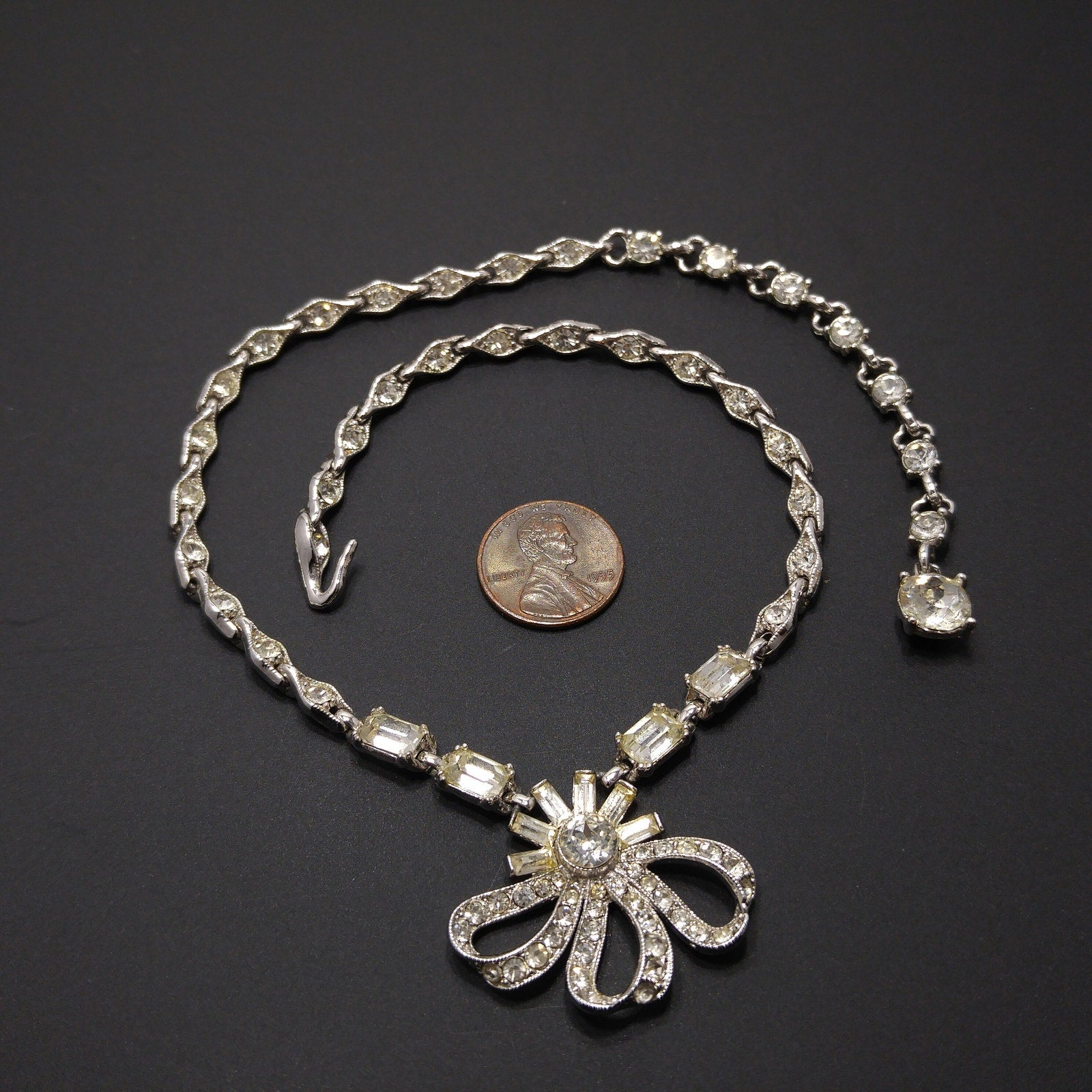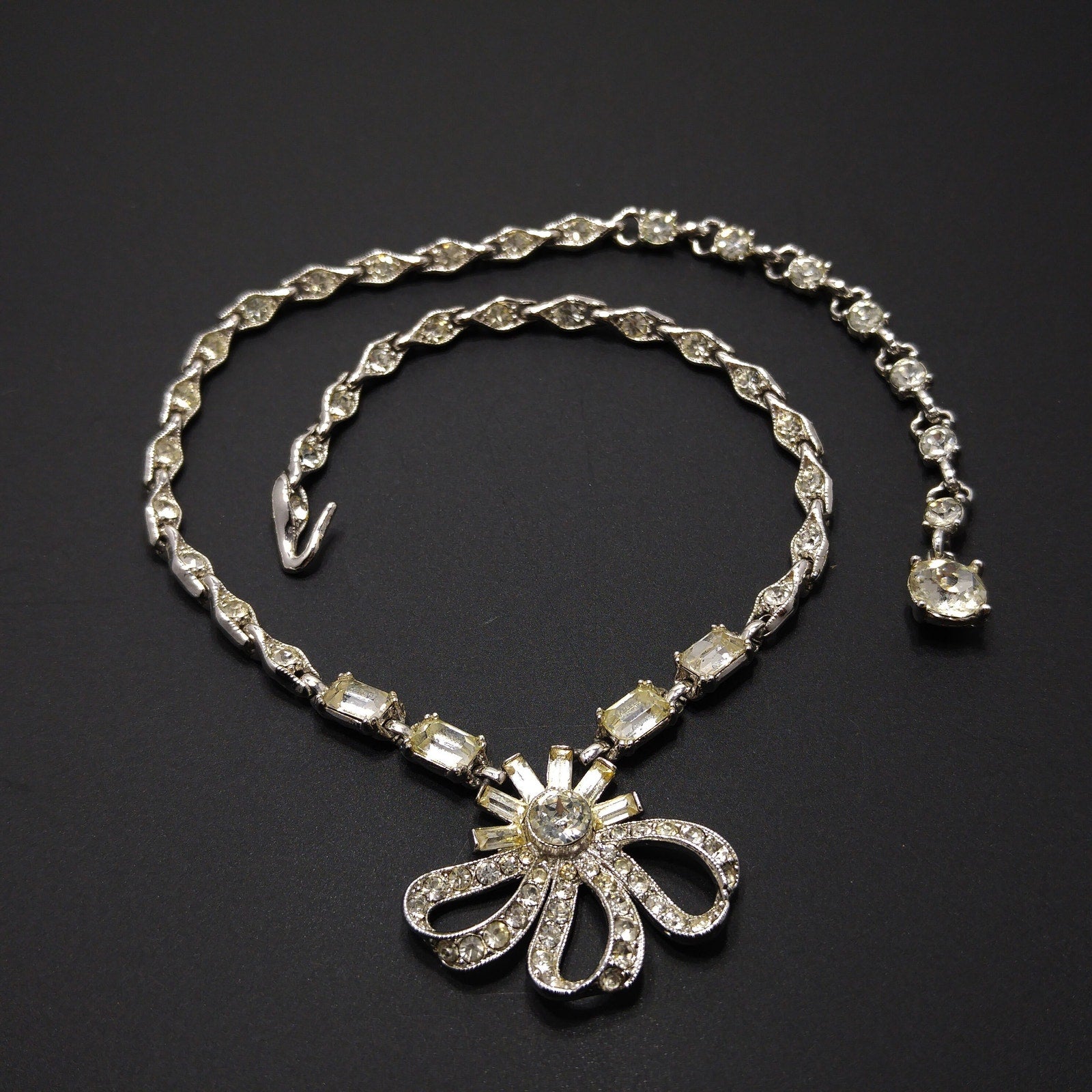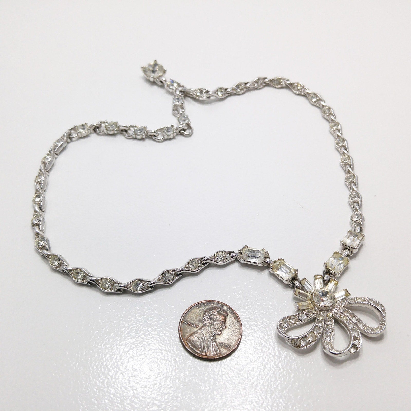 *Description: This is a beautiful mid-century clear rhinestone choker necklace designed by Bogoff from the 1950s. The necklace has a beautiful bow pendant decorated with clear rhinestones which extend up the entire length of the necklace chain. The hook clasp has two circle ring to adjust the length with a large clear rhinestone at the opposite side as an end stone. All rhinestones are in place and full of sparkle. It would be a beautiful bridal necklace or perfect for any formal occasion. It would also make a great vintage gift.