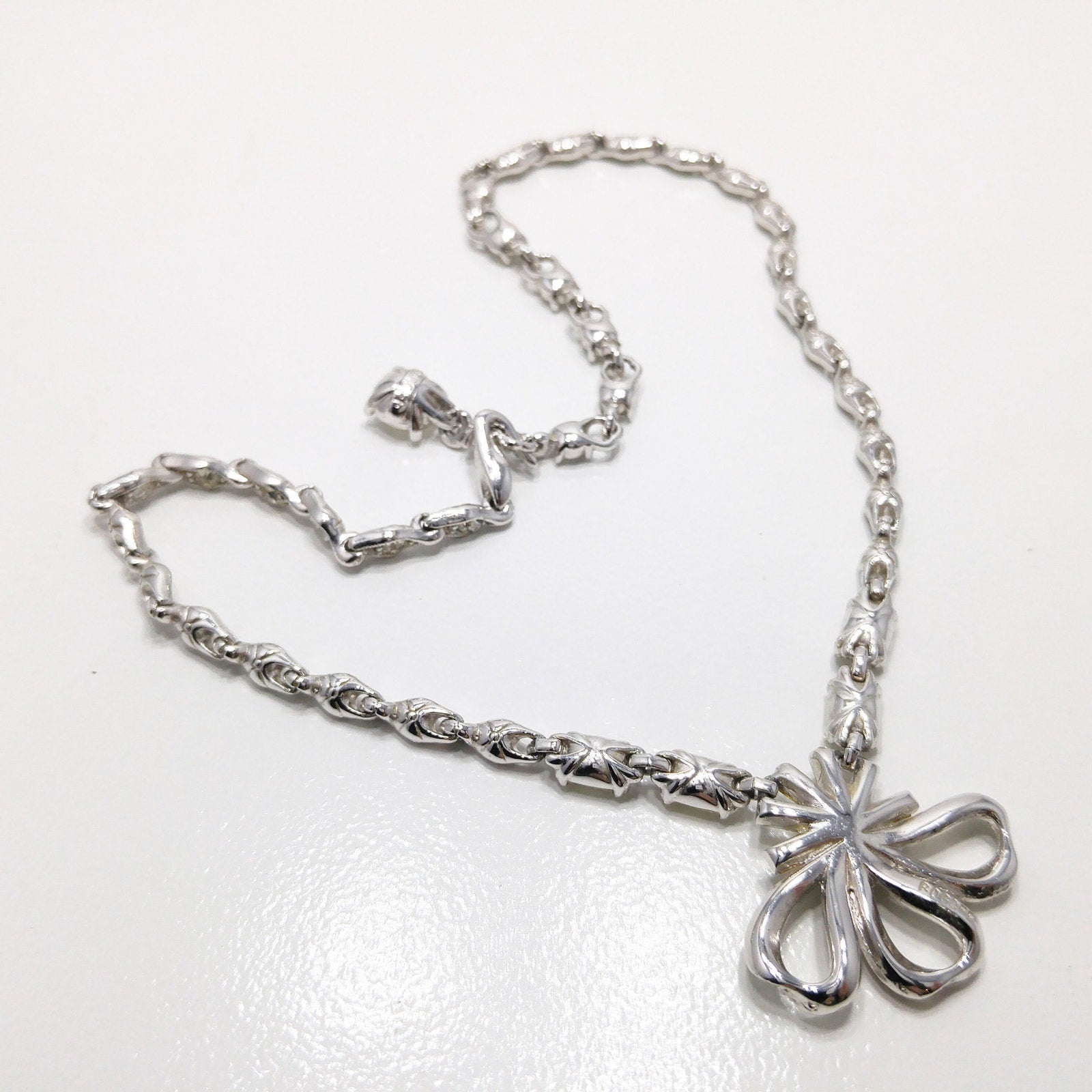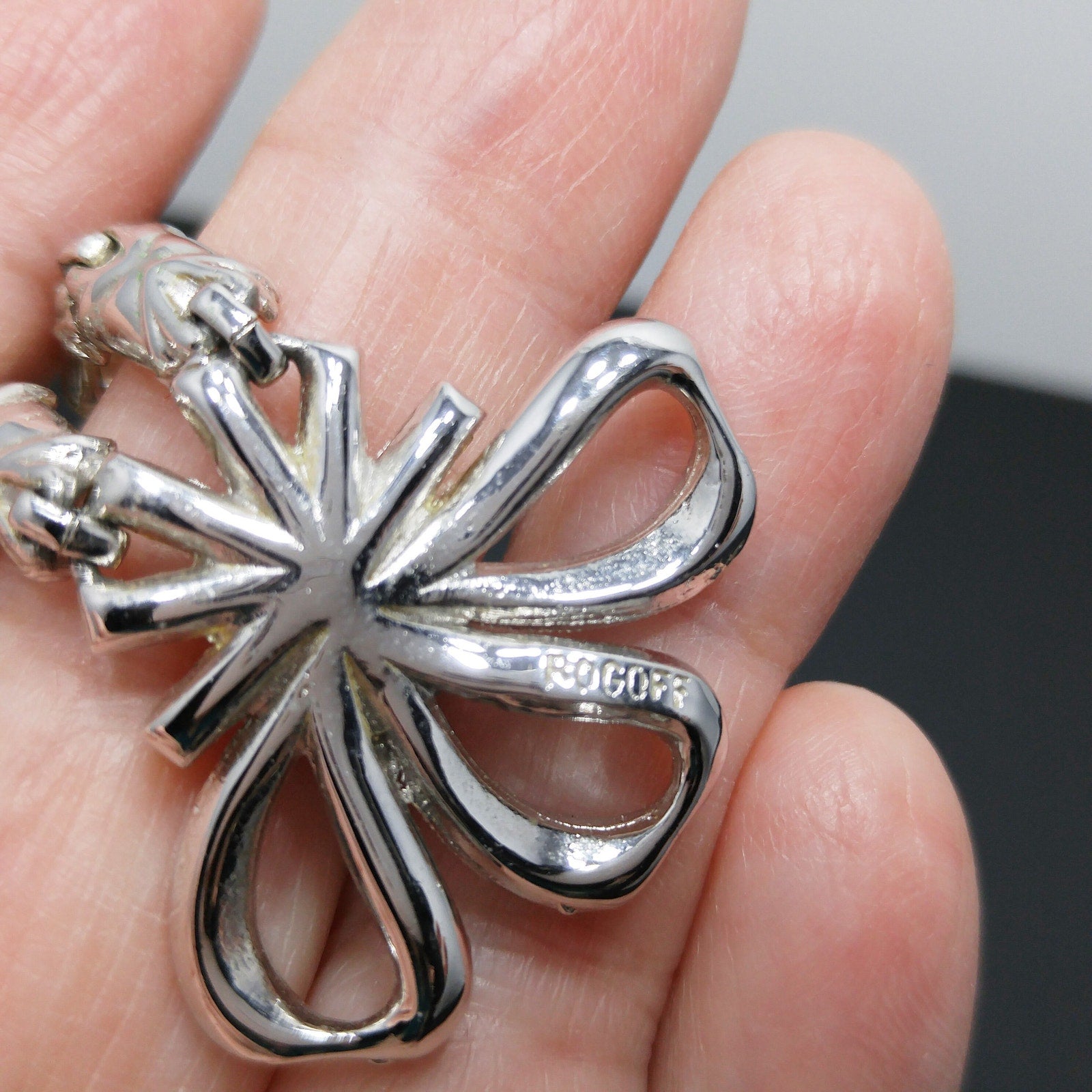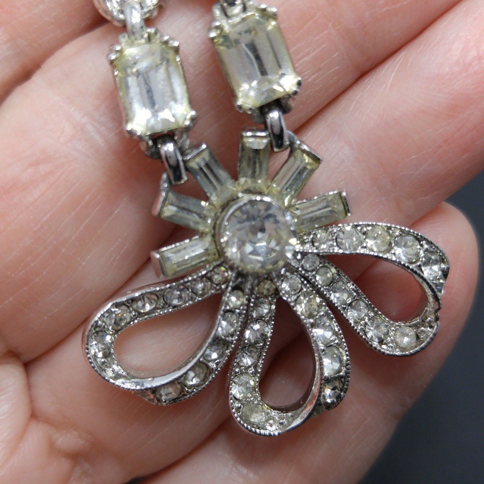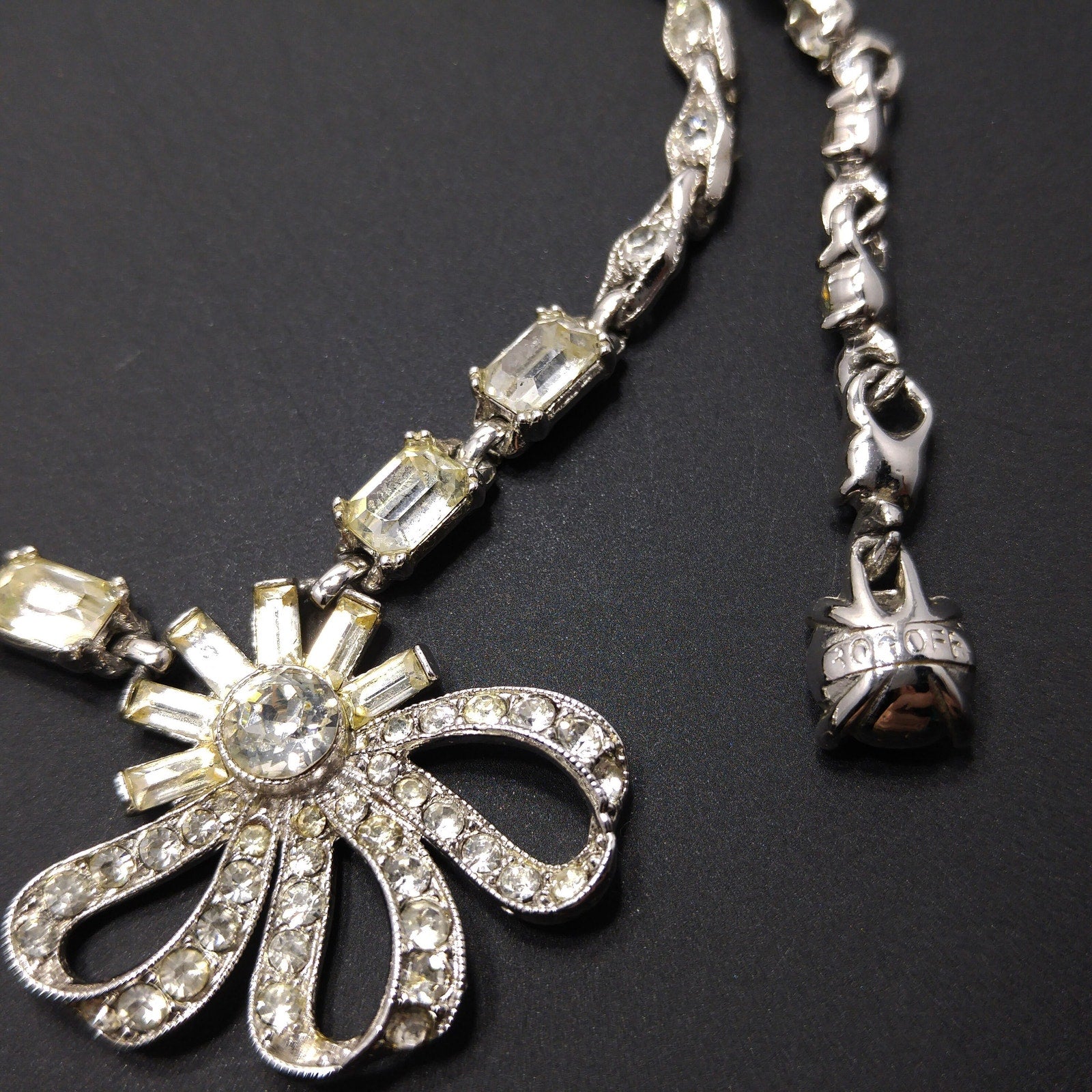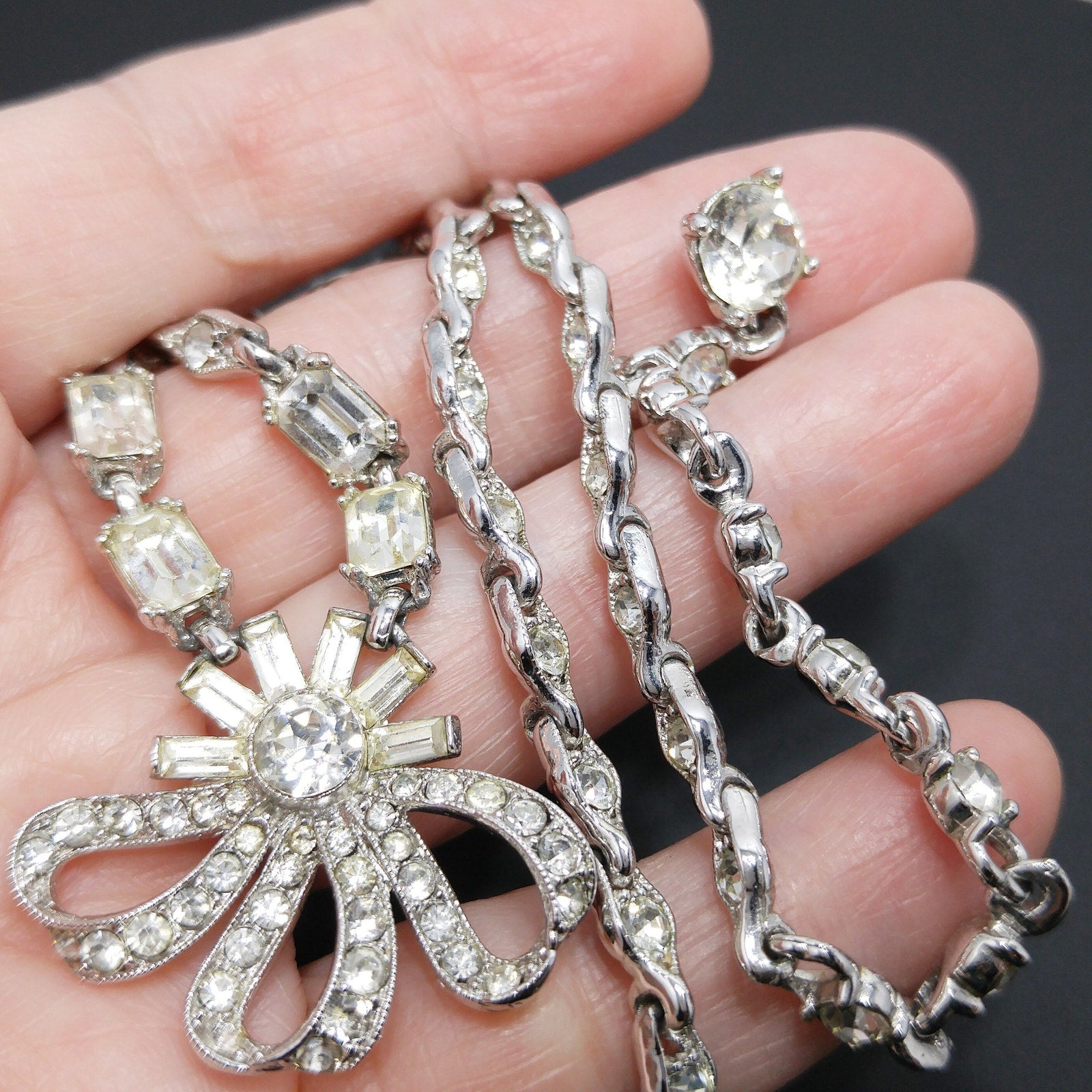 *Description: This is a beautiful mid-century clear rhinestone choker necklace designed by Bogoff from the 1950s. The necklace has a beautiful bow pendant decorated with clear rhinestones which extend up the entire length of the necklace chain. The hook clasp has two circle ring to adjust the length with a large clear rhinestone at the opposite side as an end stone. All rhinestones are in place and full of sparkle. It would be a beautiful bridal necklace or perfect for any formal occasion. It would also make a great vintage gift.