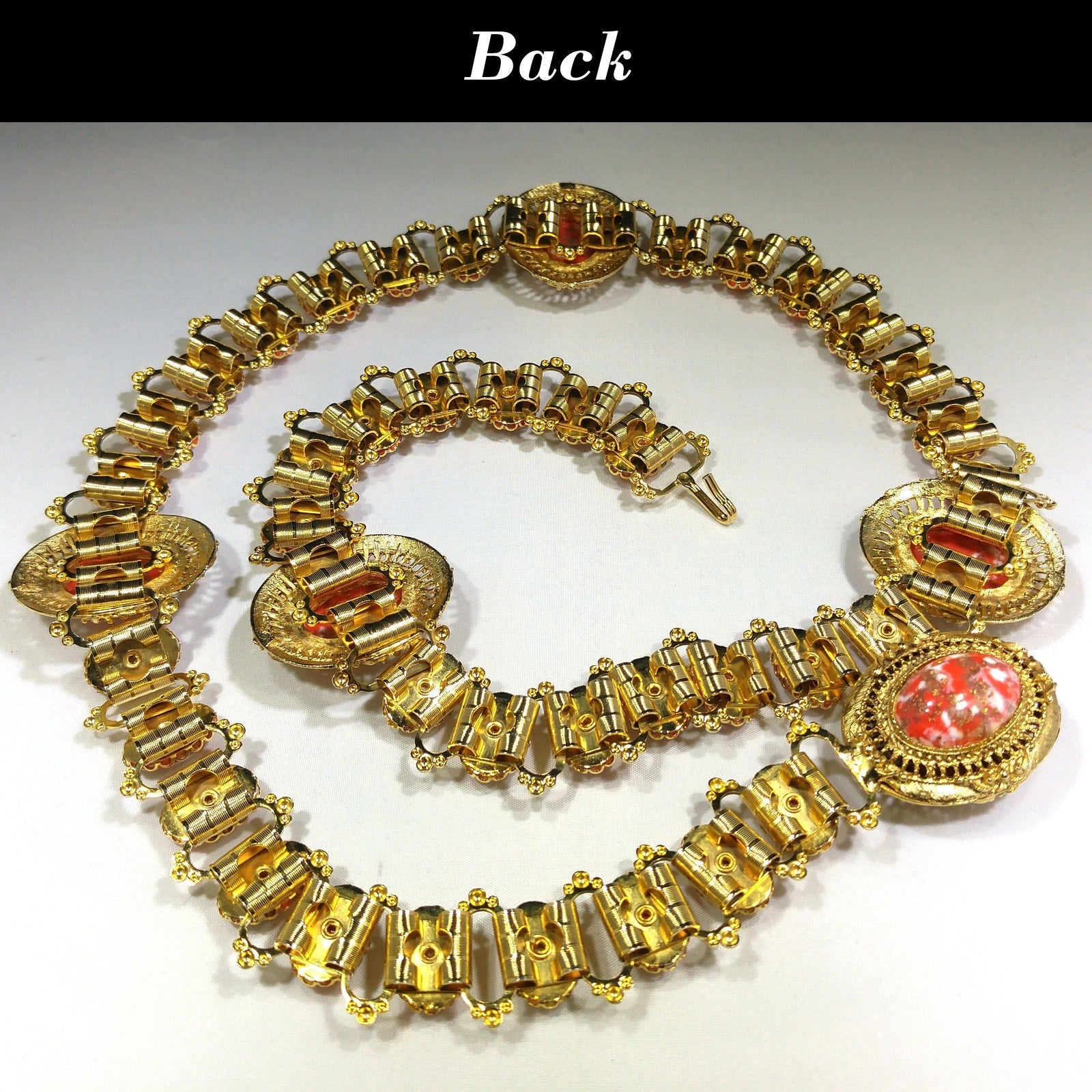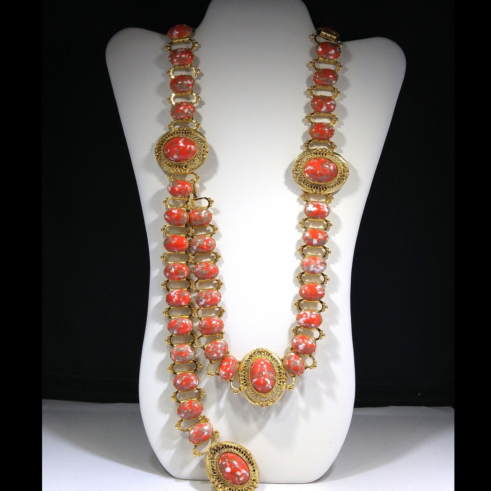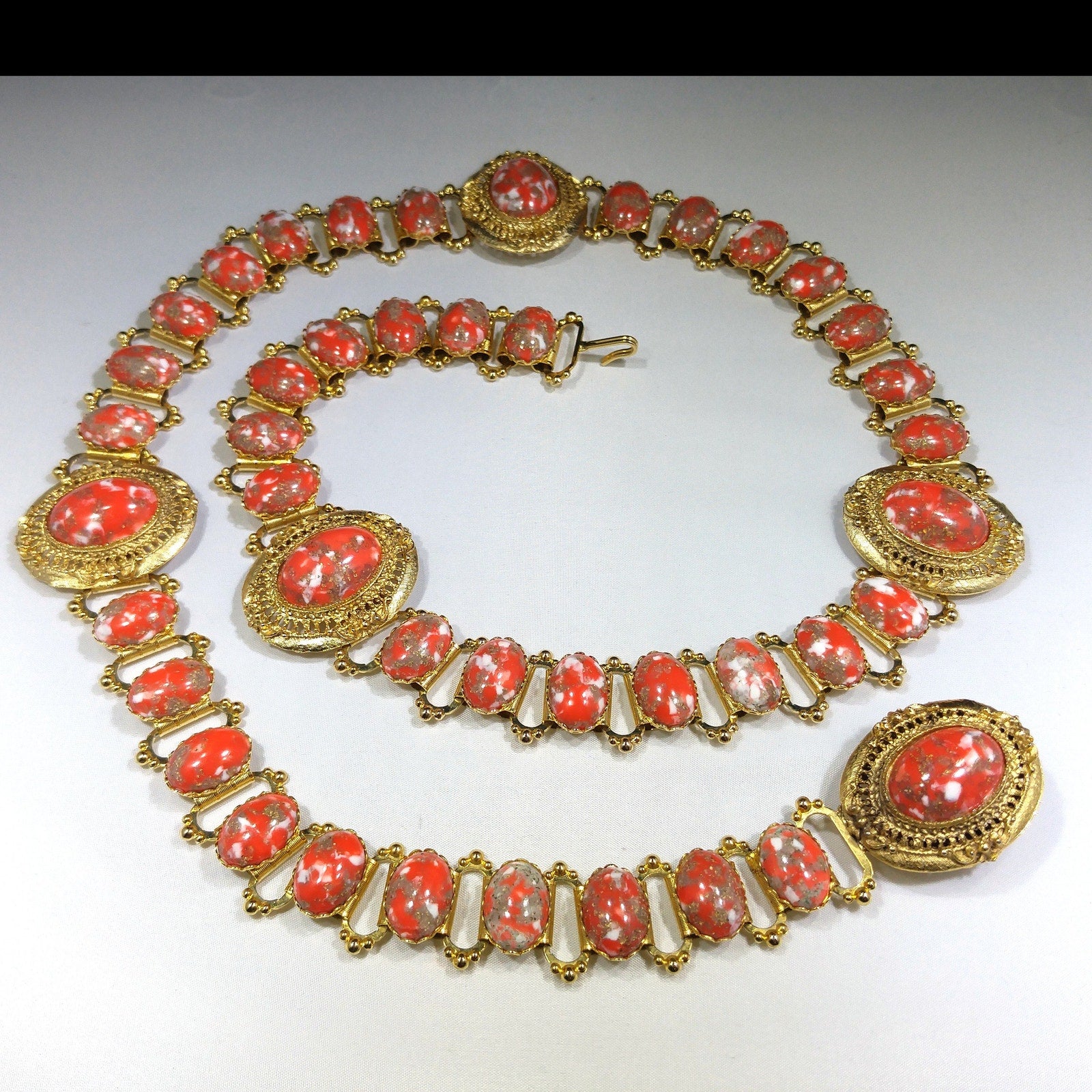 *Description: This is a beautiful mid-century book chain long necklace or belt with Lucite cabochons in orange, white, and gold from the 1950s to 1960s. There are five large filigree framed Lucite cabochon pendants along the necklace or belt and at one end. The belt or necklace is completely book chained with cabochons throughout the entire piece. This jewelry is very rare. Most of the belt looks new but there is a little wear on the last pendant on the opposite side of the hook clasp. Please review photos carefully. Due to the amount of book chain, the belt or necklace is substantial at 8.8 ounces. It is 36 inches of wearable length. If worn as a necklace, you could move the hook anywhere along the book chain to adjust the tail with the pendant on the end. The last pendant is design with a cabochon on both side. This is a rare runway piece and would be a great addition to your vintage jewelry collection or make a great vintage gift!