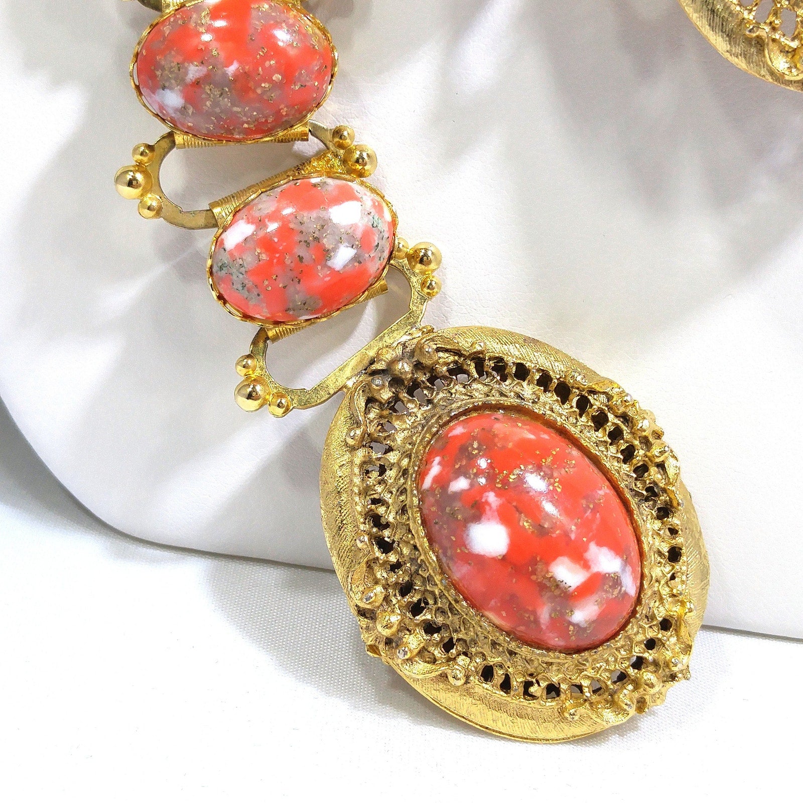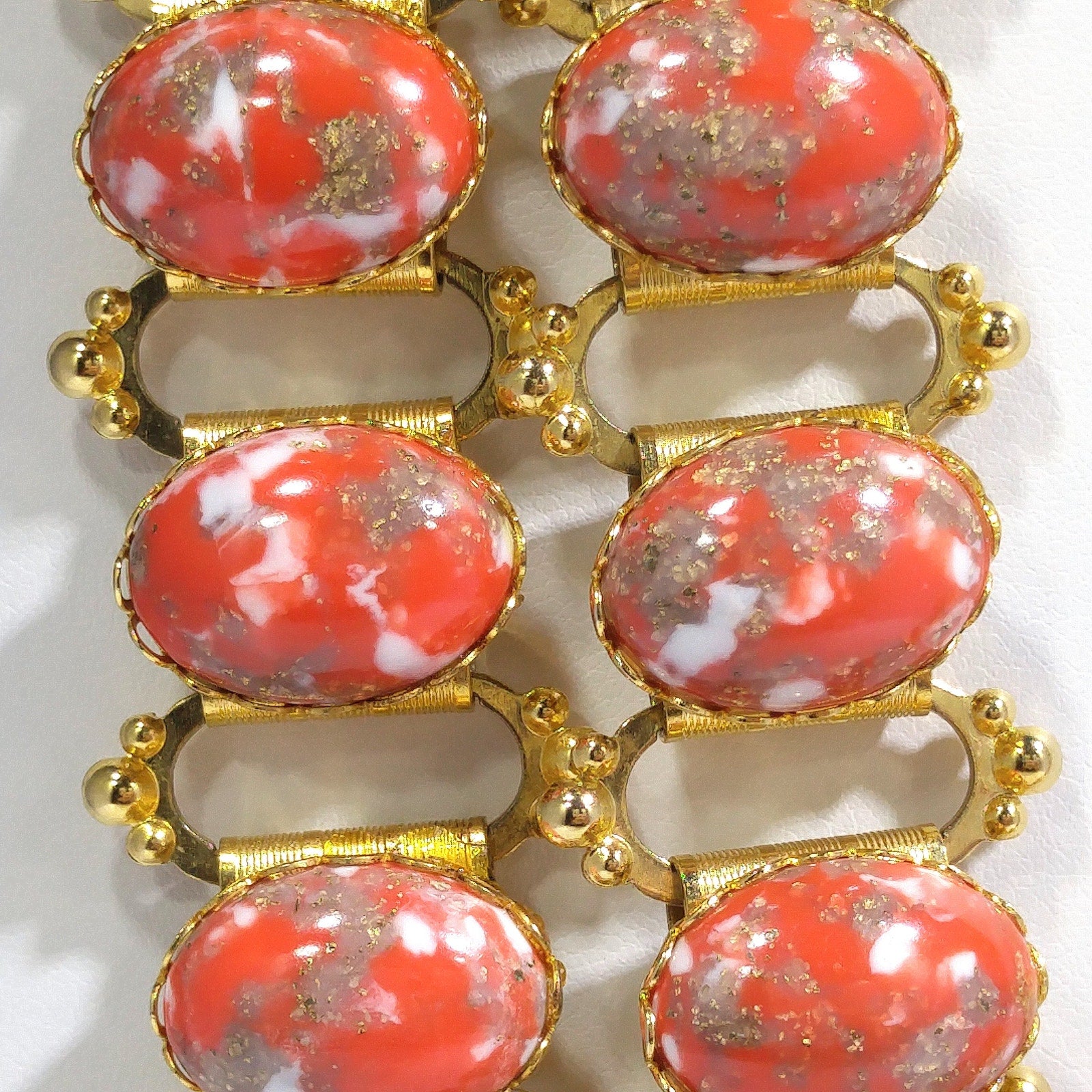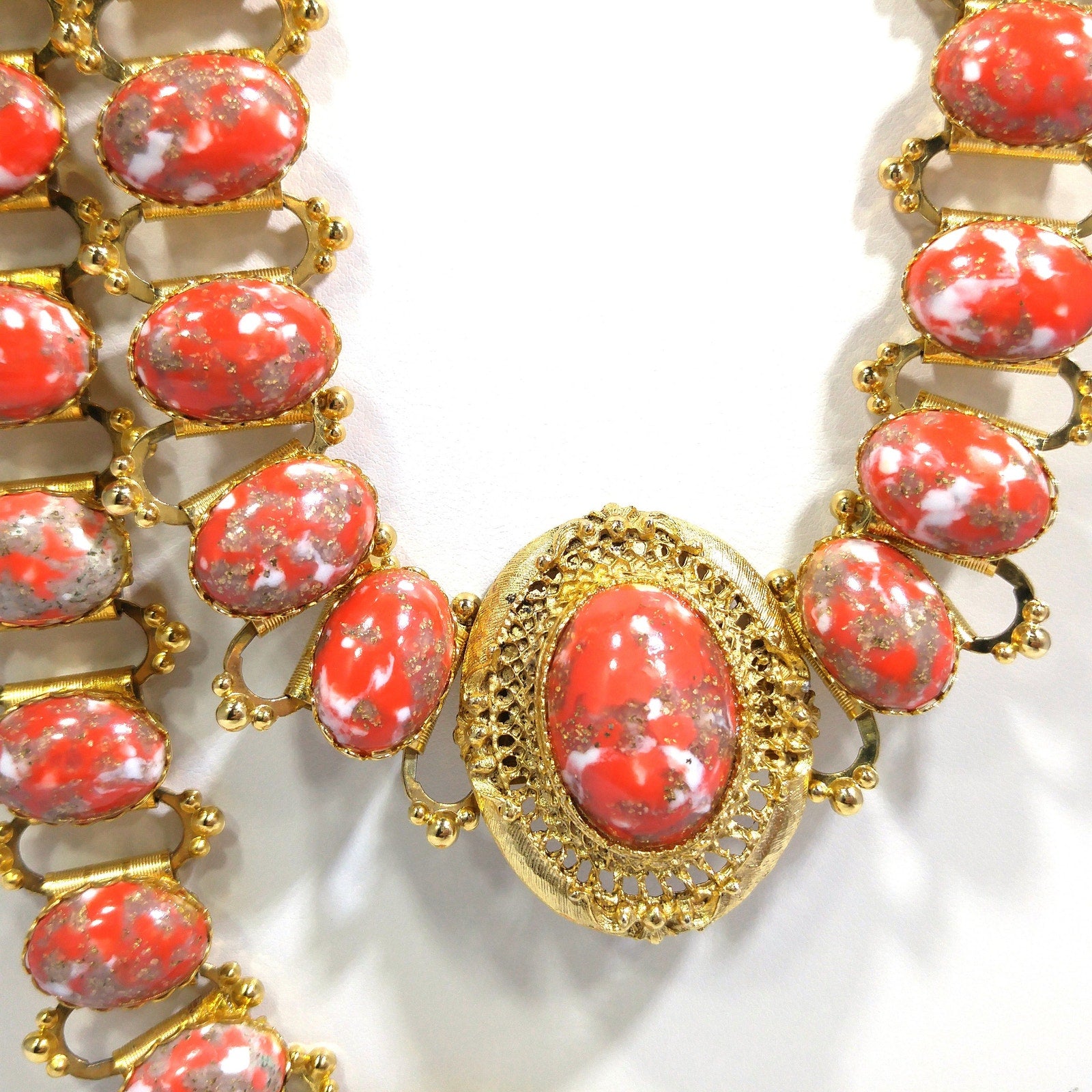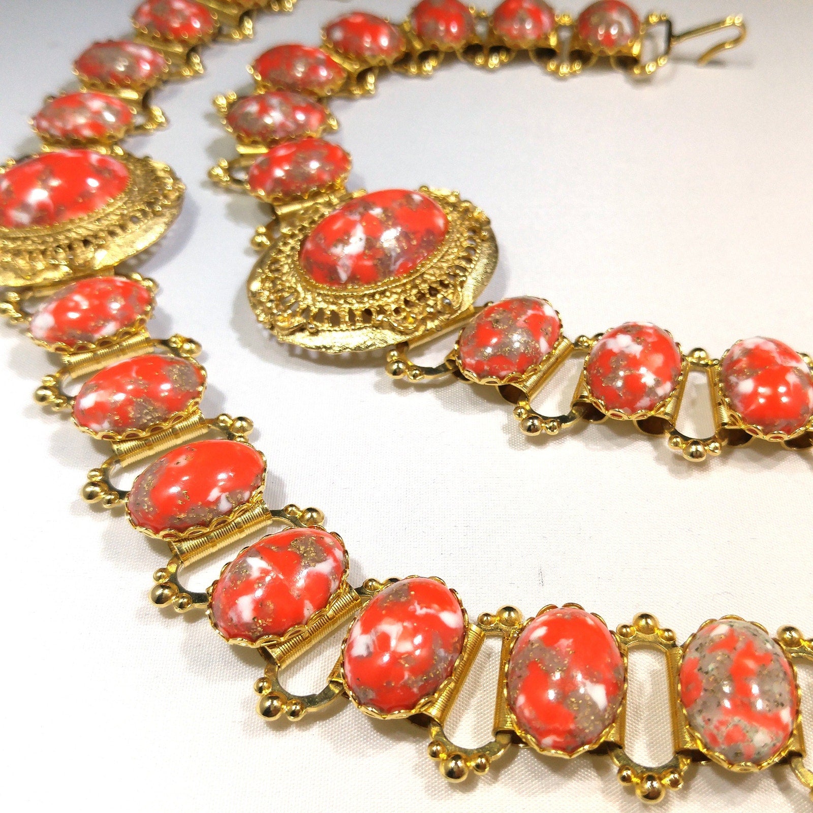 *Description: This is a beautiful mid-century book chain long necklace or belt with Lucite cabochons in orange, white, and gold from the 1950s to 1960s. There are five large filigree framed Lucite cabochon pendants along the necklace or belt and at one end. The belt or necklace is completely book chained with cabochons throughout the entire piece. This jewelry is very rare. Most of the belt looks new but there is a little wear on the last pendant on the opposite side of the hook clasp. Please review photos carefully. Due to the amount of book chain, the belt or necklace is substantial at 8.8 ounces. It is 36 inches of wearable length. If worn as a necklace, you could move the hook anywhere along the book chain to adjust the tail with the pendant on the end. The last pendant is design with a cabochon on both side. This is a rare runway piece and would be a great addition to your vintage jewelry collection or make a great vintage gift!