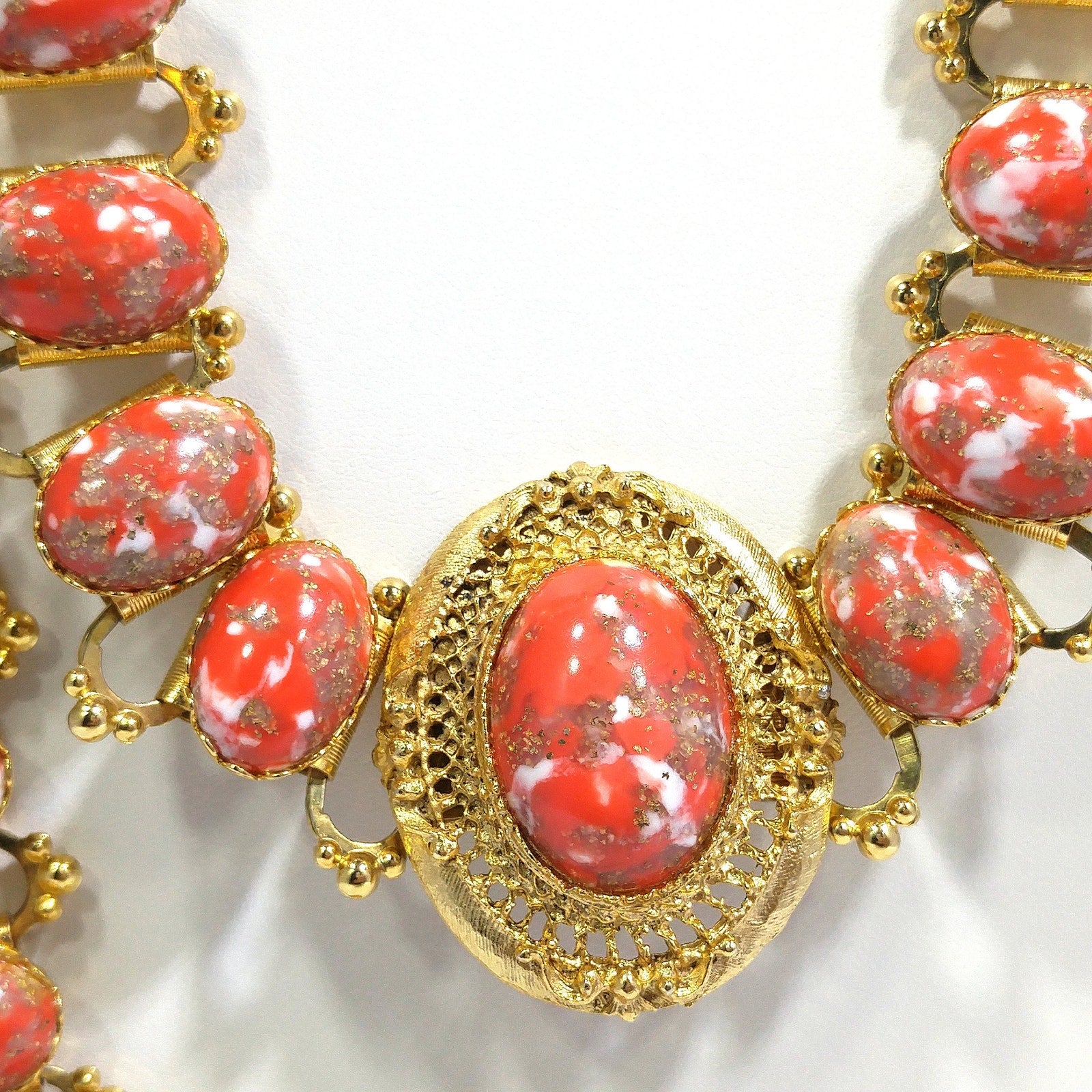 Book Chain Orange Gold Cabochon Lucite Belt or Long Necklace, Gold Robin's Egg Cabs, 36", 1960s Vintage Jewelry