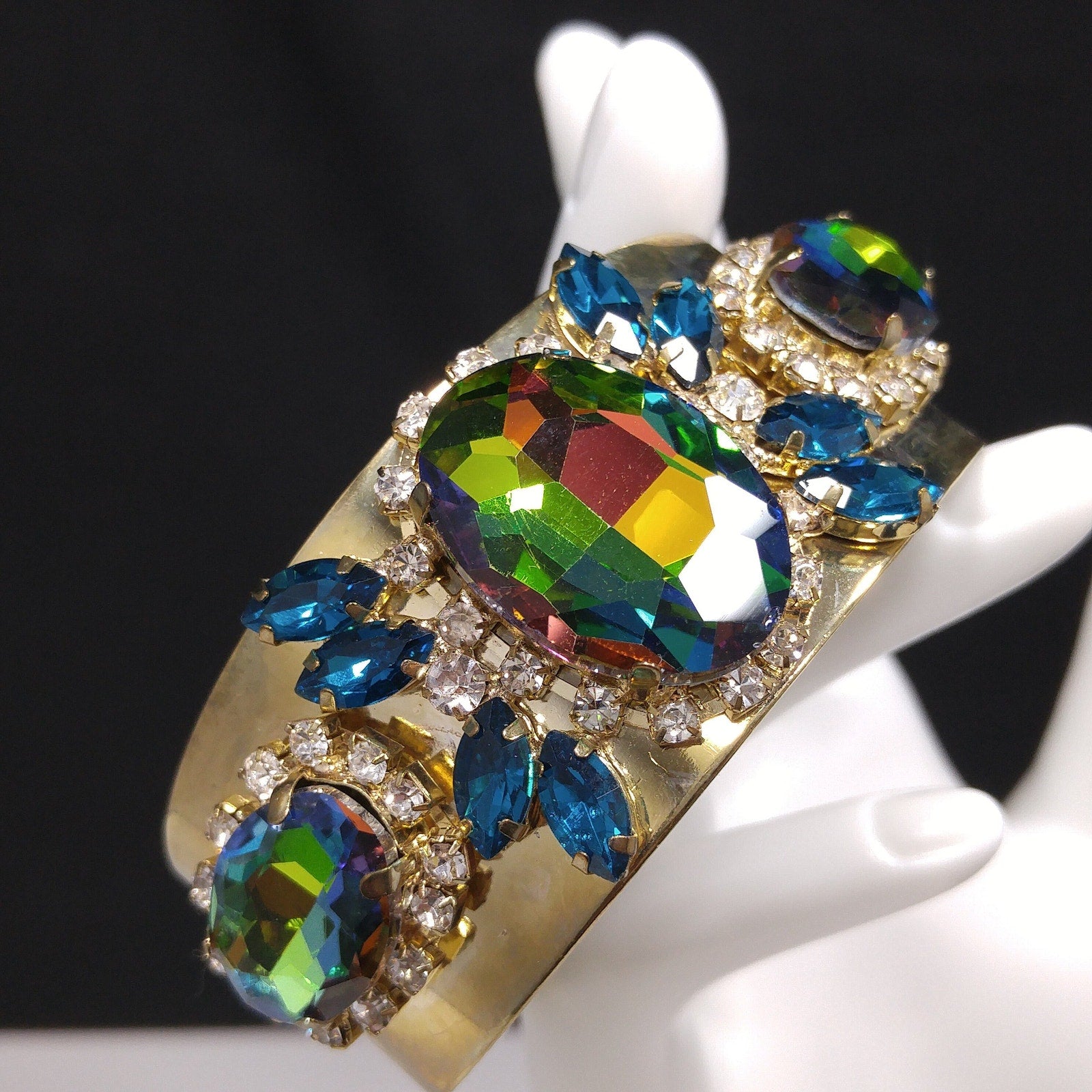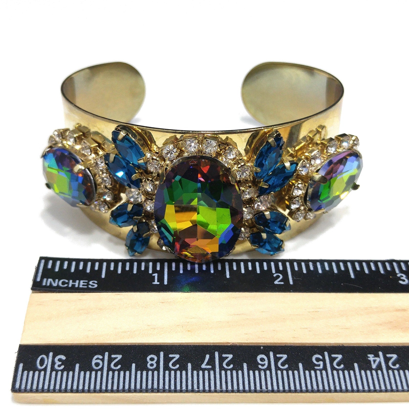 Brass Cuff Bracelet, Watermelon Crystal Rhinestones, Golden Brass, Clear & Sapphire Blue Rhinestones, Vintage Jewelry