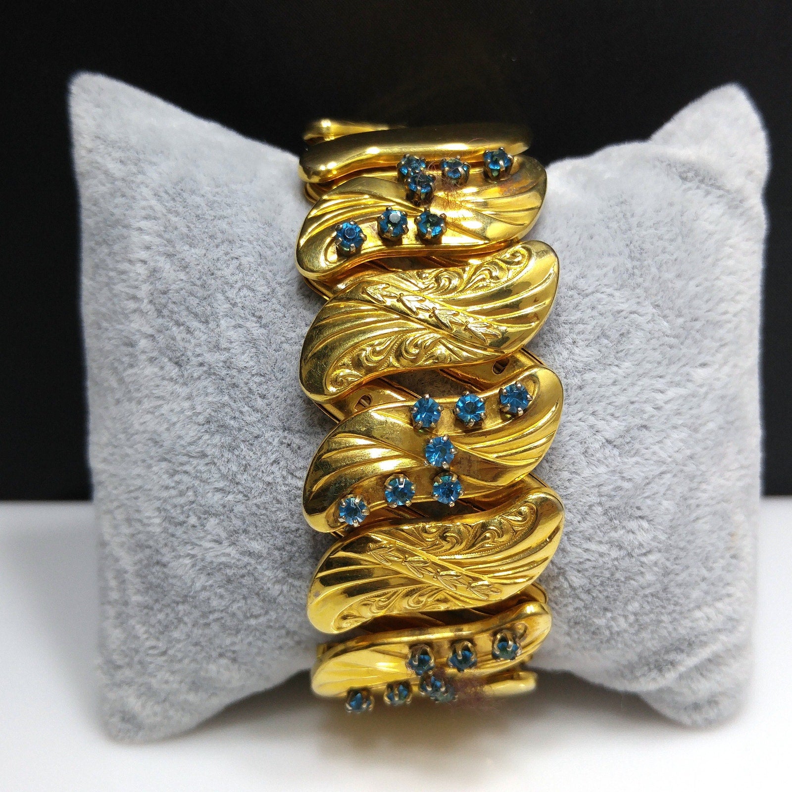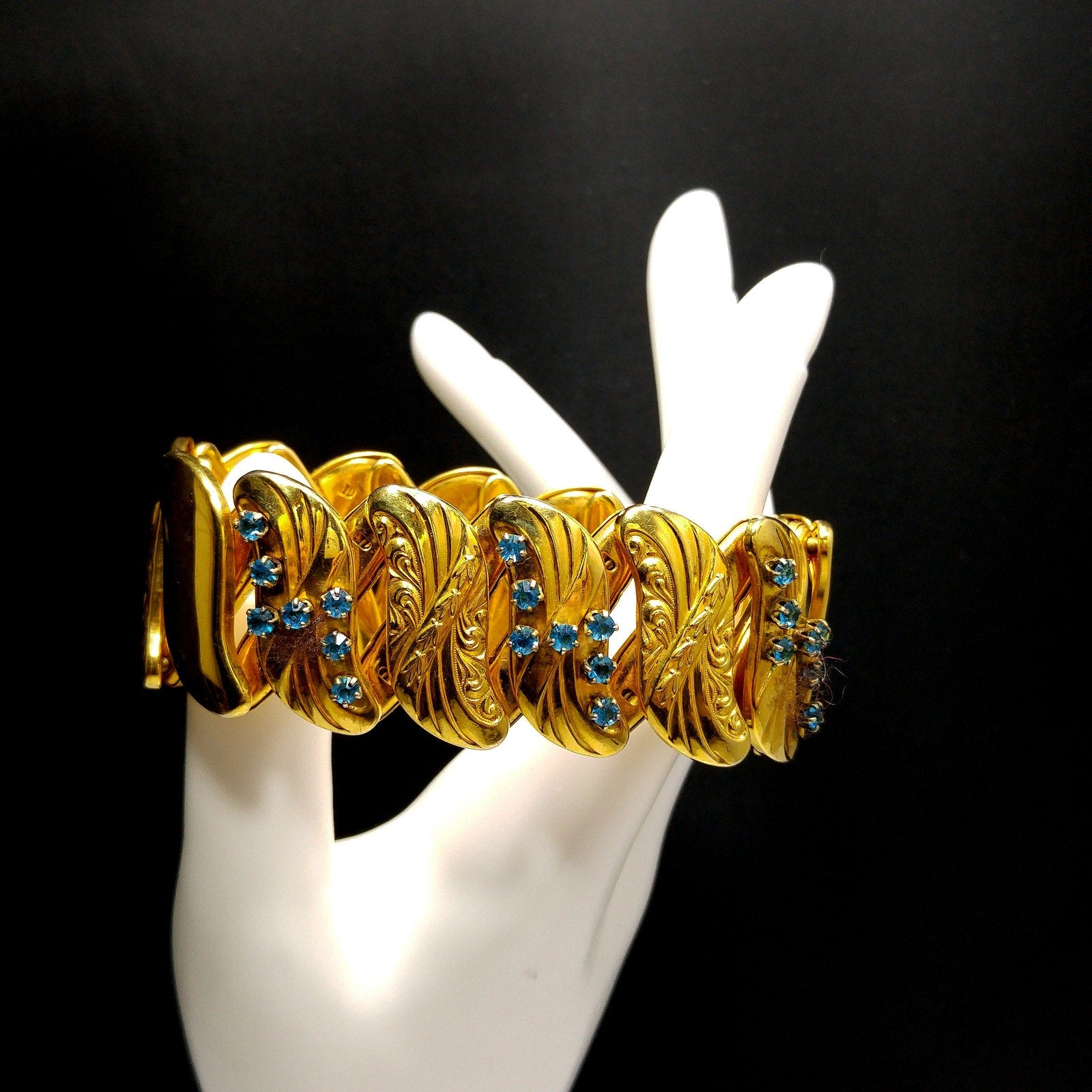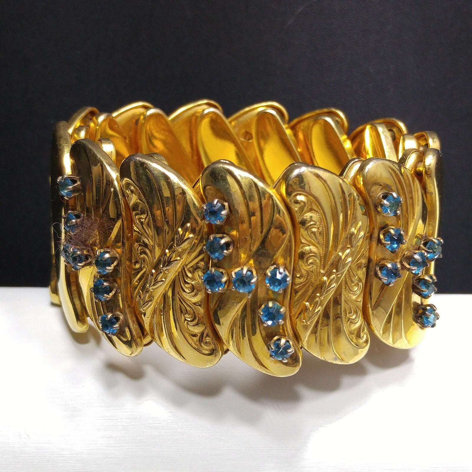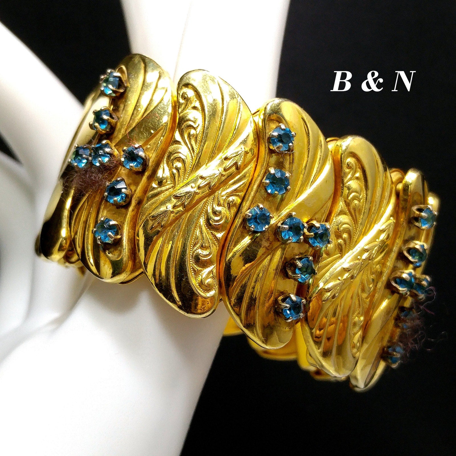 *Description: This is a beautiful expansion bracelet by Bugbee & Niles Company from the 1940s with turquoise prong set rhinestones on a gold plated base. This company actually began in 1859, however, most of their jewelry with the B&N hallmark was made after 1913. This bracelet had to have been in someone's jewelry box because it is in great condition. The hallmark is very small but if you look carefully, you can see it within the images posted. There are three links with turquoise rhinestones which are all prong set and in place. This particularly design was made with a variety of rhinestone colors. The actual links are smooth then floral, alternating design patterns within the bracelet. When left as is, the bracelet is 5 1/2 inches around the inside. It may be stretched to over 8 inches in length if needed. The width of the bracelet is 1 1/4 inches. This is a beautiful expansion bracelet and would be a great addition to your vintage jewelry collection or make a great vintage gift!