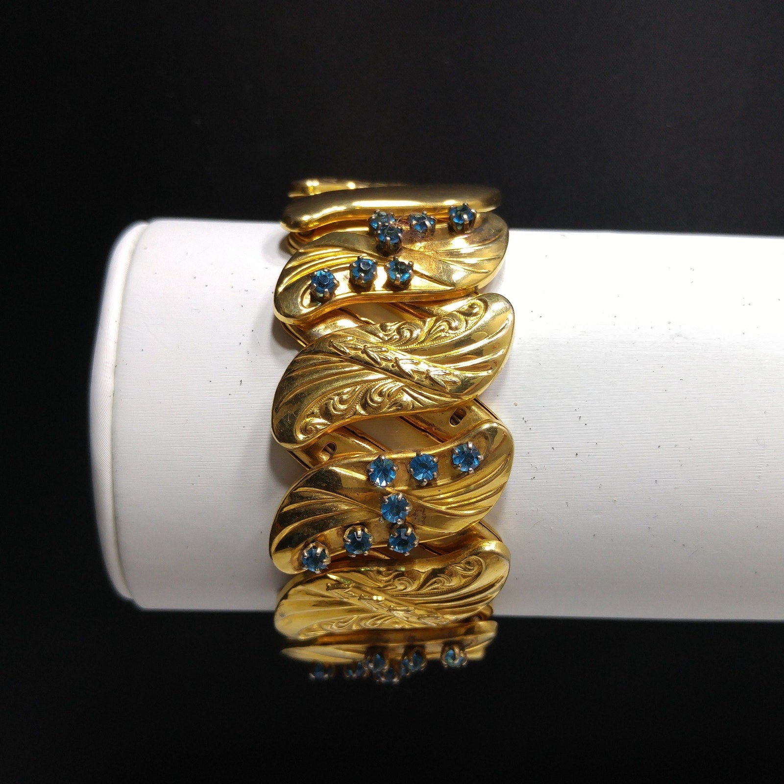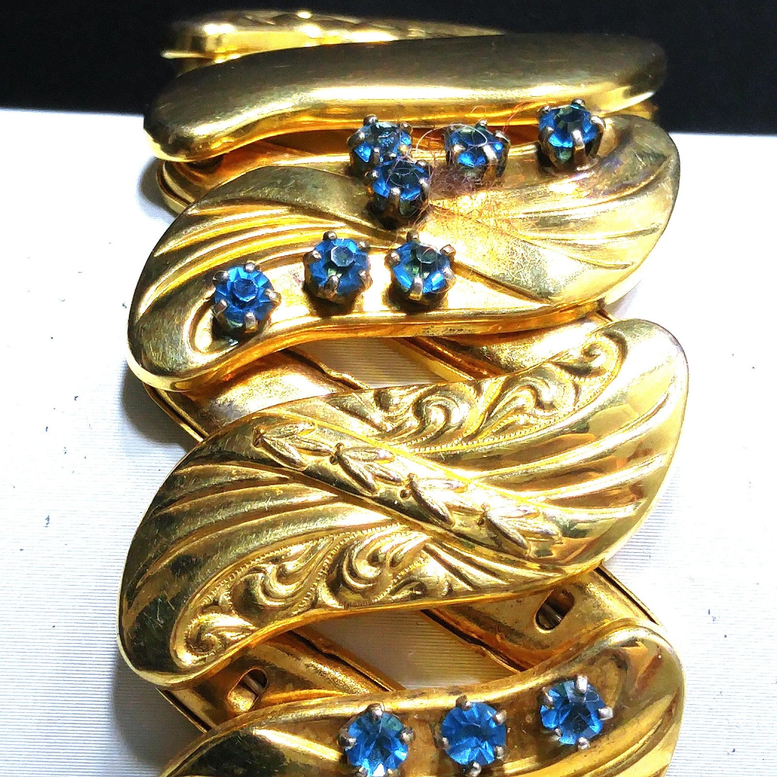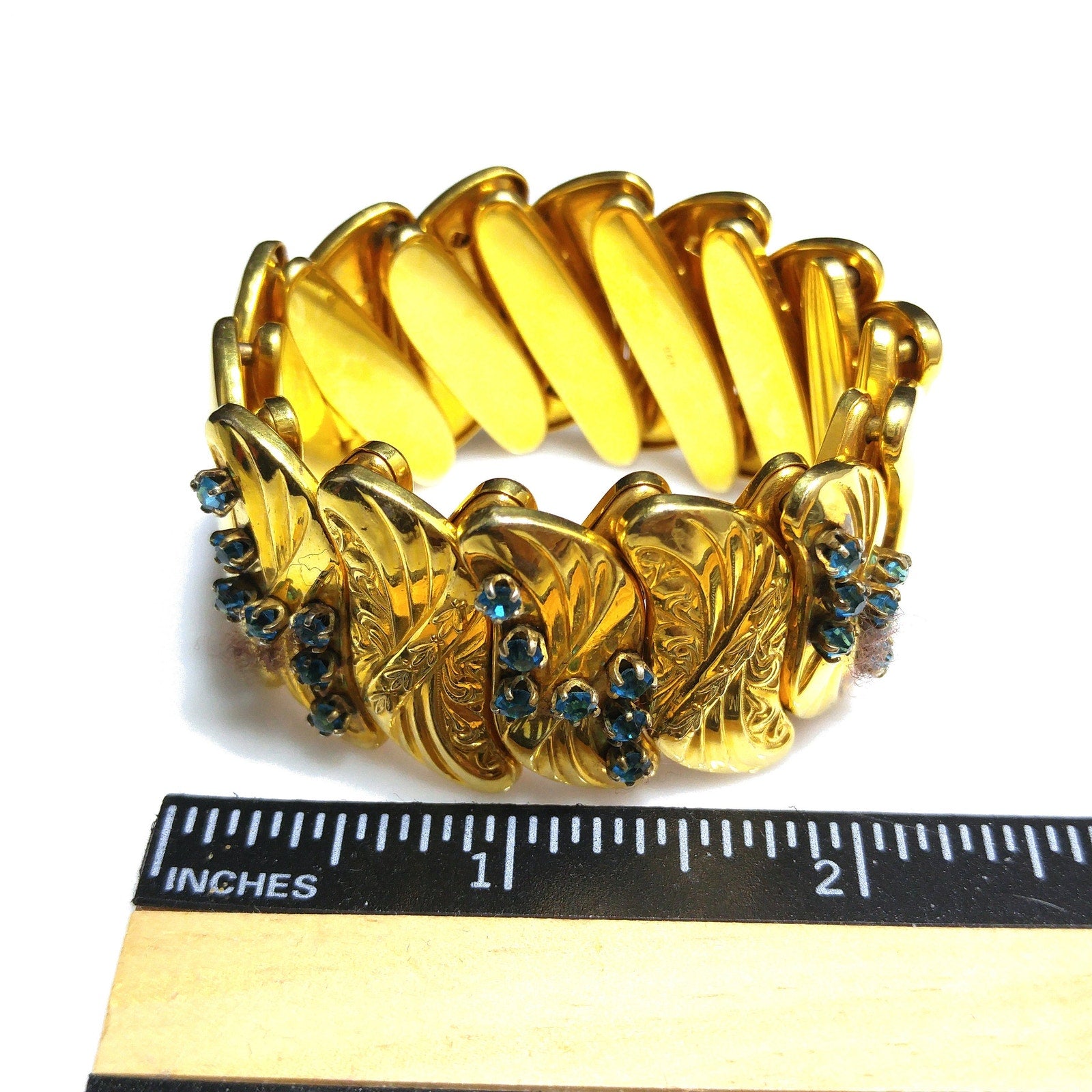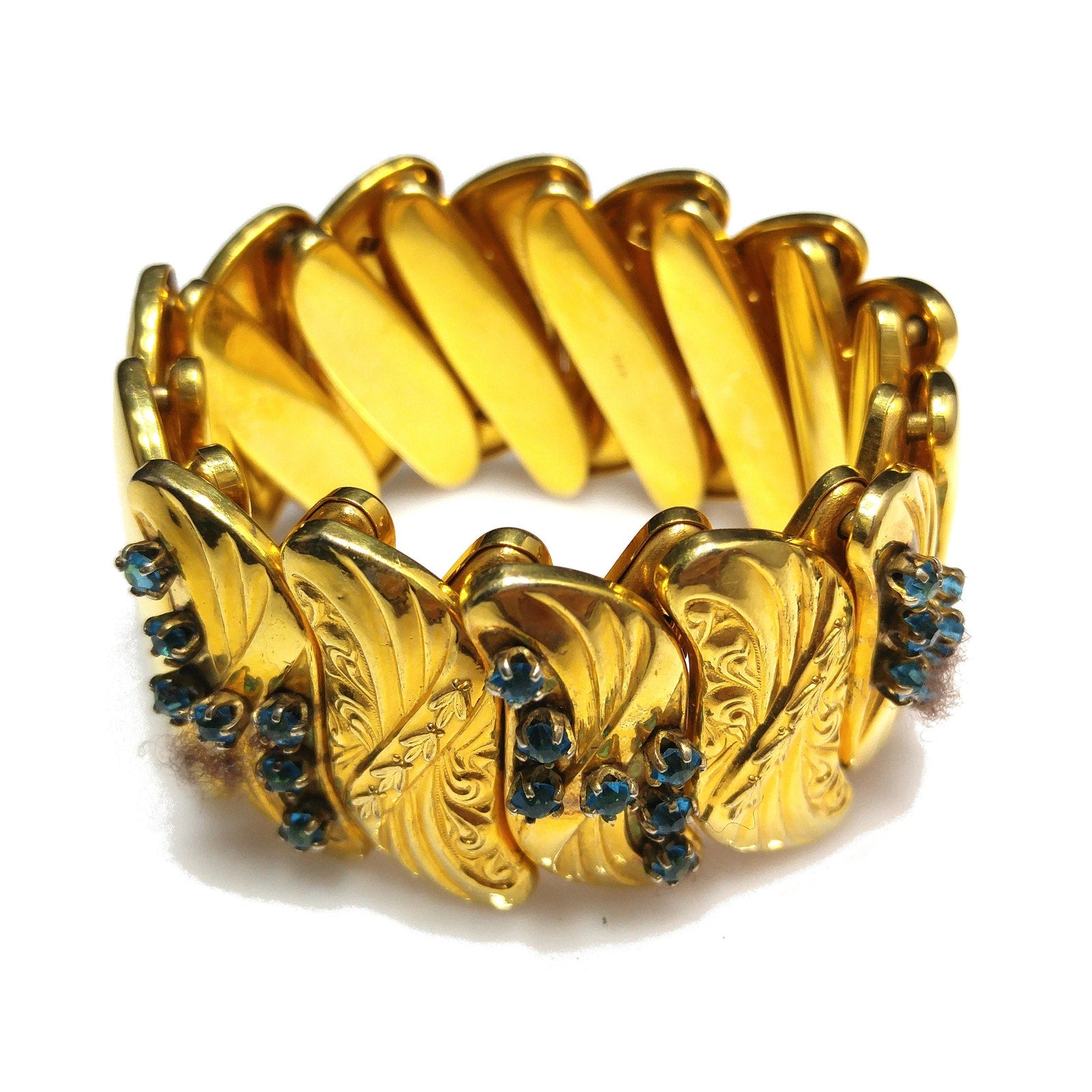 *Description: This is a beautiful expansion bracelet by Bugbee & Niles Company from the 1940s with turquoise prong set rhinestones on a gold plated base. This company actually began in 1859, however, most of their jewelry with the B&N hallmark was made after 1913. This bracelet had to have been in someone's jewelry box because it is in great condition. The hallmark is very small but if you look carefully, you can see it within the images posted. There are three links with turquoise rhinestones which are all prong set and in place. This particularly design was made with a variety of rhinestone colors. The actual links are smooth then floral, alternating design patterns within the bracelet. When left as is, the bracelet is 5 1/2 inches around the inside. It may be stretched to over 8 inches in length if needed. The width of the bracelet is 1 1/4 inches. This is a beautiful expansion bracelet and would be a great addition to your vintage jewelry collection or make a great vintage gift!