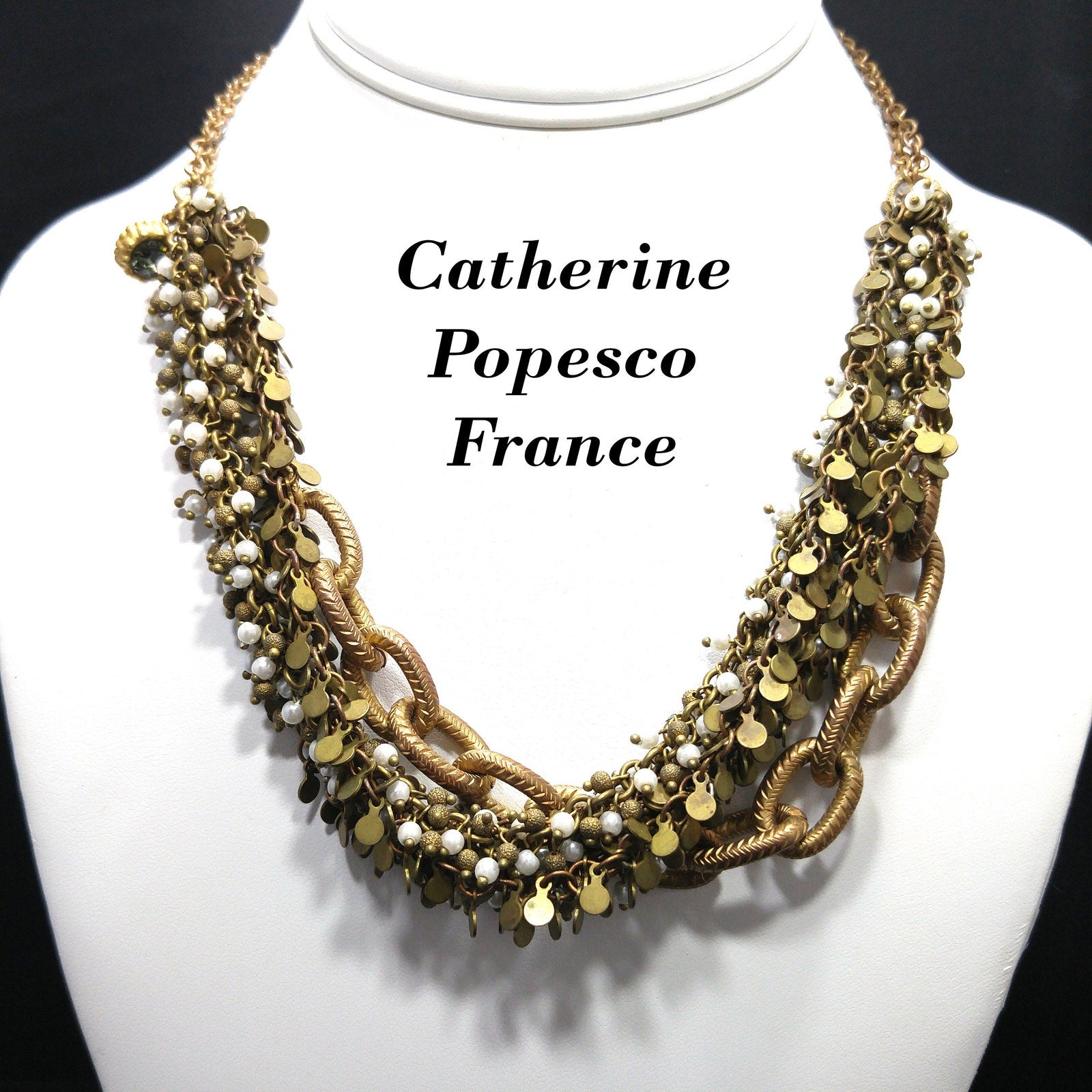 This is a striking vintage Catherine Popesco of France statement necklace from the 1990s. The design features five strands of varied gold-tone chains accented with faux pearls and tiny discs, creating a bold layered effect. A large crystal rhinestone dangle on one side adds a touch of sparkle and elegance. The necklace includes a hang tag marked Catherine Popesco, France near the clasp.