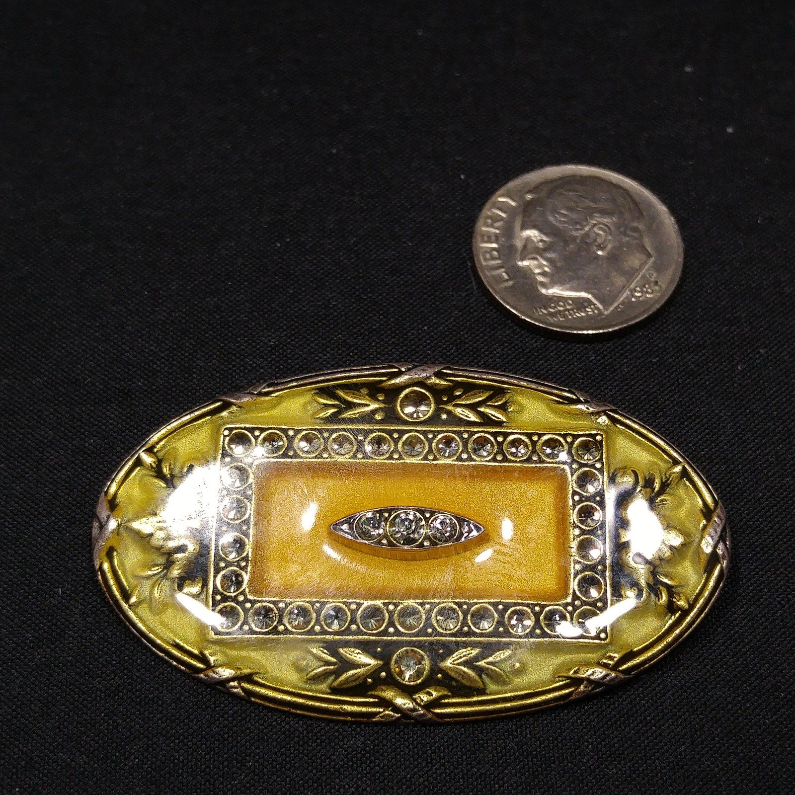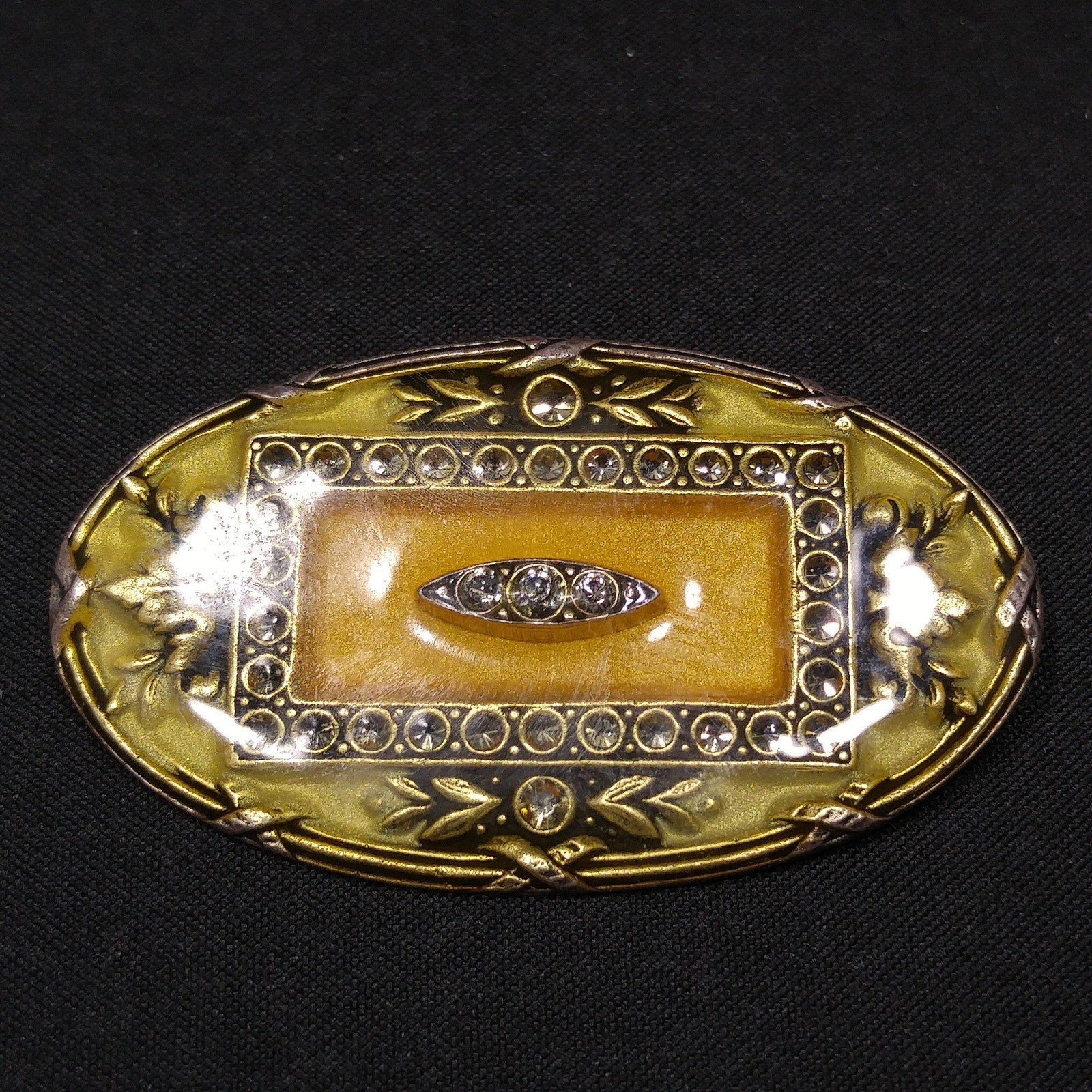 This is a beautiful Catherine Popesco brooch from the 1980s, crafted in her iconic Art Deco revival style. The oval brooch features a soft cream enamel center with darker gold enamel accents, highlighted by sparkling rhinestones set securely under a layer of clear enamel. This unique technique ensures the stones never loosen or fall out, preserving the integrity of the design for years to come.