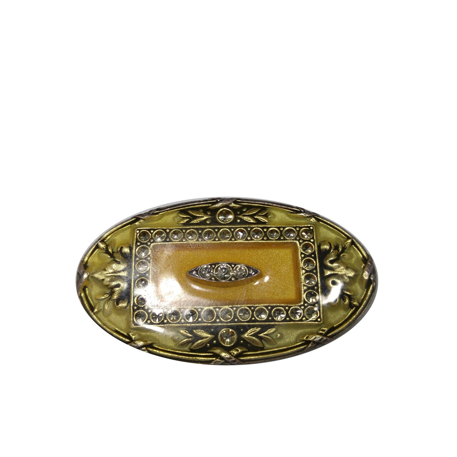 Catherine Popesco Oval Brooch, Cream & Gold Enamel, Rhinestones Under Enamel, France, 1980s Vintage Jewelry