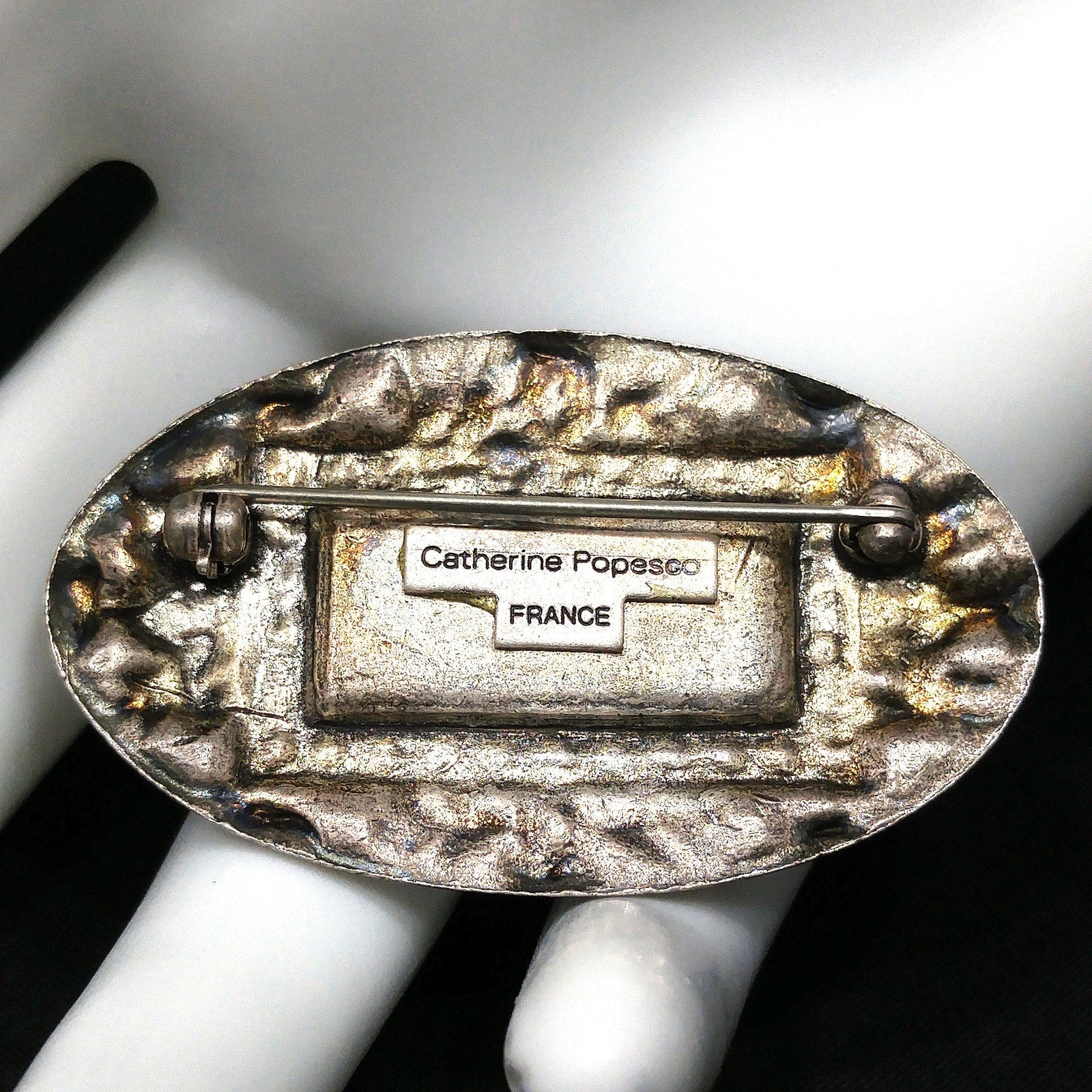 Catherine Popesco’s jewelry is highly collectible as it is made from original French Art Deco molds (1900–1930), discovered in Paris and revived through her designs. The gold-plated floral and geometric detailing surrounding the enamel captures the elegance of early 20th-century French jewelry.