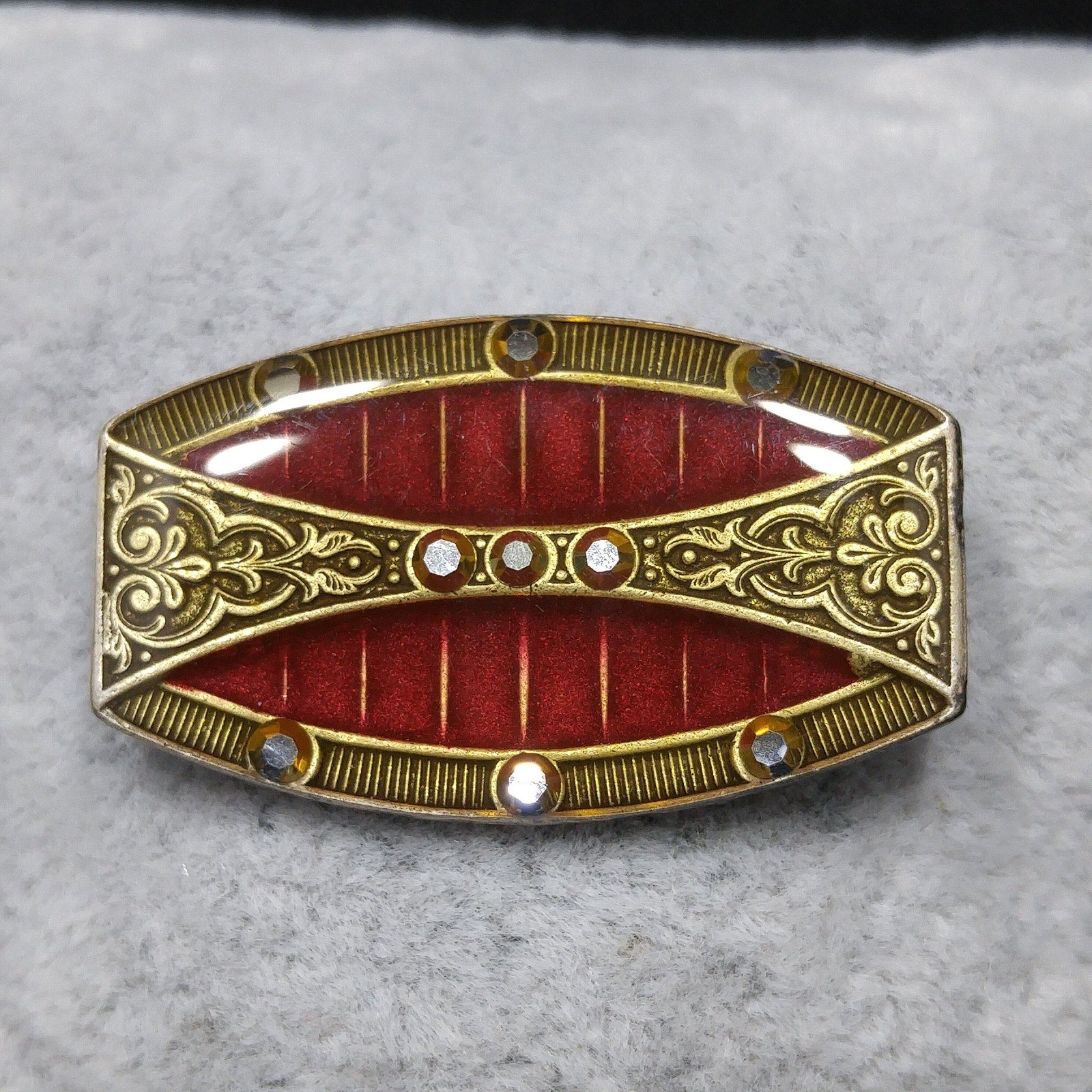 This smaller-sized brooch makes it versatile for frequent wear while still standing out with its bold red and gold Art Deco style. A wonderful addition to any vintage jewelry collection or an elegant gift.