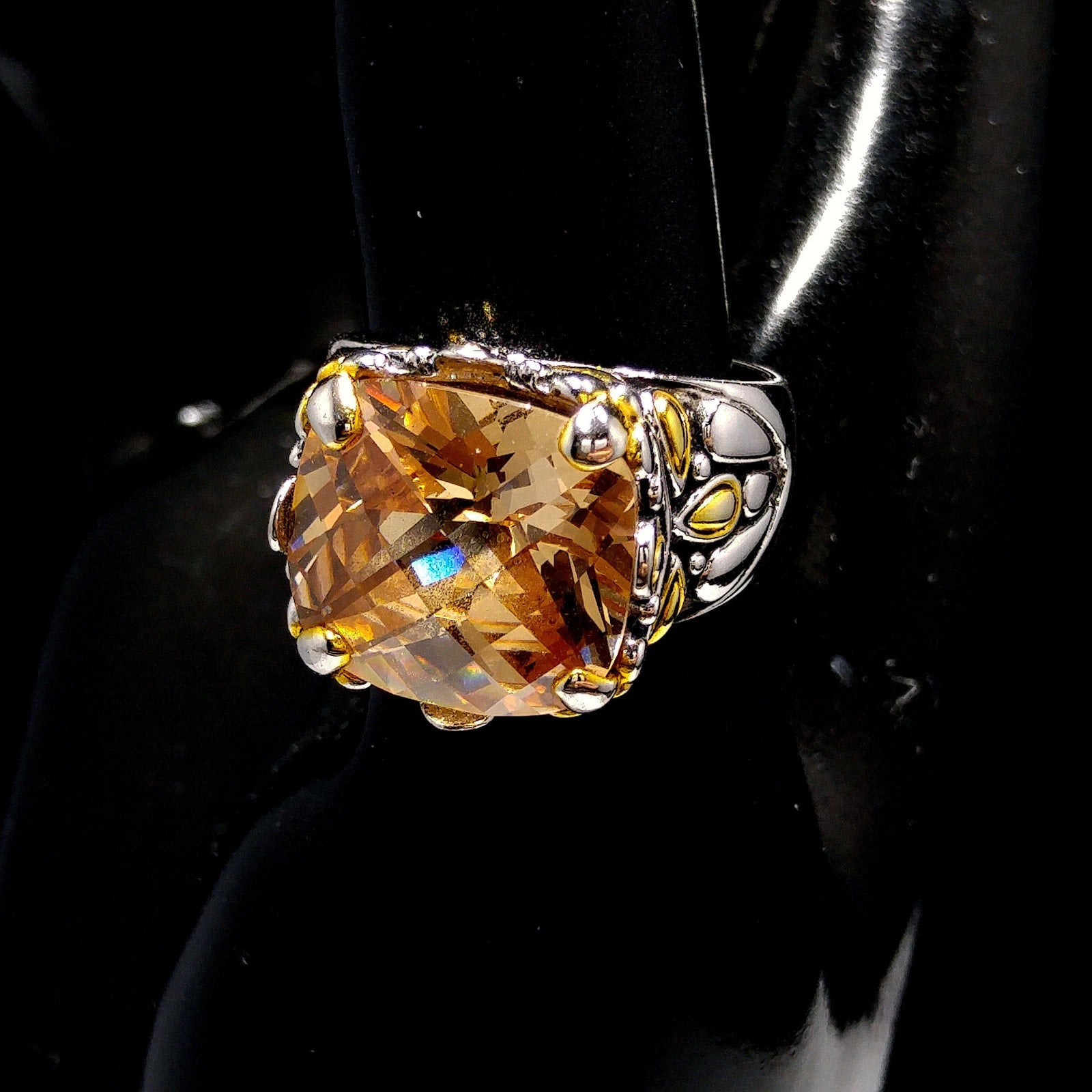 The gemstone is prong-set in a raised, open-back setting and measures approximately 14mm x 15mm across the top. The band is silver tone with intricate gold tone embellishments on each side, creating a two-tone design with bold detail.