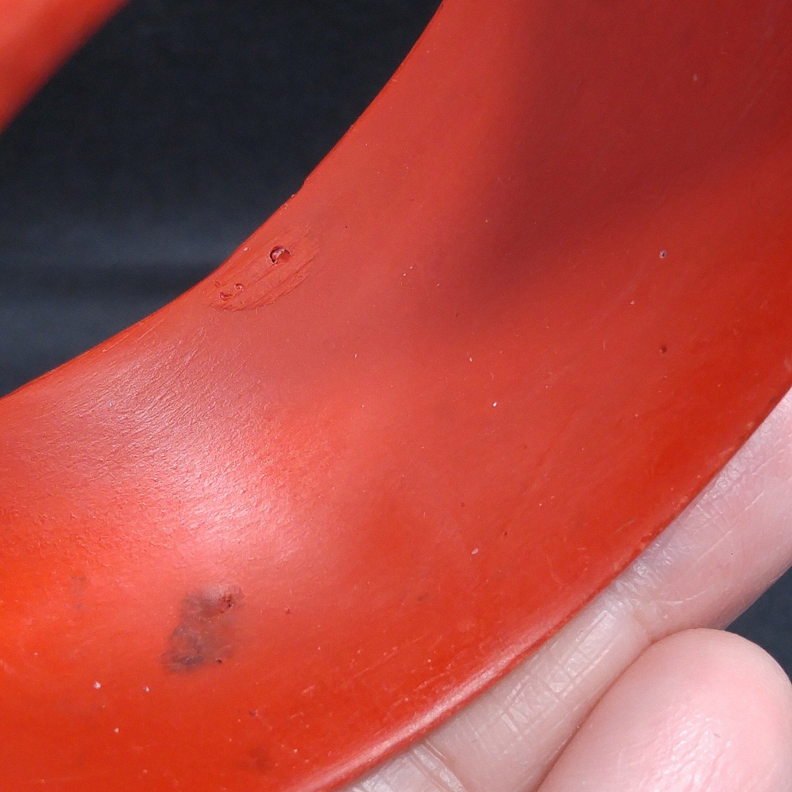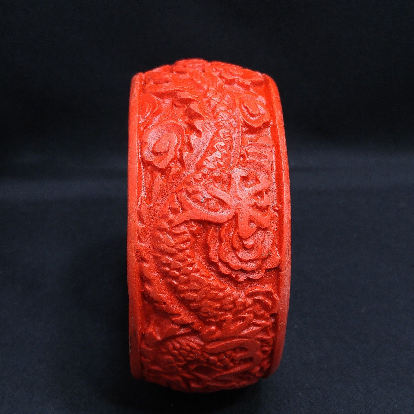 *Description: Beautiful vintage Asian dragon carved on a wide bracelet from the 1960s or earlier. While the original mercury-based pigment, the original cinnabar, was toxic to humans, more modern cinnabar jewelry uses a resin-based polymer instead. This is more of a modern bracelet from the 40s through the 60s.