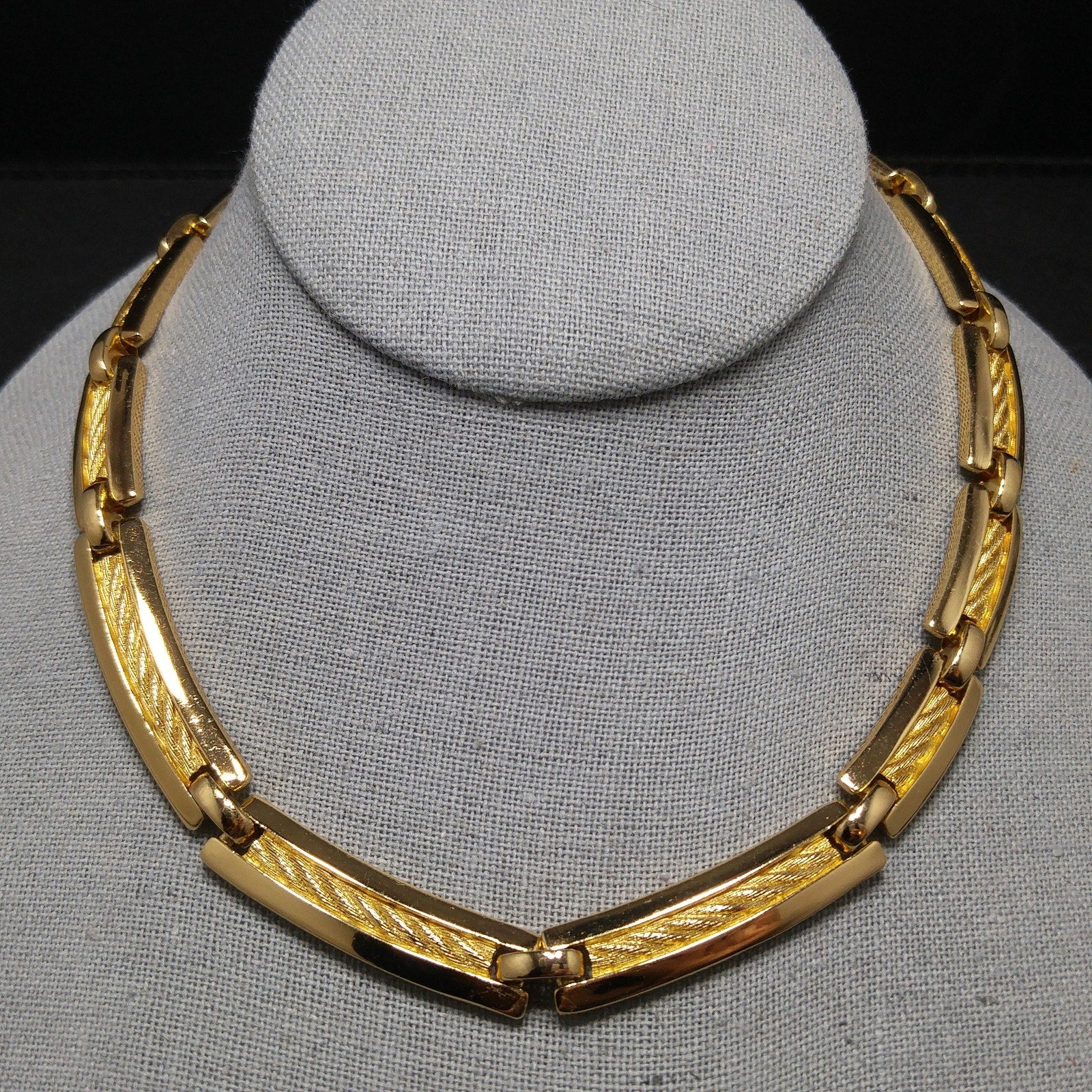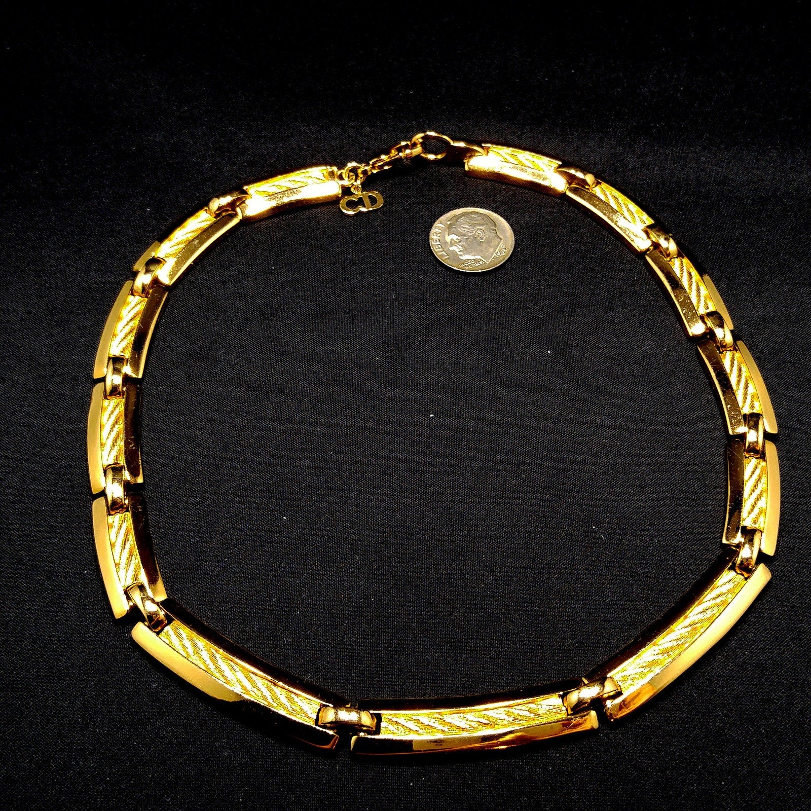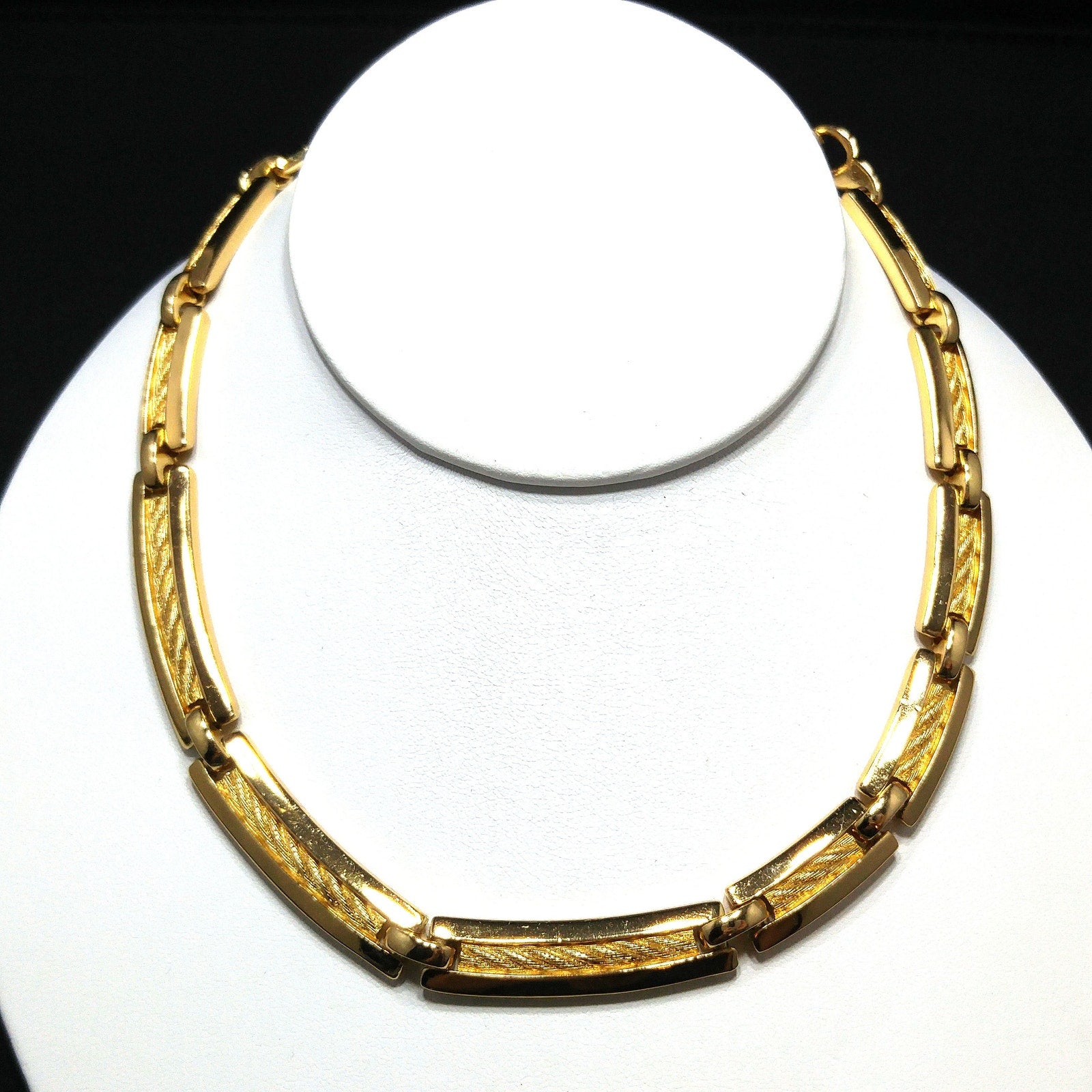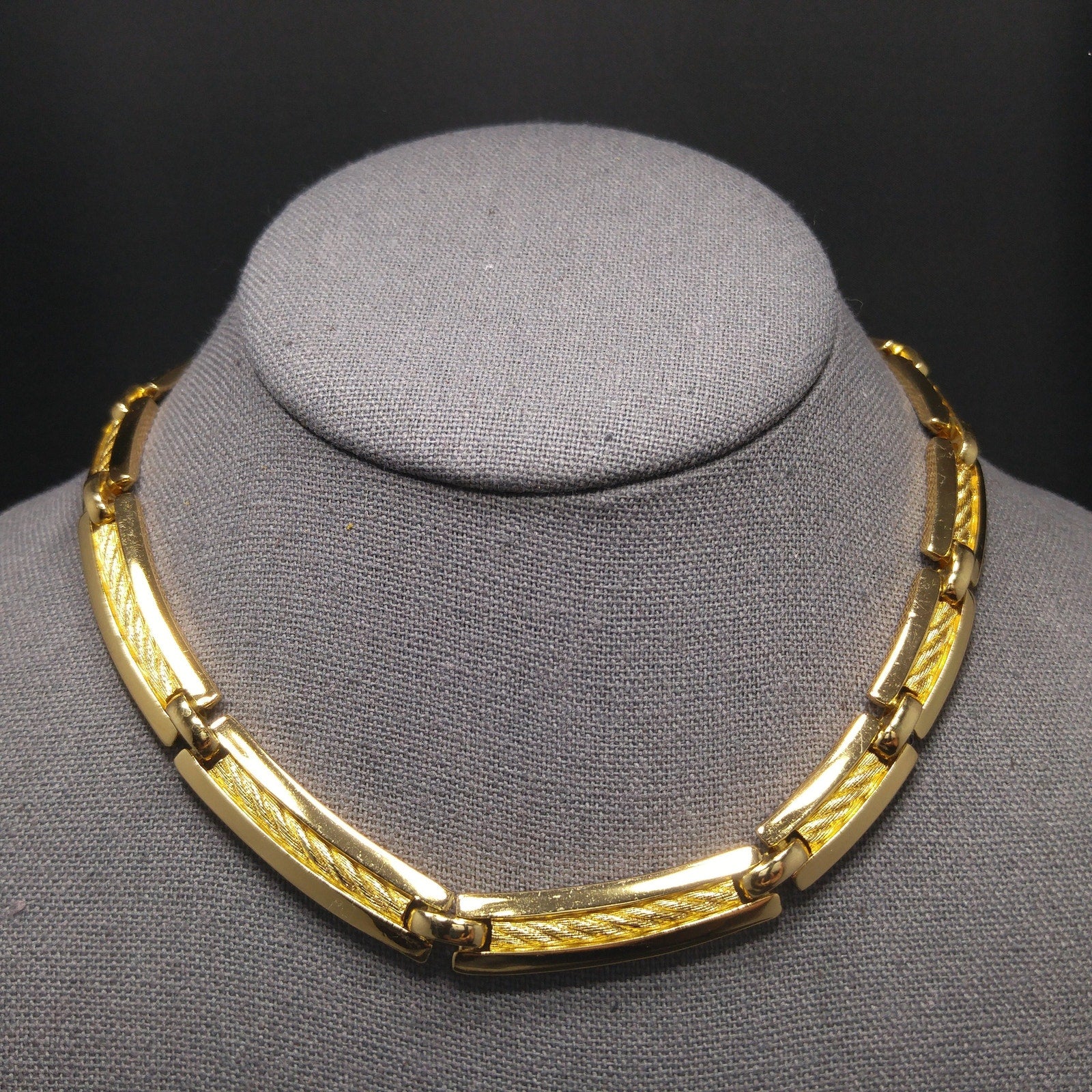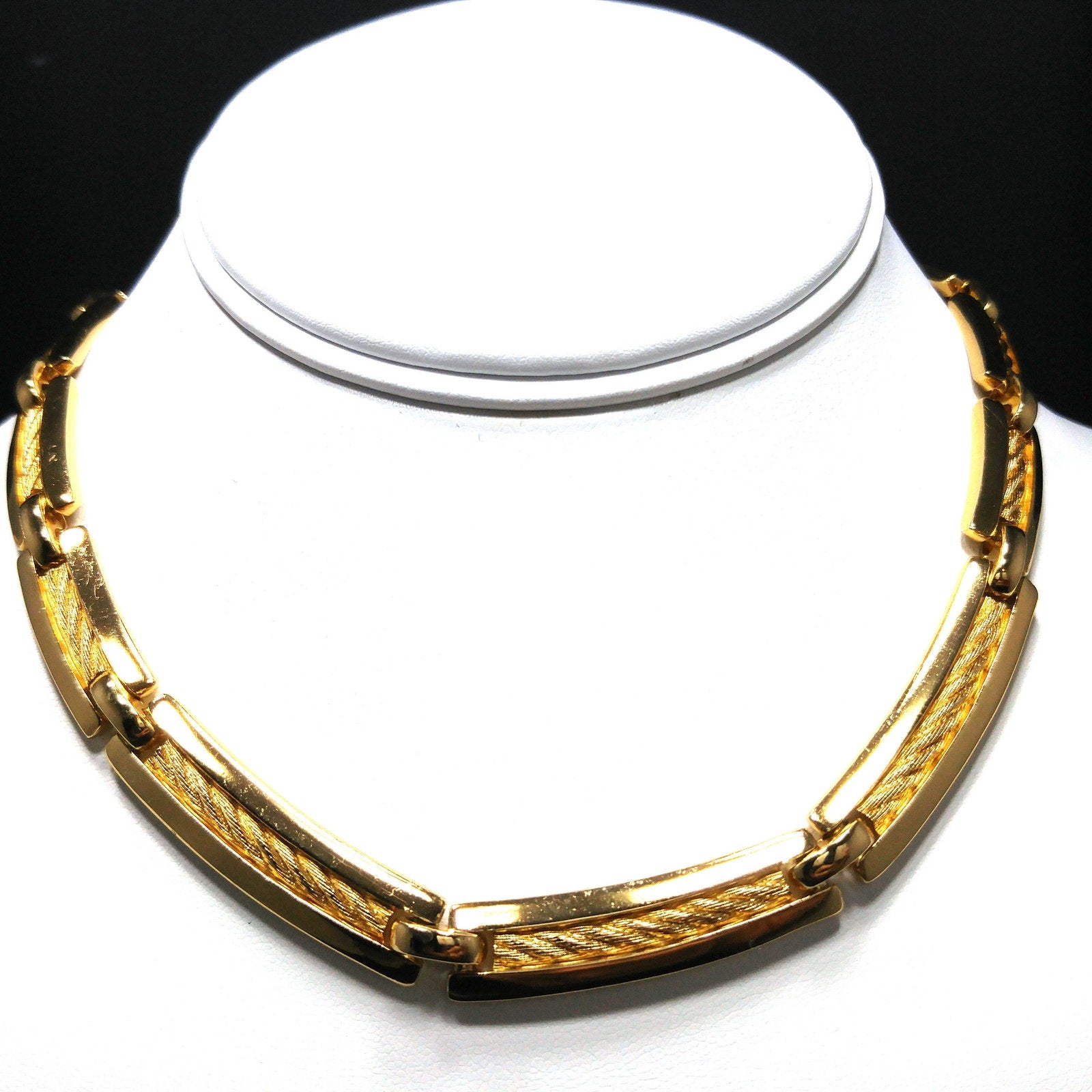 This is a stunning vintage Christian Dior gold plated link choker necklace from the 1980s. The elegant design features links with textured rope inlay framed by smooth polished gold sides. The links graduate slightly in size, creating a refined, balanced shape with the largest at the front.