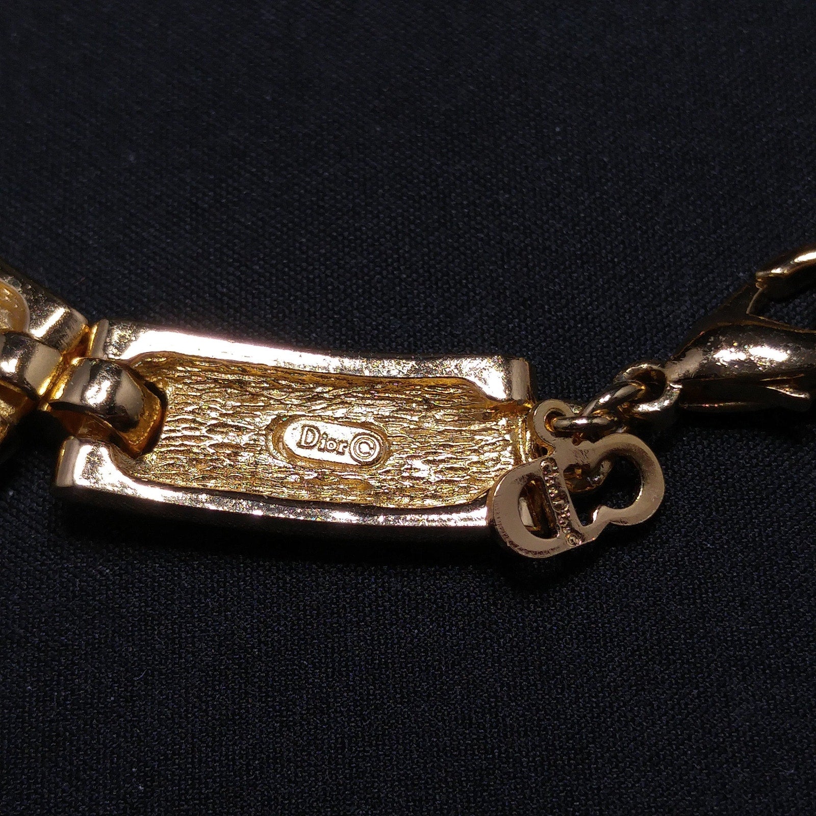 The necklace includes a CD hang tag marked Chr. Dior on one side and a Dior-stamped link with copyright mark near the clasp. It closes securely with a lobster claw clasp and carries the signature sophistication of Dior’s vintage design era.