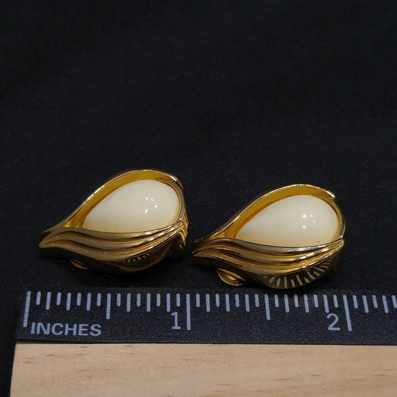 *Description: This is a beautiful pair of Christian Dior gold plated, white teardrop cabochon earrings from the 1980s. The earrings are marked CHR. DIOR on the back of each clip with a Pat number, 273349_, last number unreadable, at the tip of each earring clip. The earrings remind me of a white rose bud or flower bud wrapped in gold plated leaves. I tested the surface metal and it tested at 18K gold plate. This designer pair of vintage earrings would be a great addition to your vintage jewelry collection or make a great vintage gift!