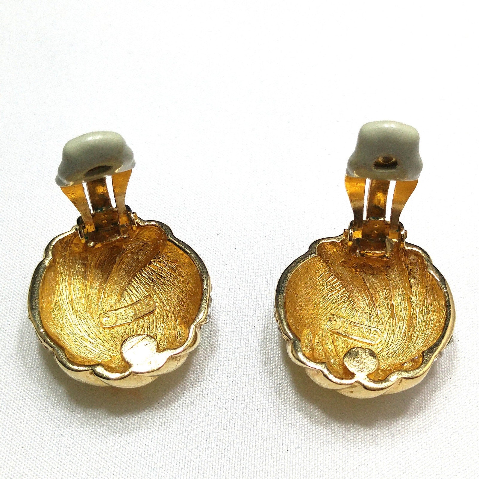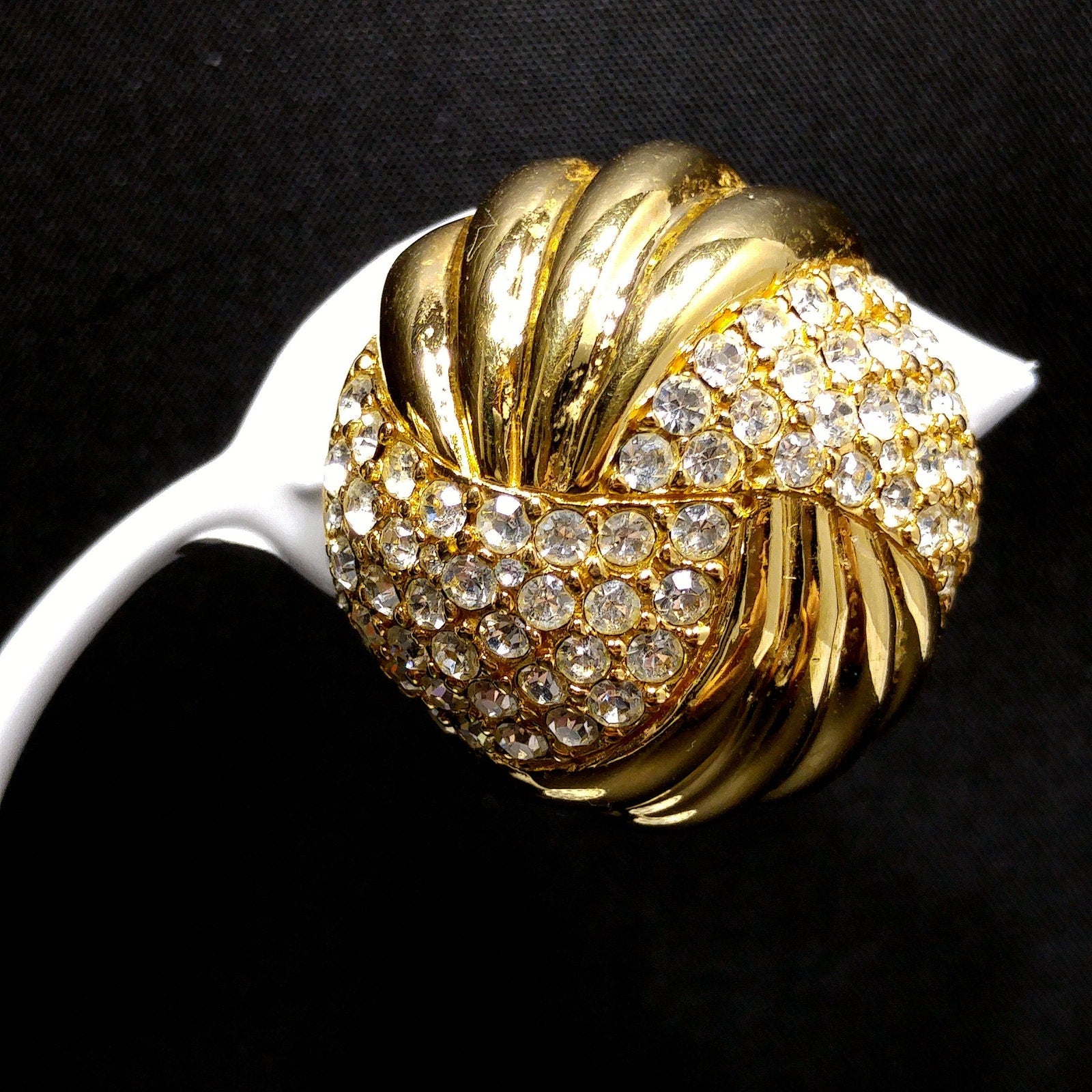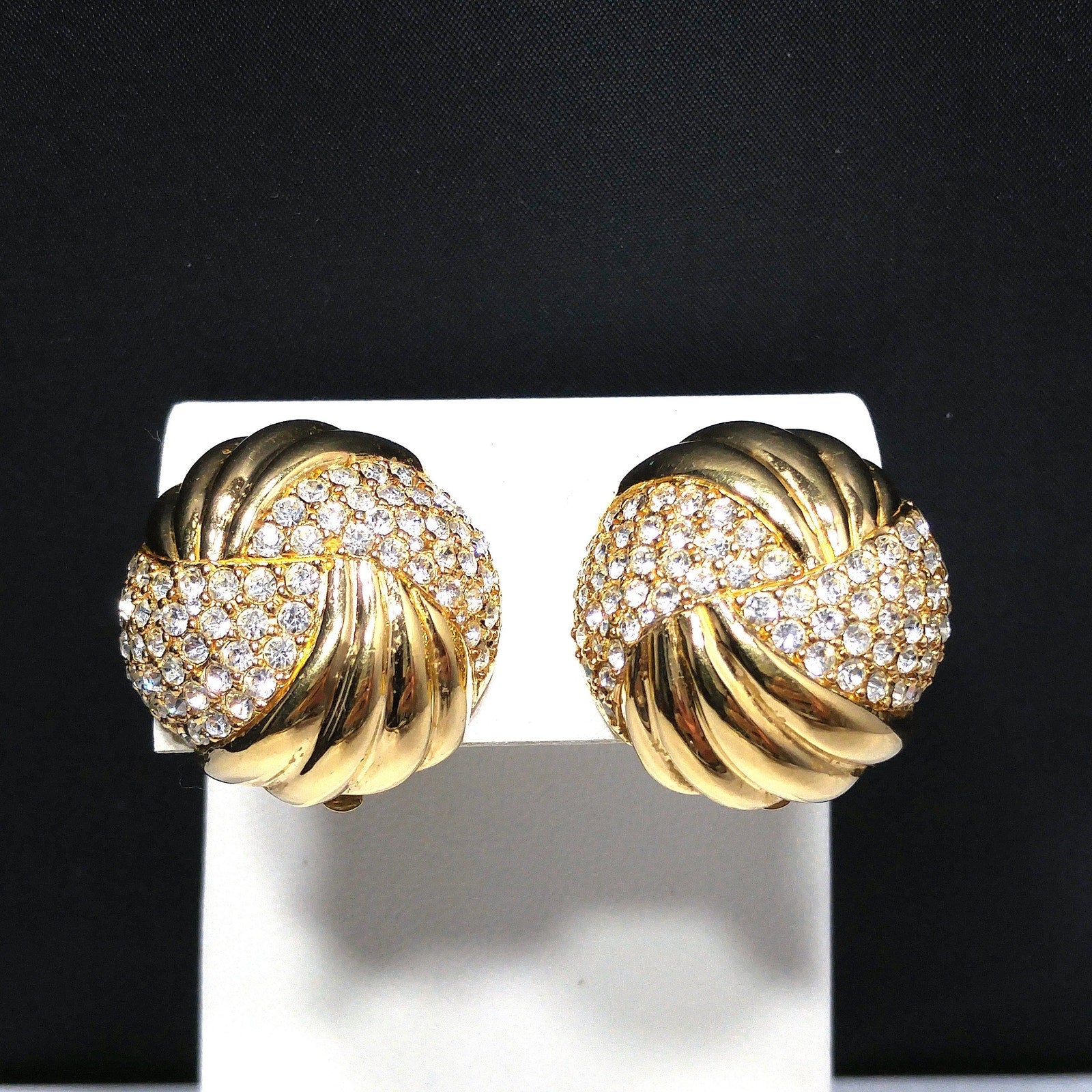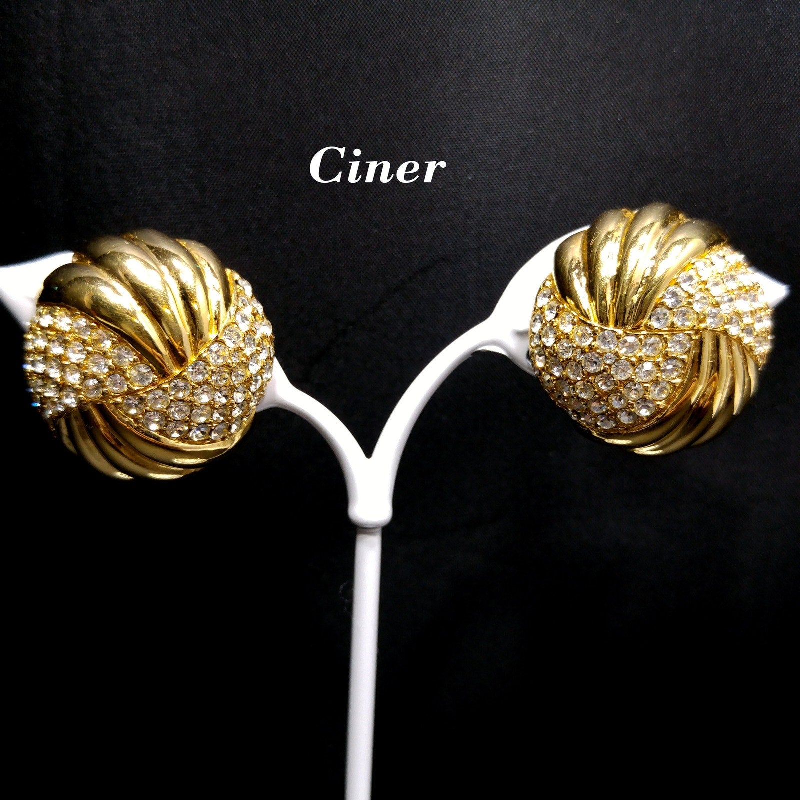 *Description: This is a beautiful pair of Ciner gold plated clear pave crystal rhinestone round clip on earrings from the 1980s. The domed earrings have a circular swirl design with half gold and half pave rhinestones. The earrings and their clips are stamped CINER and the clips have a padded cover. They are in great condition and would look wonderful on any special occasion. This would be a great addition to your vintage jewelry collection or make a great vintage gift!