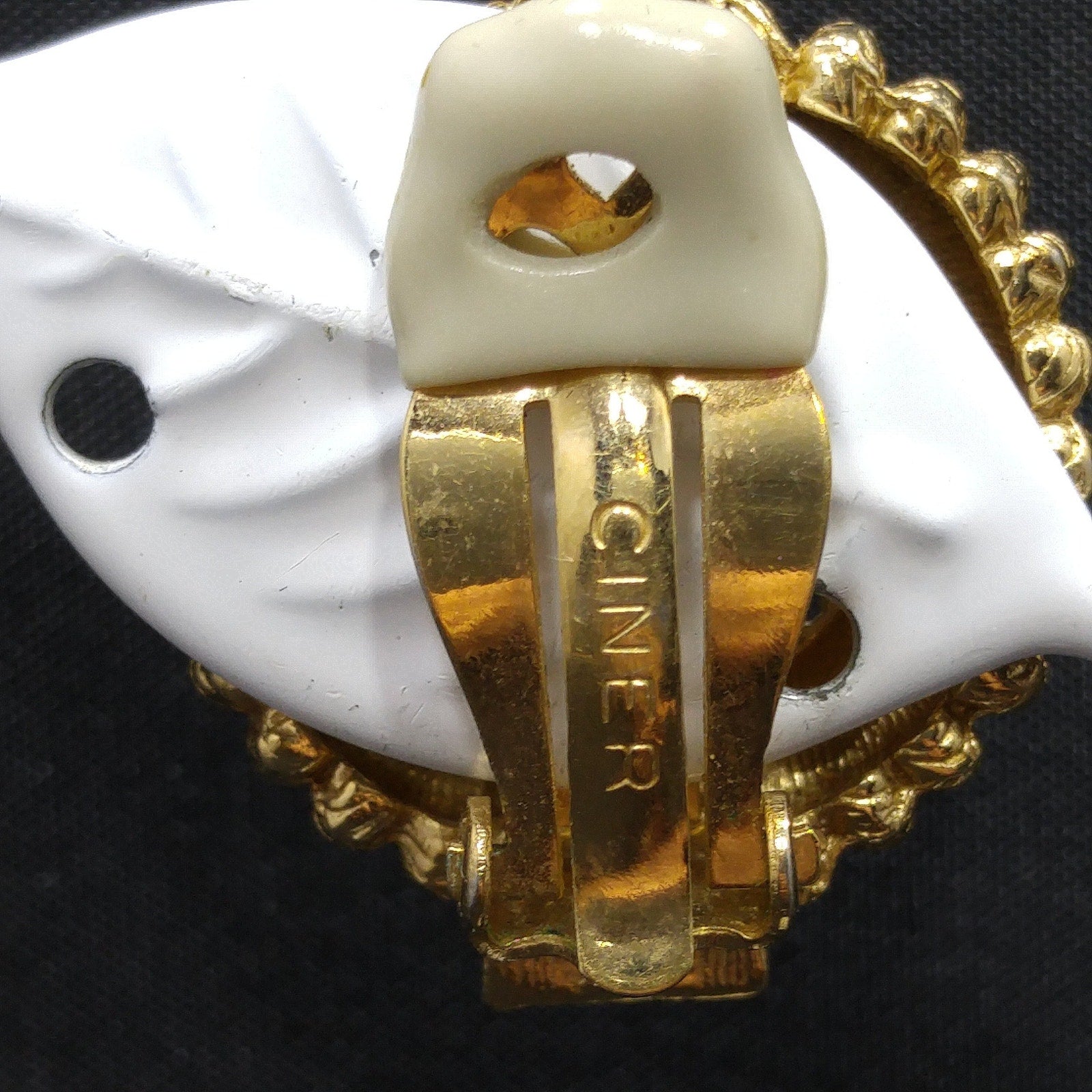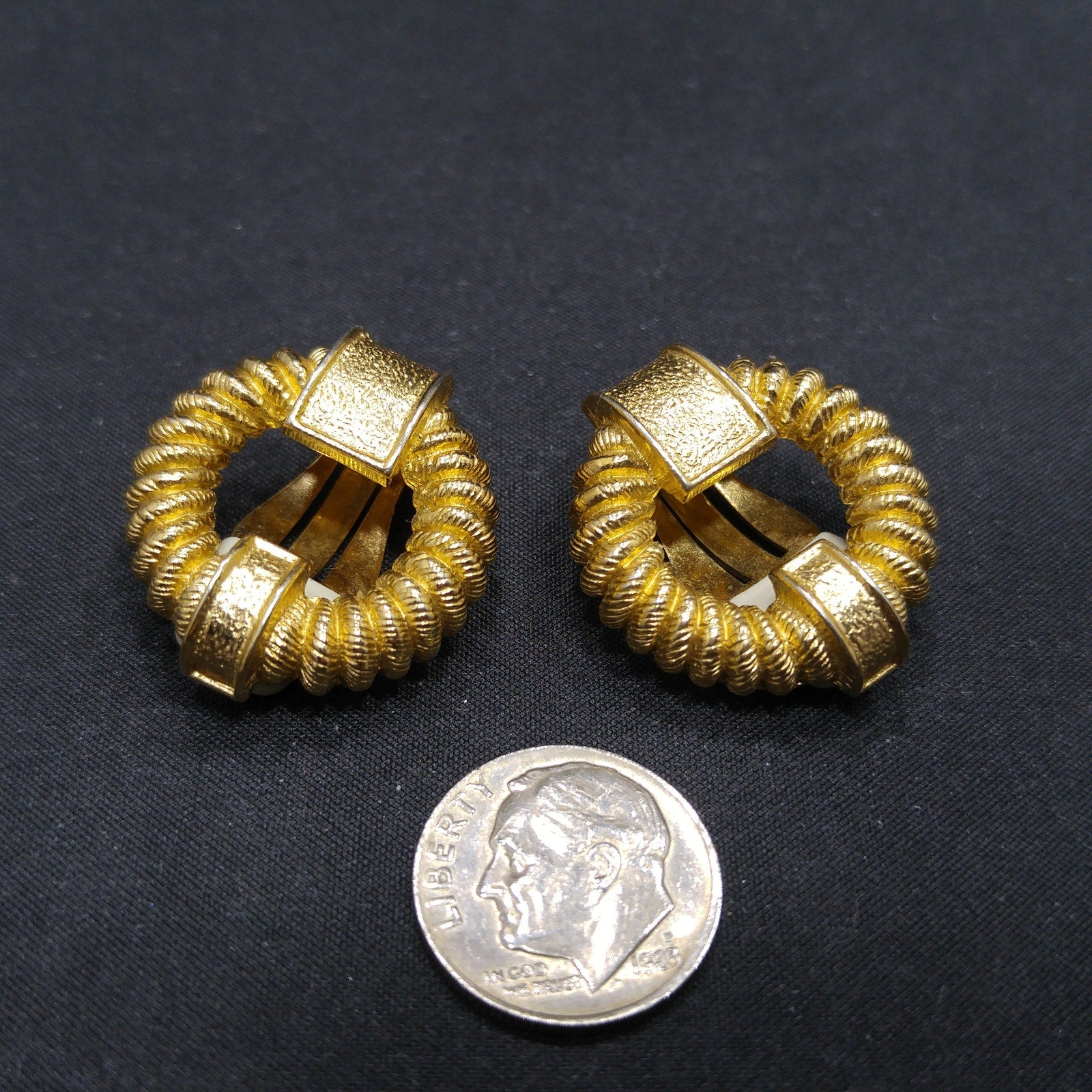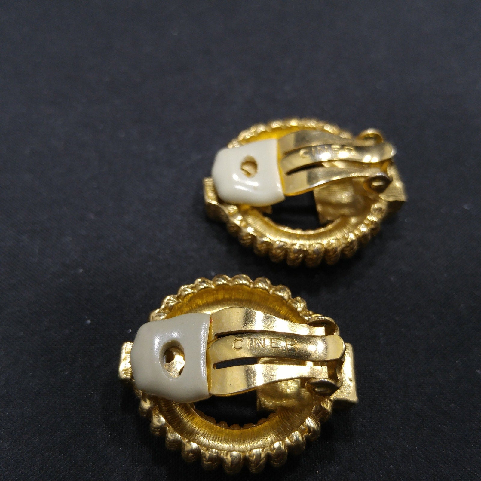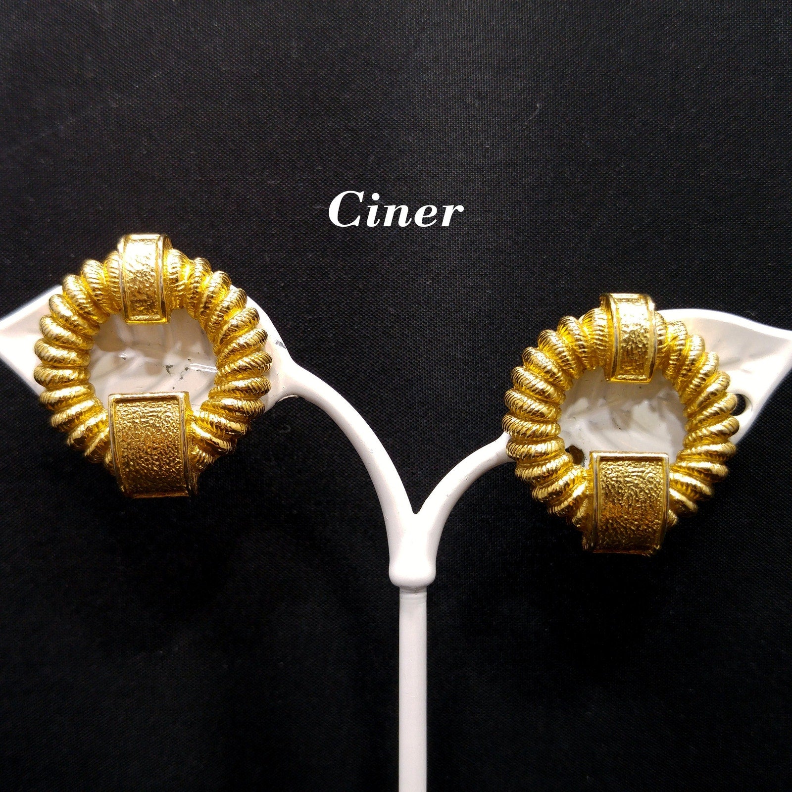 *Description: This is a beautiful pair of Ciner gold plated open center round clip on earrings from the 1980s. The earrings have a swirl design with a rectangle at the top and bottom of the design. The earrings clips are stamped CINER and the clips have a padded cover. They are in great condition and would look wonderful on any special occasion.