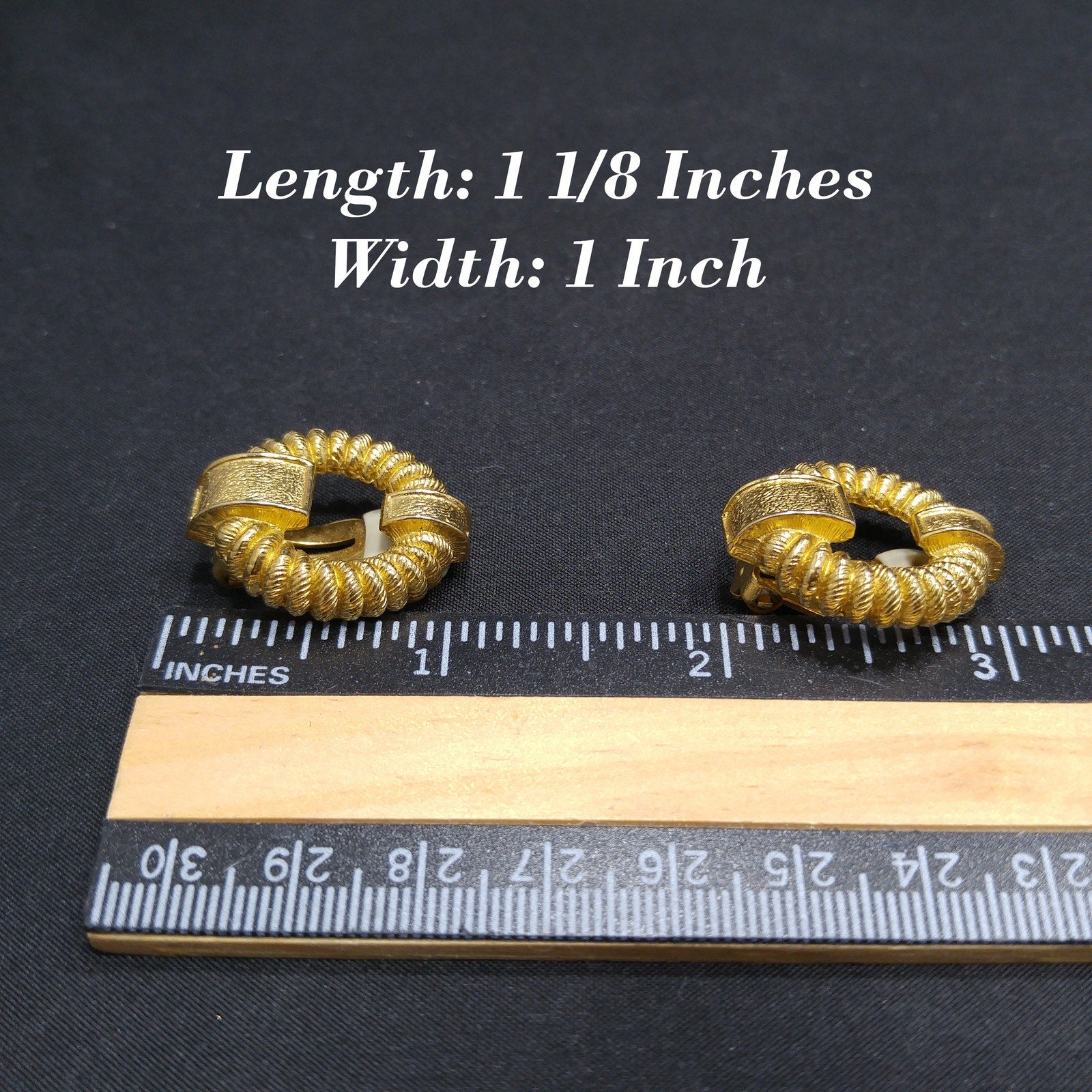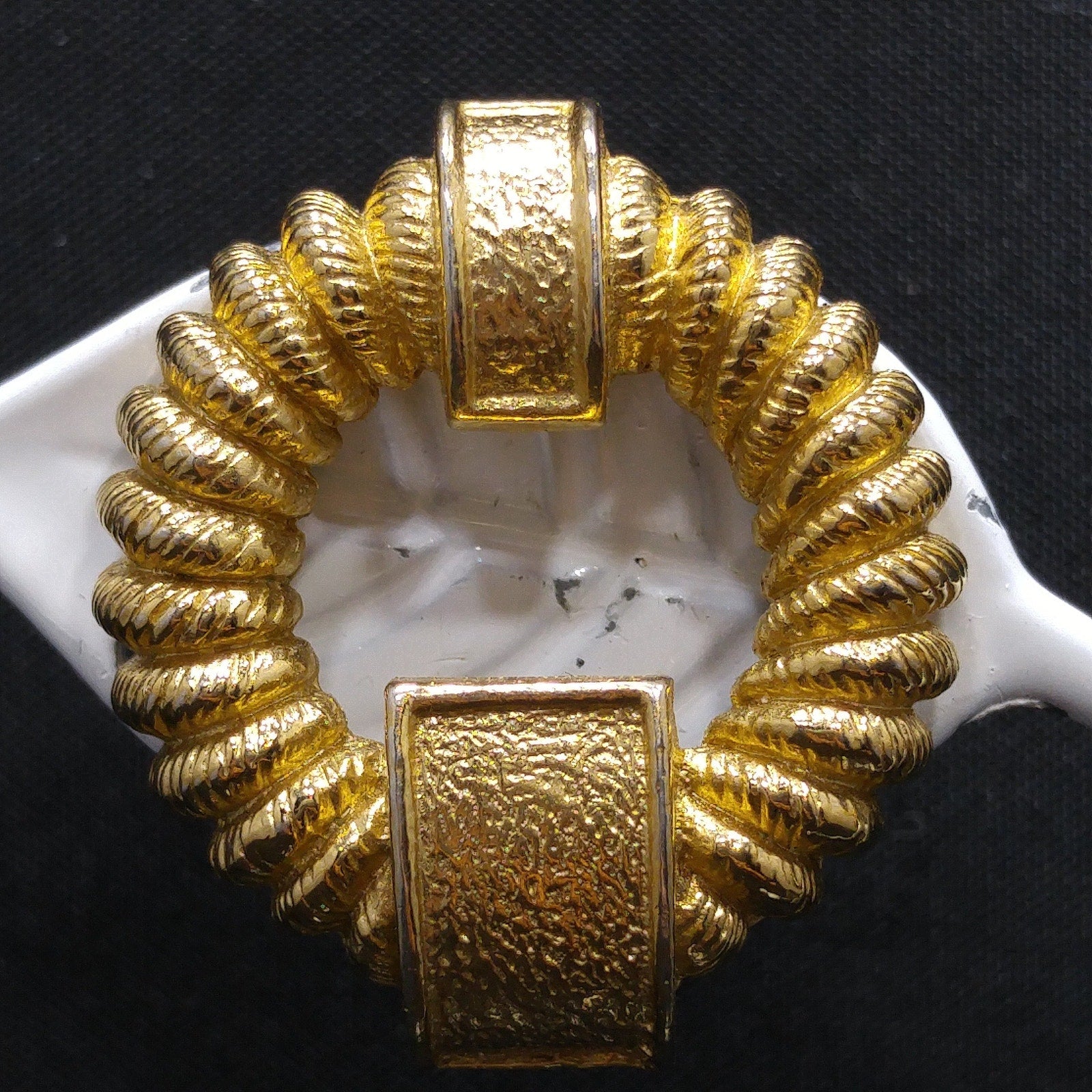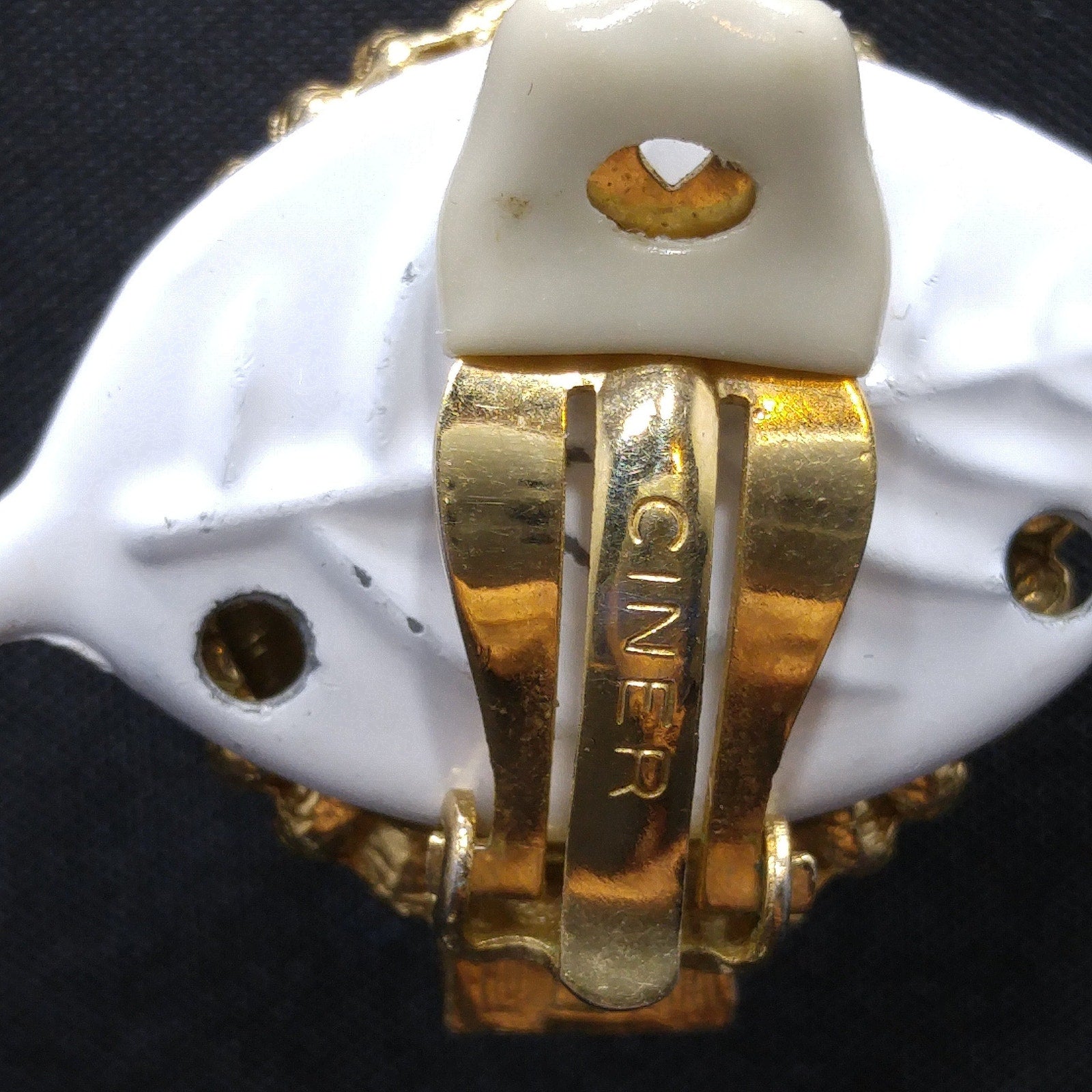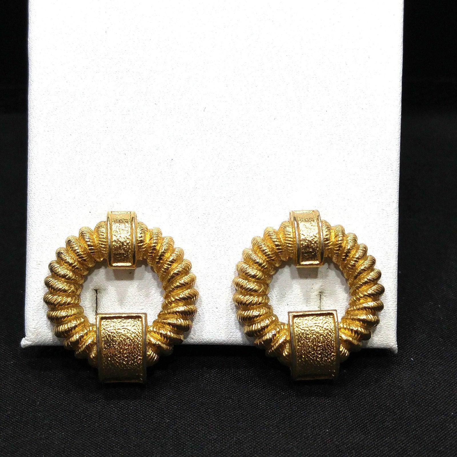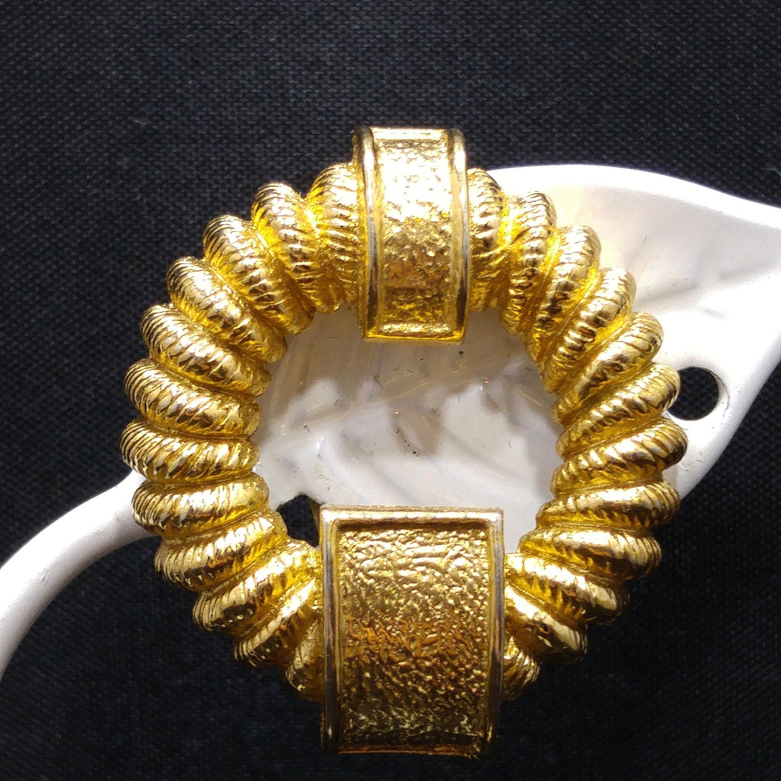 *Description: This is a beautiful pair of Ciner gold plated open center round clip on earrings from the 1980s. The earrings have a swirl design with a rectangle at the top and bottom of the design. The earrings clips are stamped CINER and the clips have a padded cover. They are in great condition and would look wonderful on any special occasion.