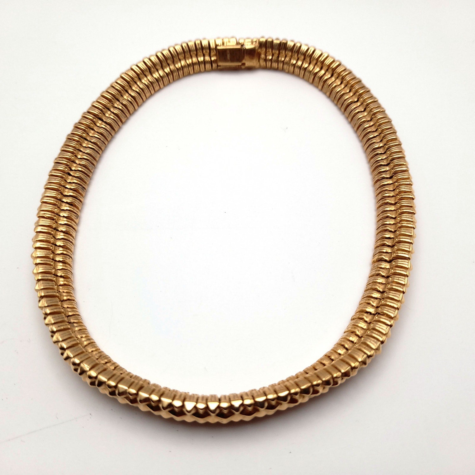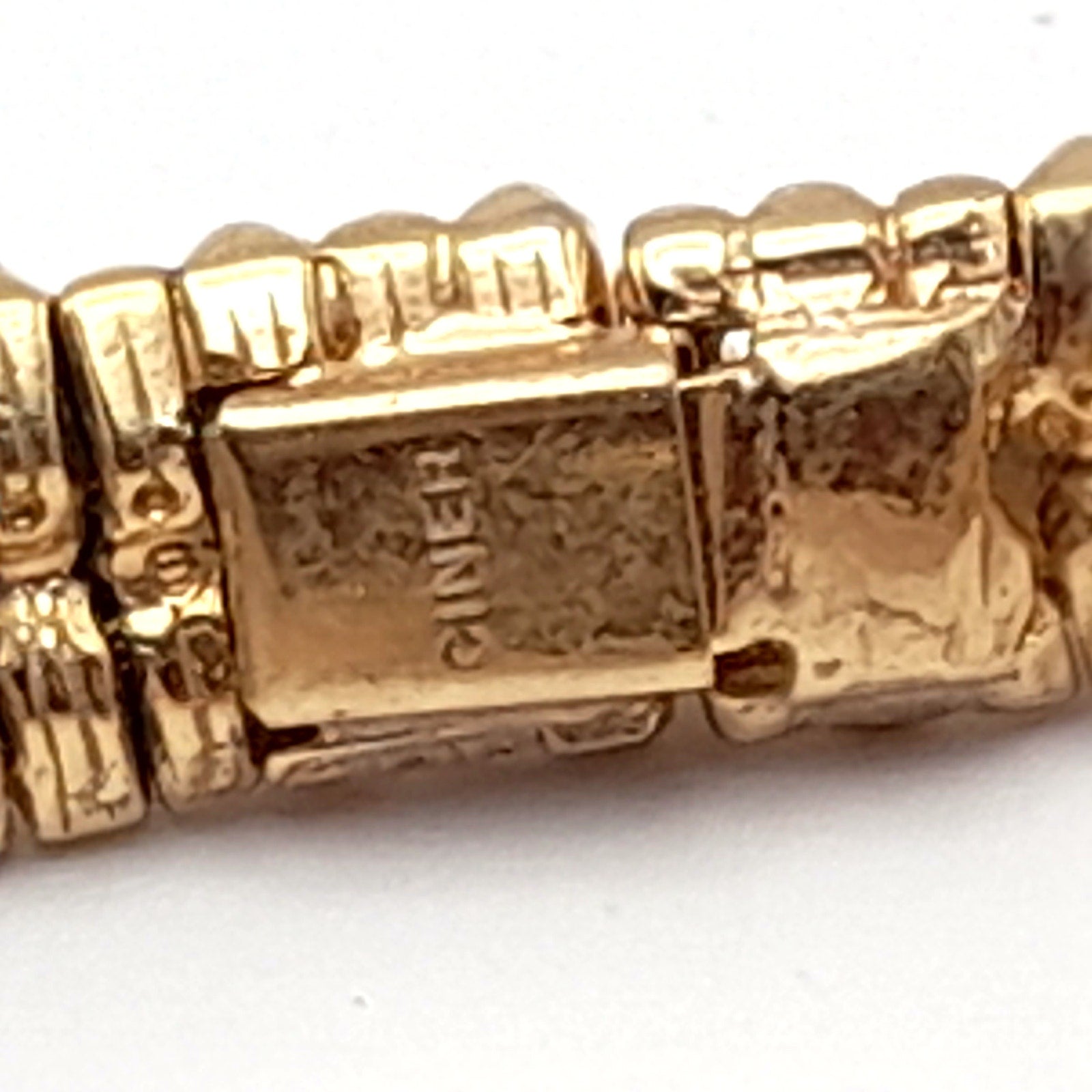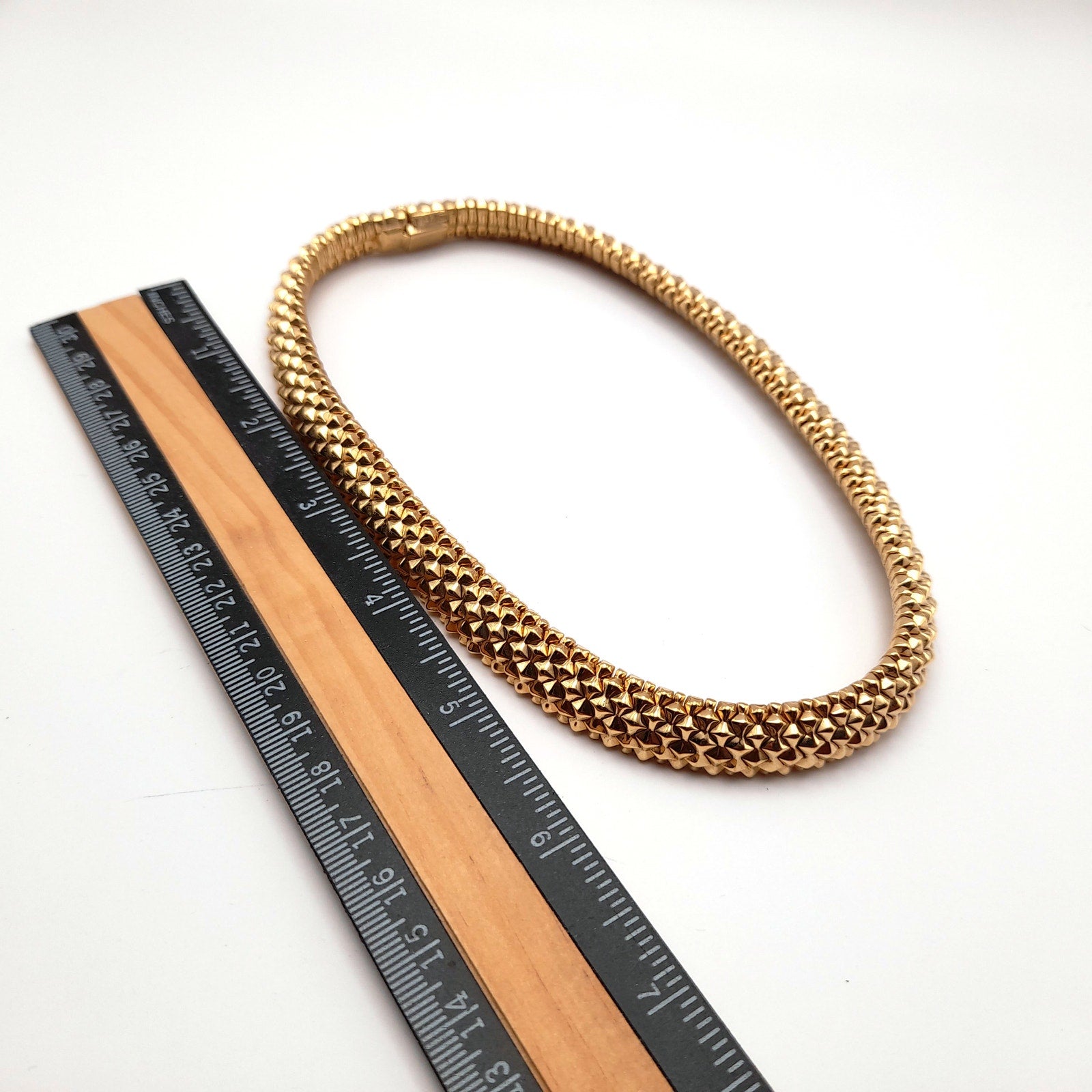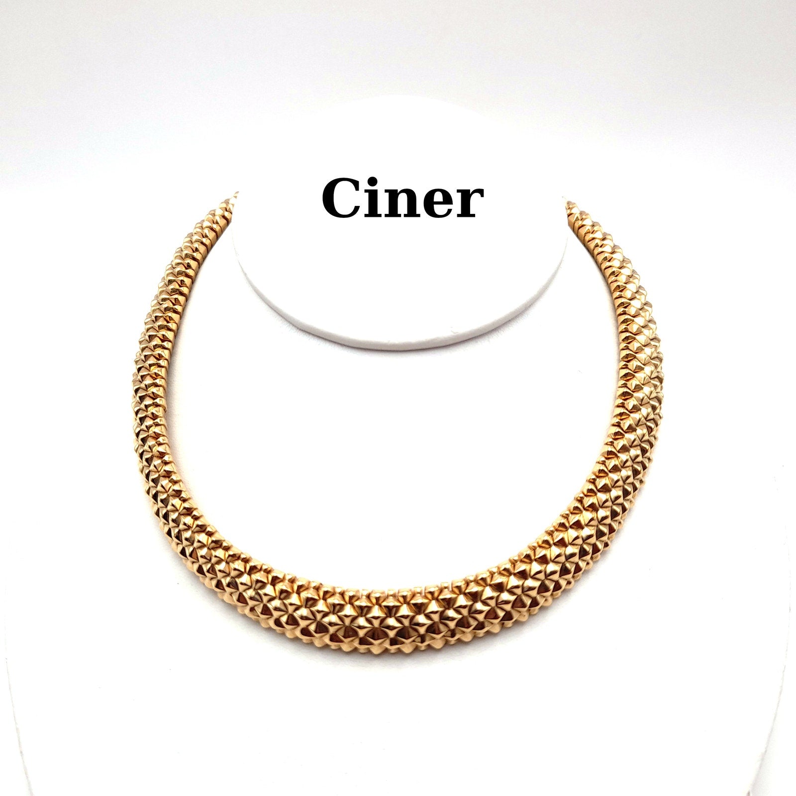 This is a vintage Ciner brutalist choker necklace that is gold plated. It measures 15 inches in length. This is a stunning piece of jewelry that would be perfect for any occasion! This choker is sure to turn heads with its unique design and luxurious gold plating. Don't miss out on the chance to own a piece of vintage elegance. It is in excellent condition and ready to wear. Grab it now!