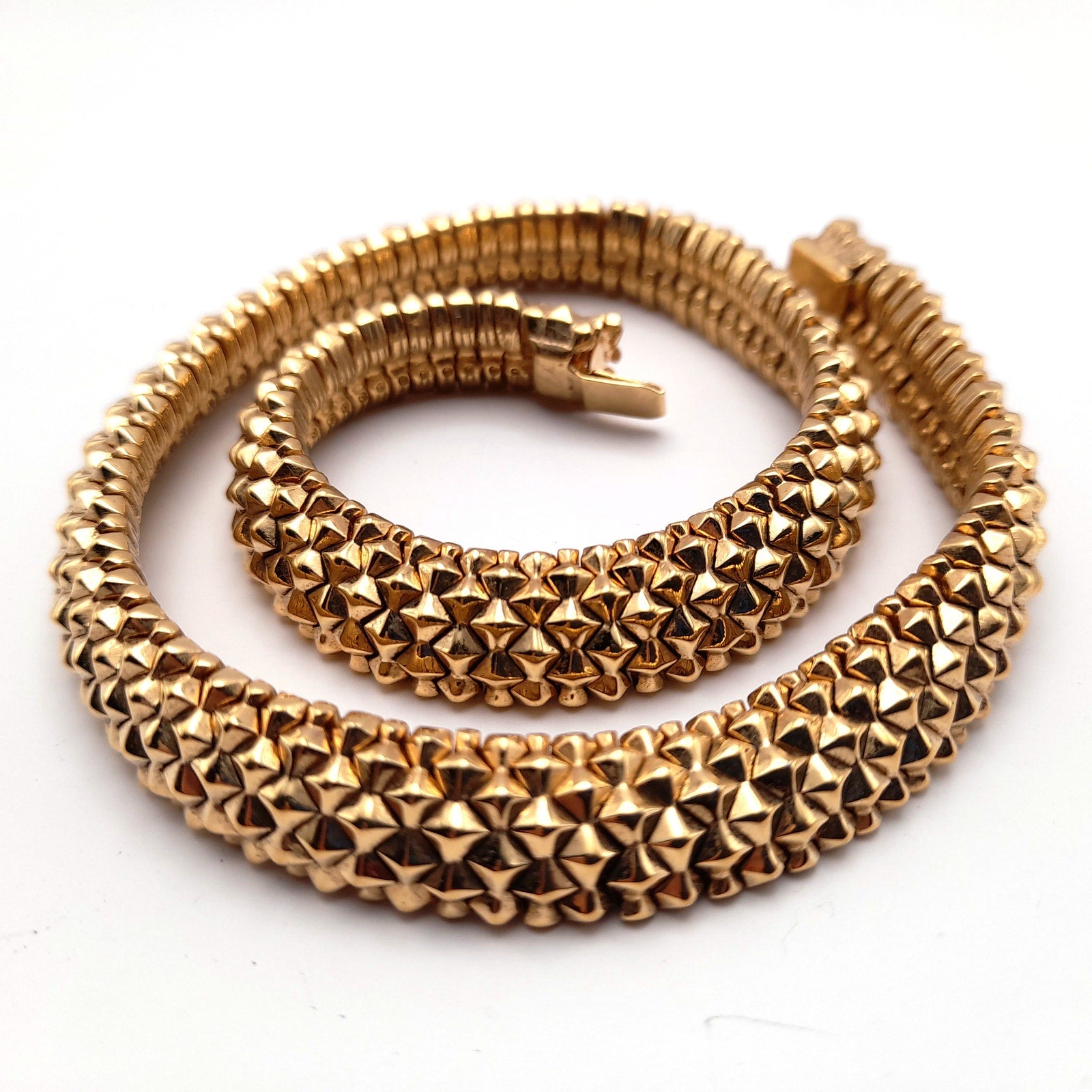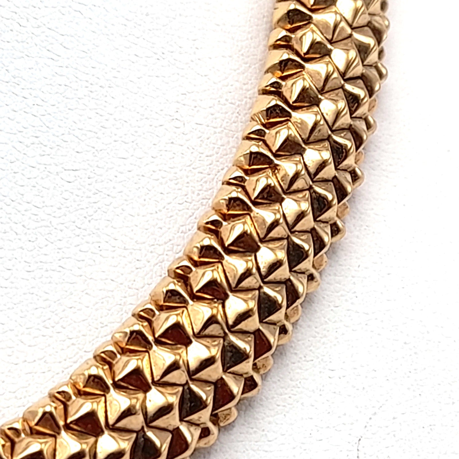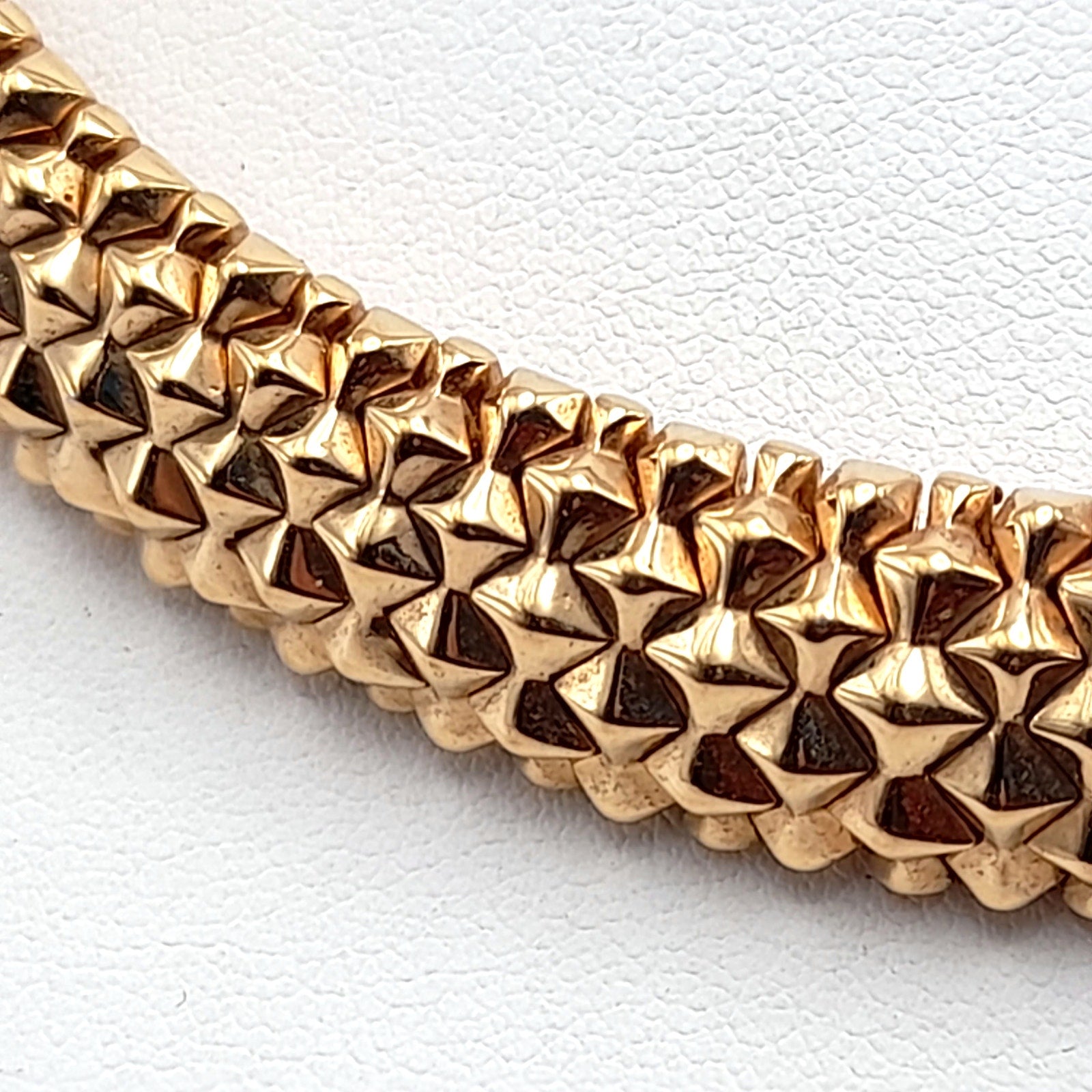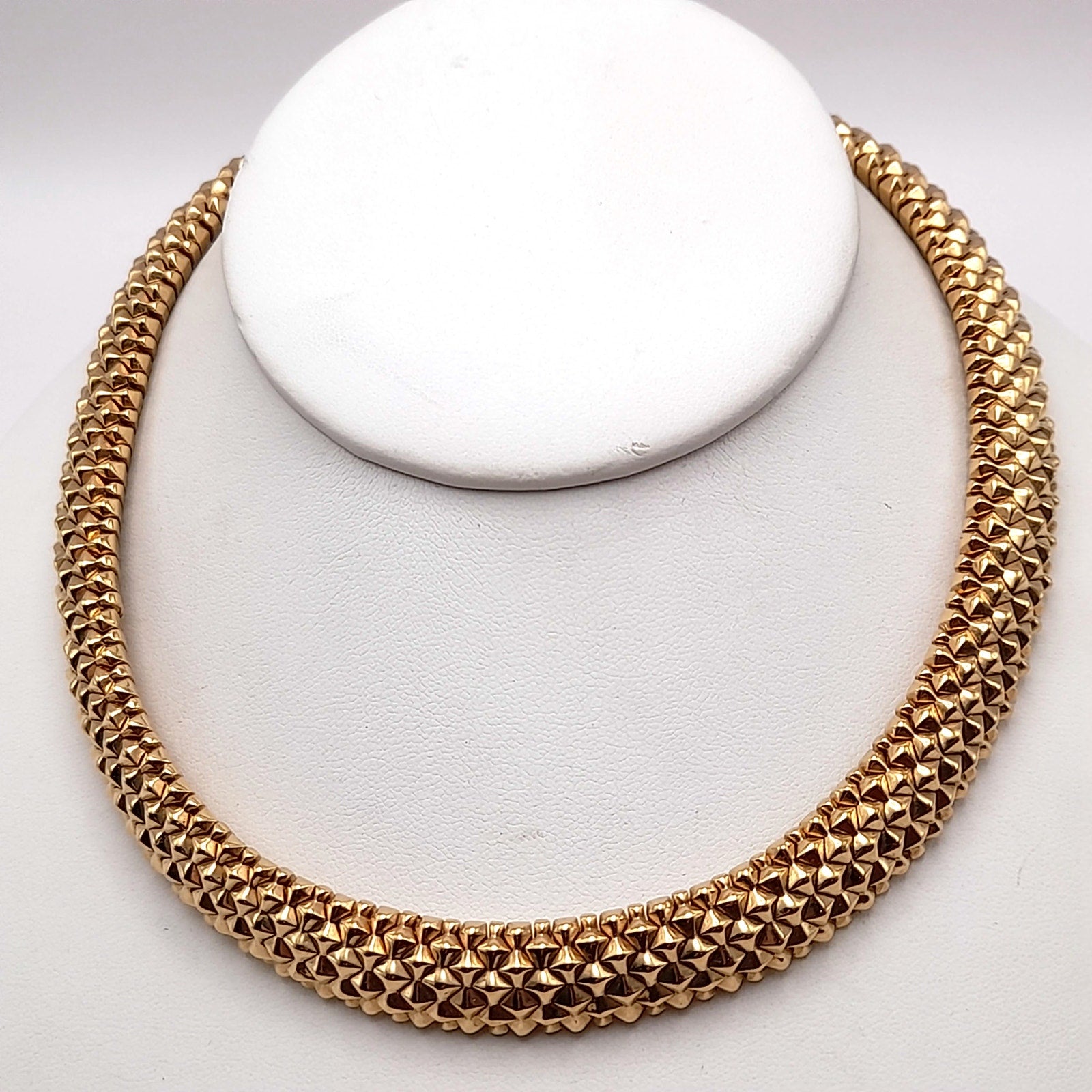 This is a vintage Ciner brutalist choker necklace that is gold plated. It measures 15 inches in length. This is a stunning piece of jewelry that would be perfect for any occasion! This choker is sure to turn heads with its unique design and luxurious gold plating. Don't miss out on the chance to own a piece of vintage elegance. It is in excellent condition and ready to wear. Grab it now!
