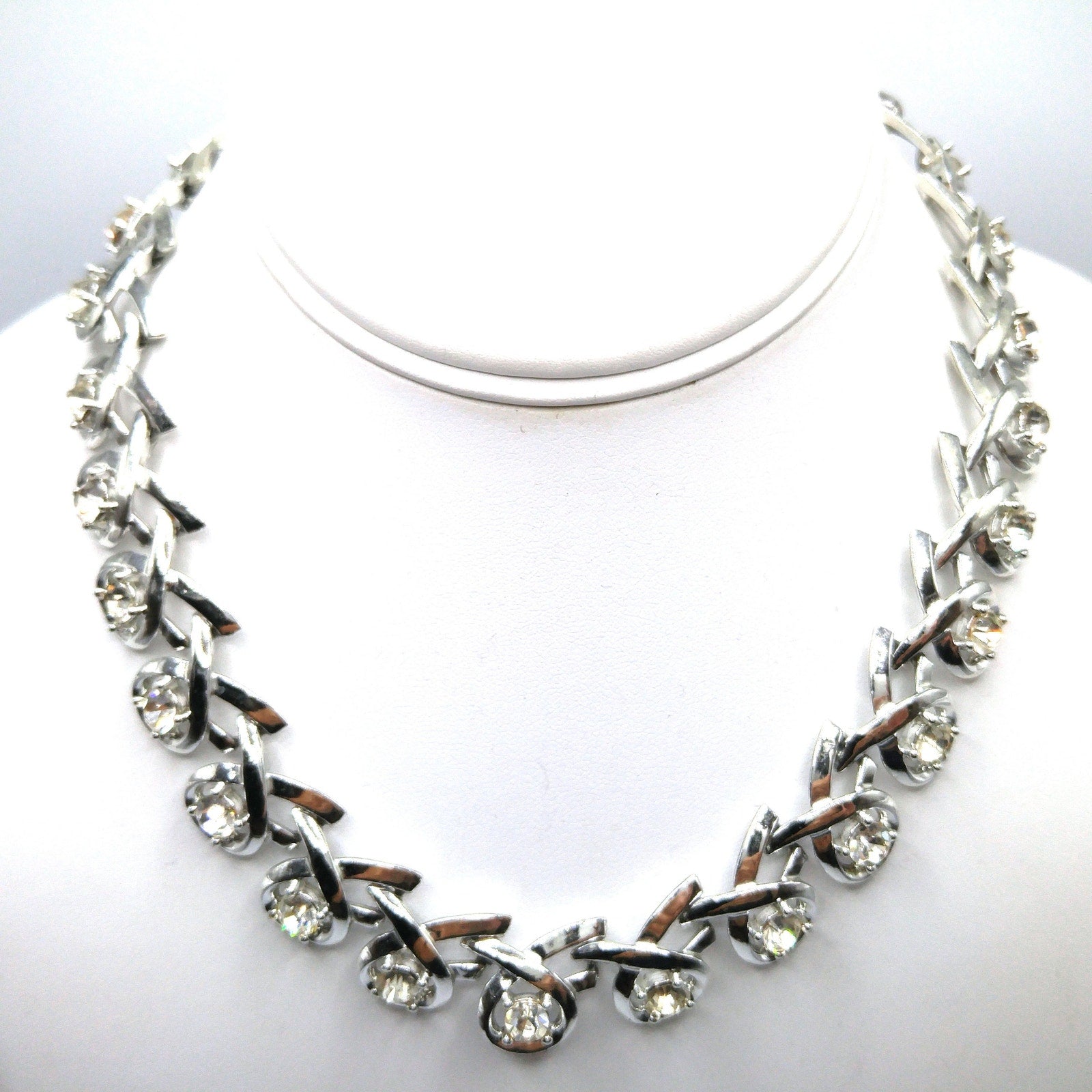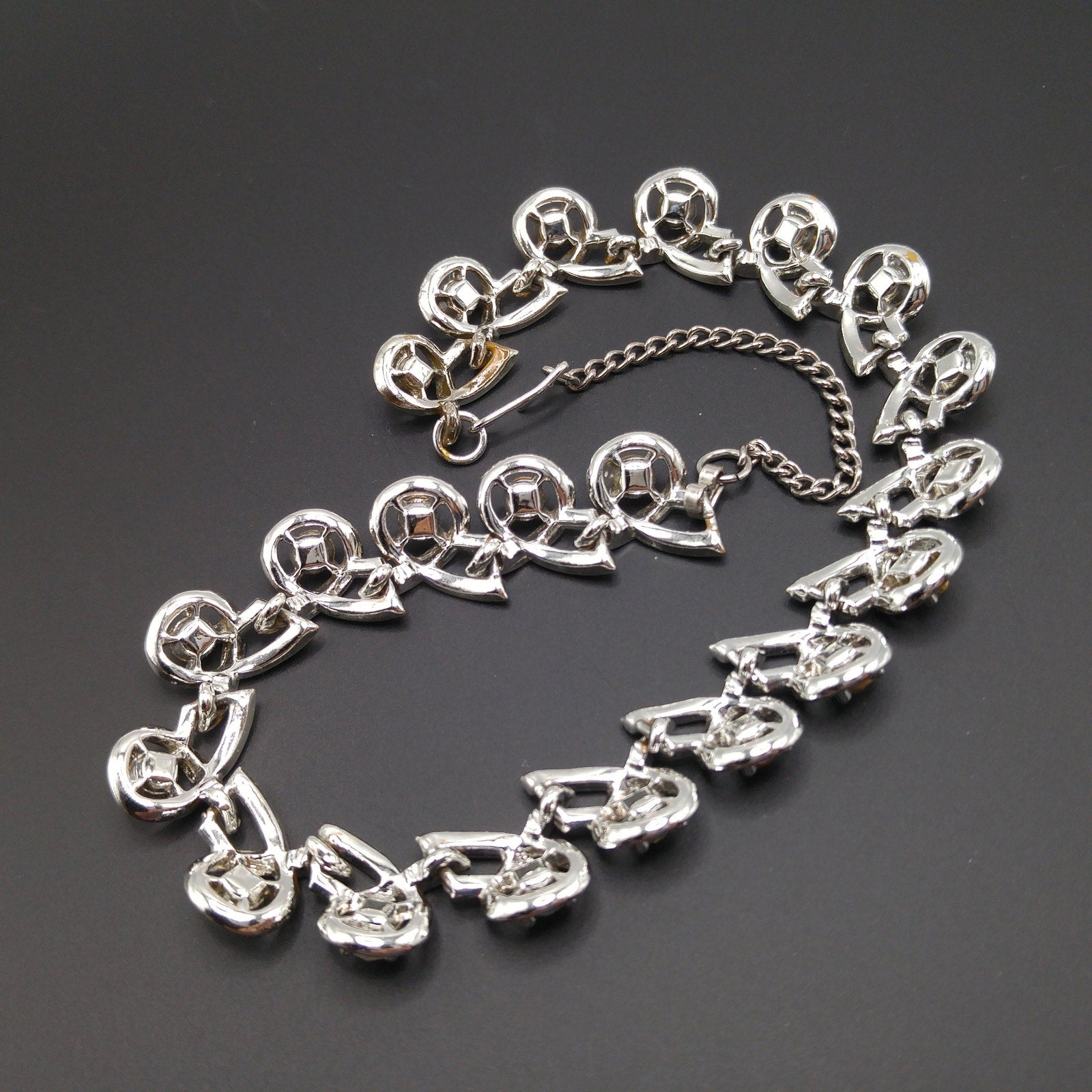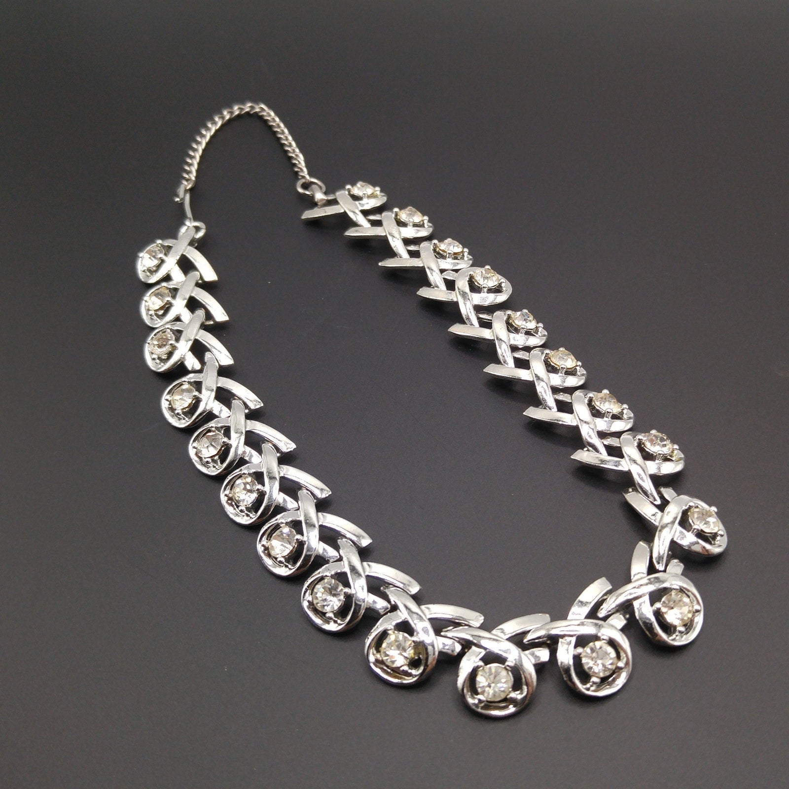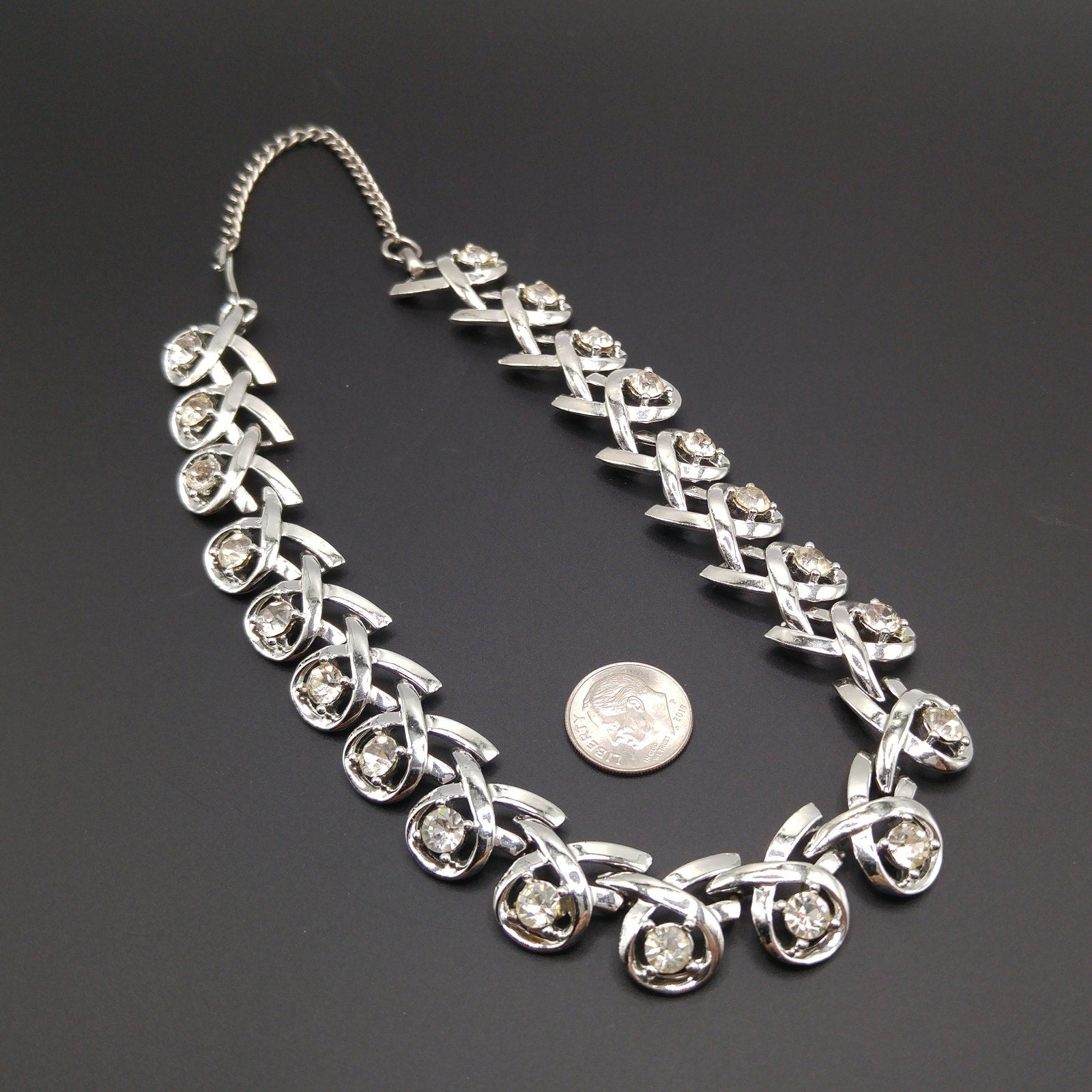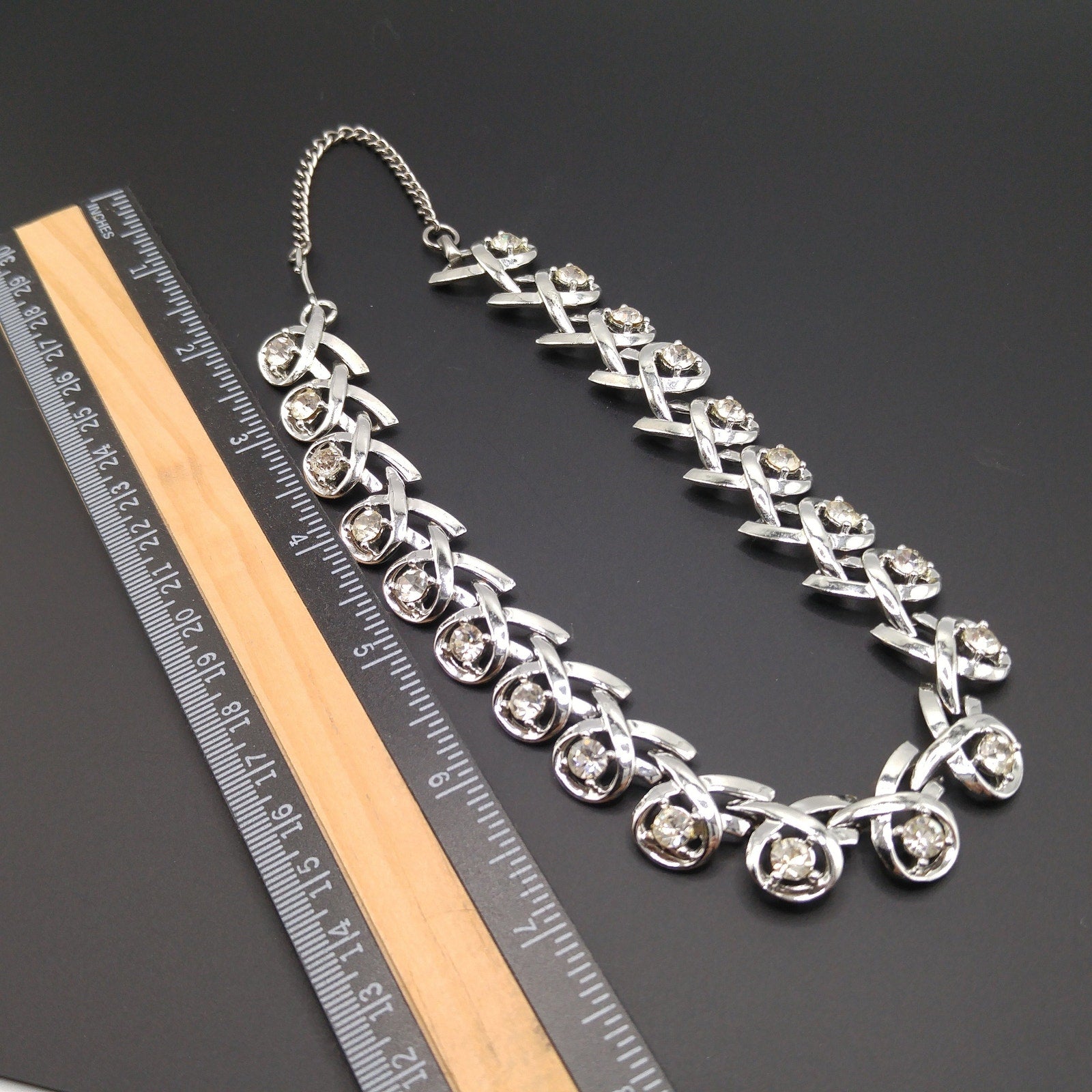 *Description: This is a beautiful rhodium plated clear rhinestone choker necklace from the 1960s. Each link has a prong set clear chaton cut rhinestone in a looped design with a chain and hook to adjust the length up to 15 1/2 Inches. Each rhinestone is in place and full of sparkle. This necklace would be beautiful for any formal occasion or to add a touch of bling to your outfit. This would be a great addition to your vintage jewelry collection or make a great vintage gift!