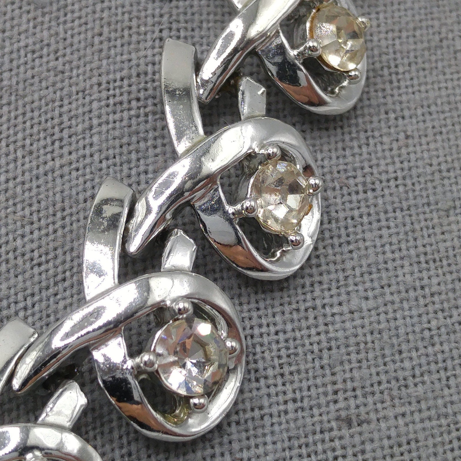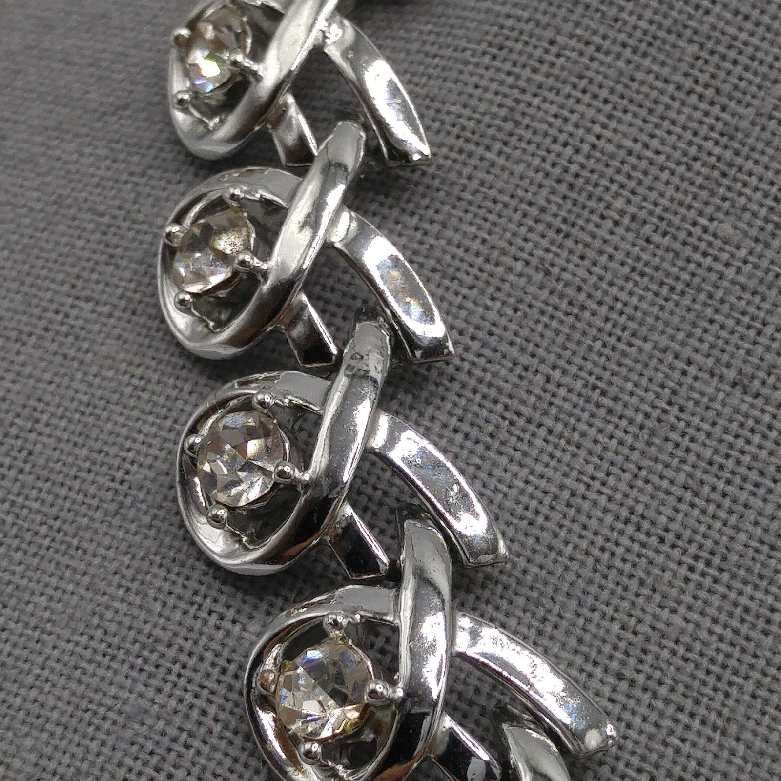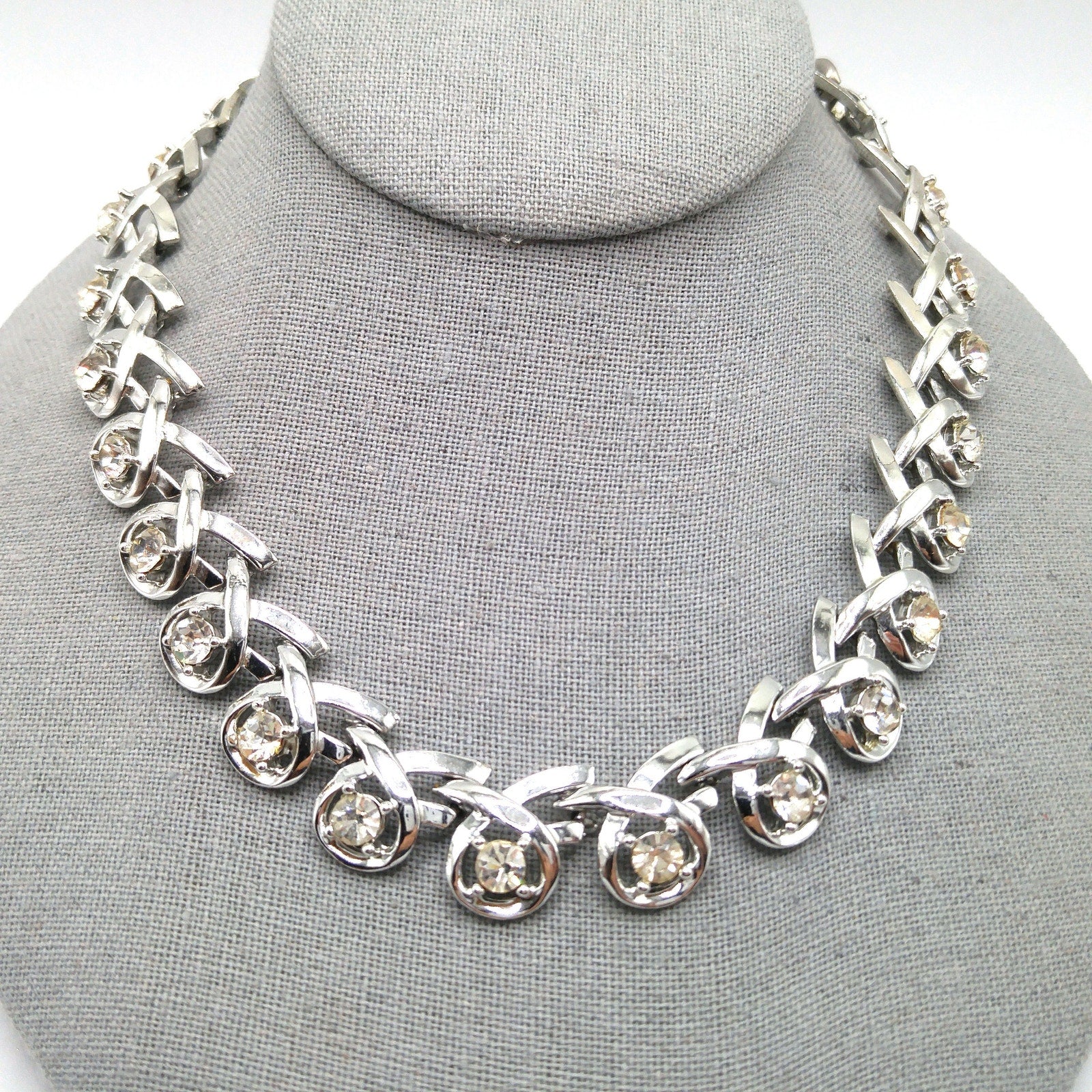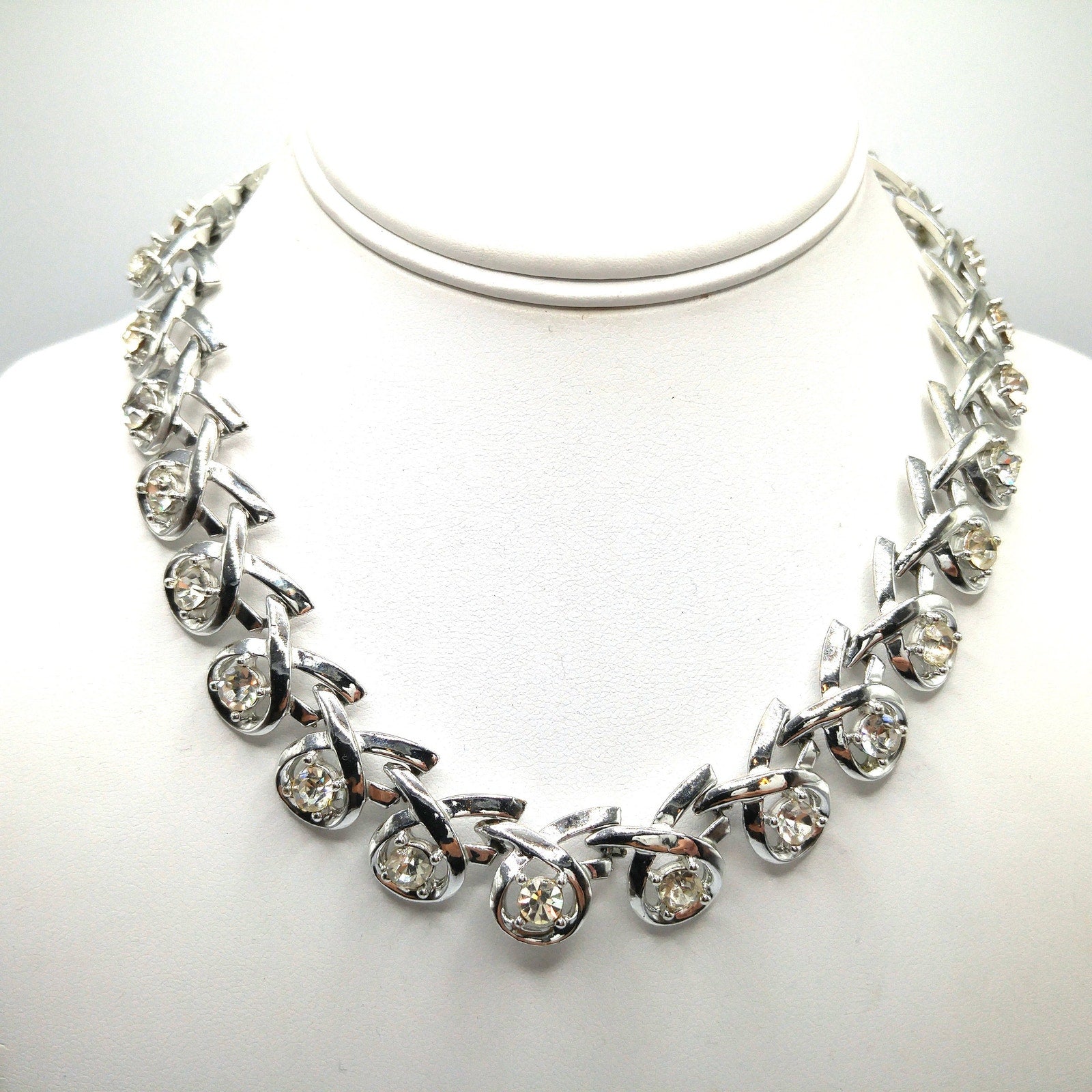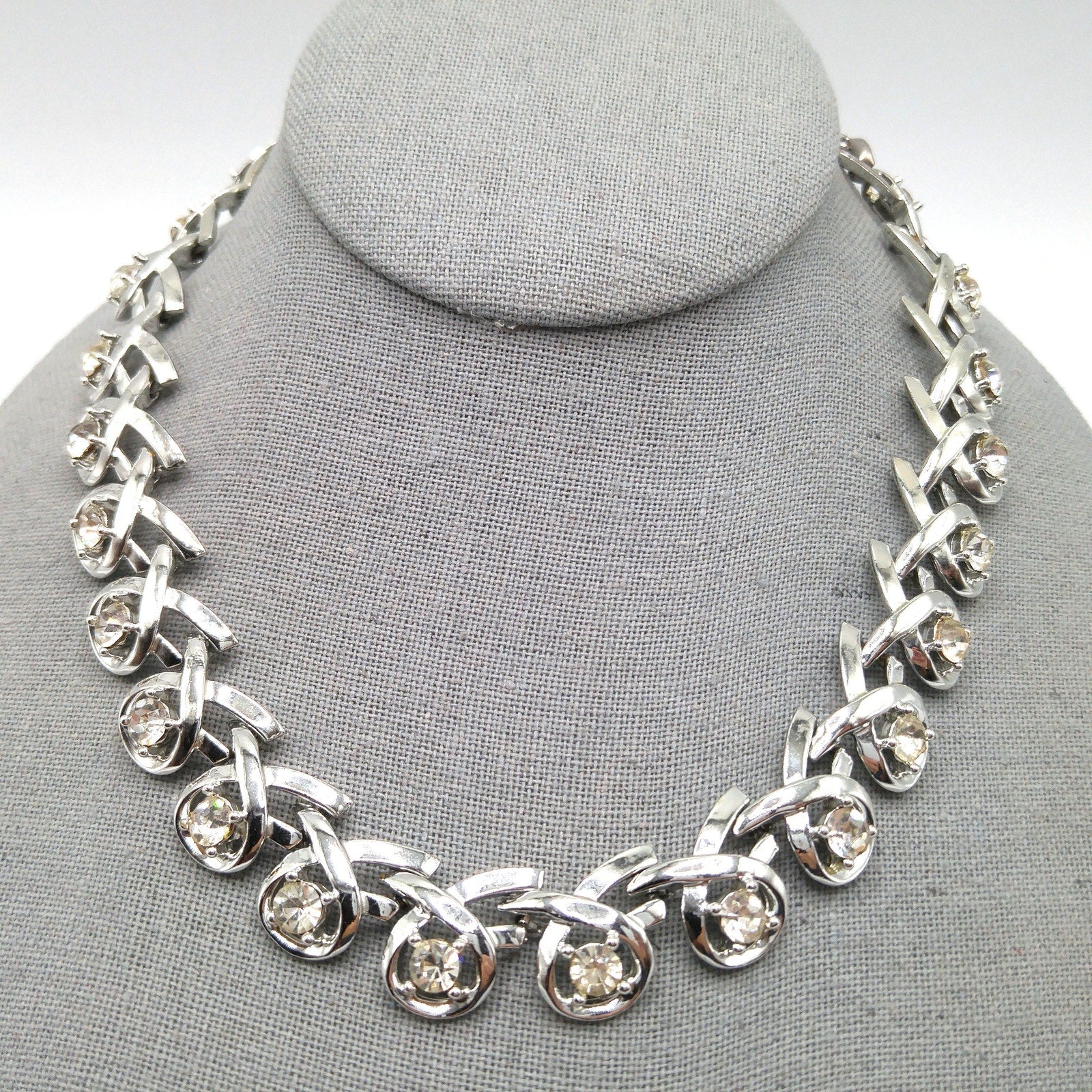*Description: This is a beautiful rhodium plated clear rhinestone choker necklace from the 1960s. Each link has a prong set clear chaton cut rhinestone in a looped design with a chain and hook to adjust the length up to 15 1/2 Inches. Each rhinestone is in place and full of sparkle. This necklace would be beautiful for any formal occasion or to add a touch of bling to your outfit. This would be a great addition to your vintage jewelry collection or make a great vintage gift!