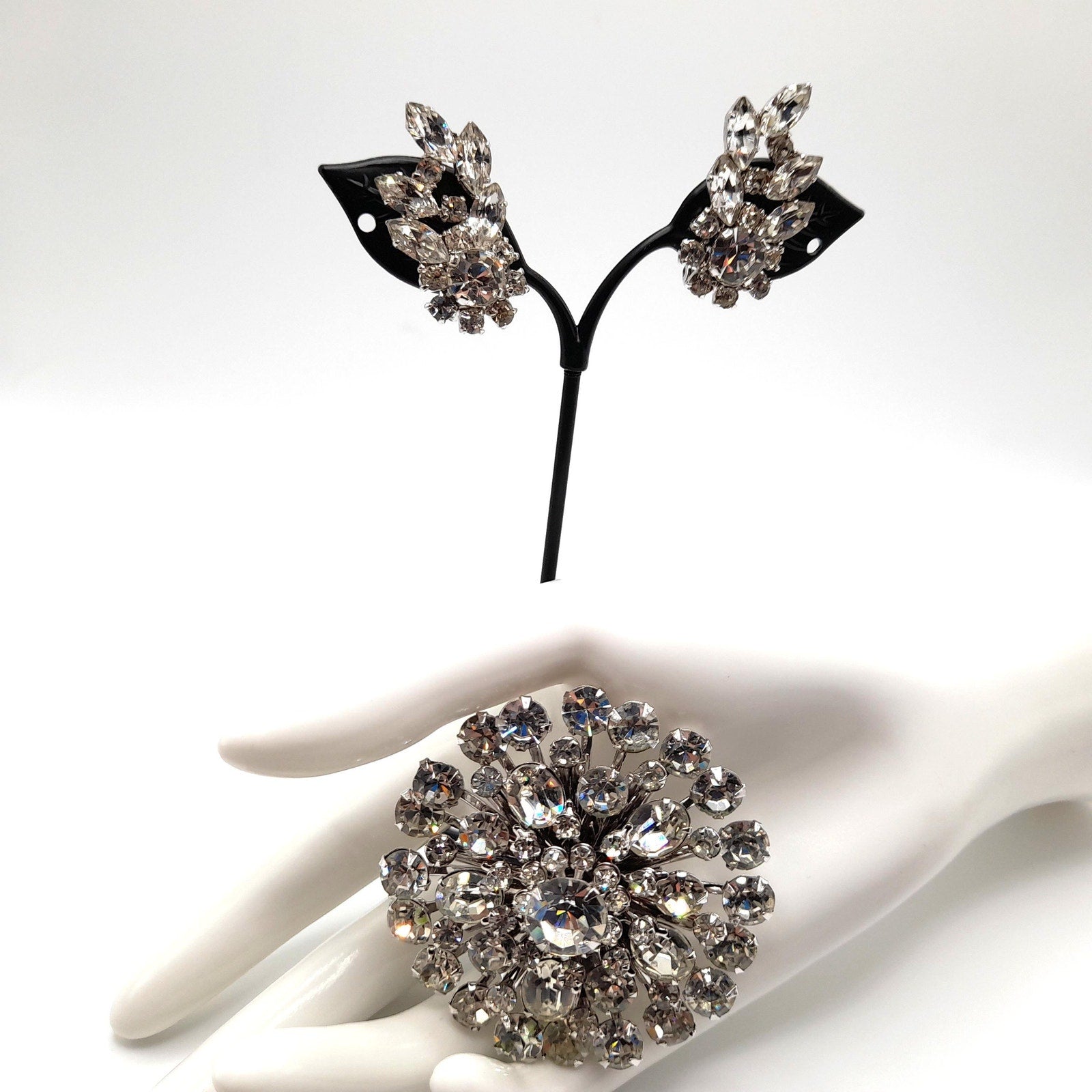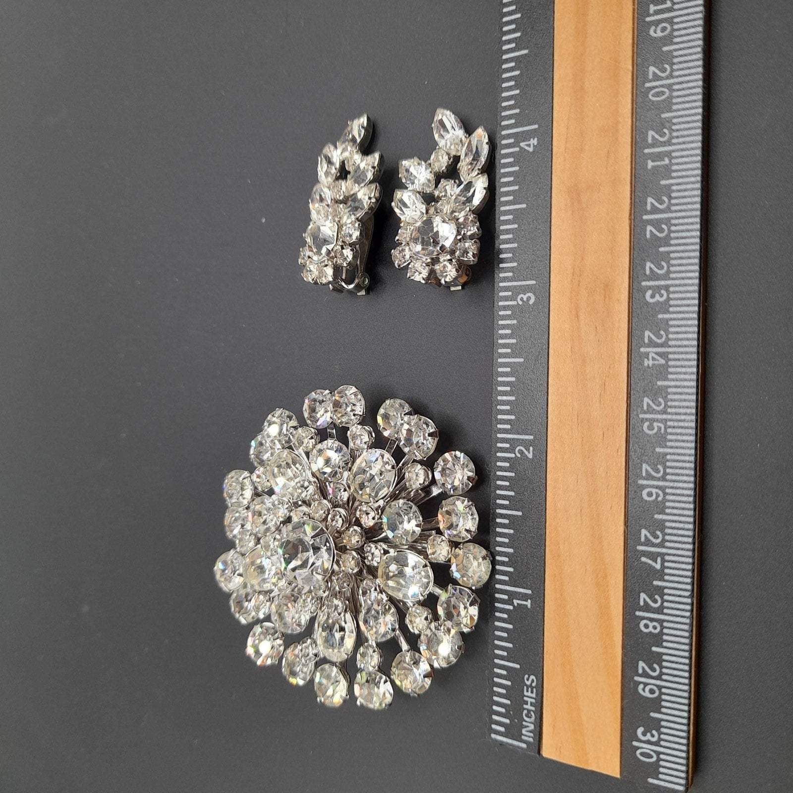 Clear Rhinestone Round Brooch Clip Earrings Set, Wedding Holiday Jewelry, 1950s Vintage Jewelry