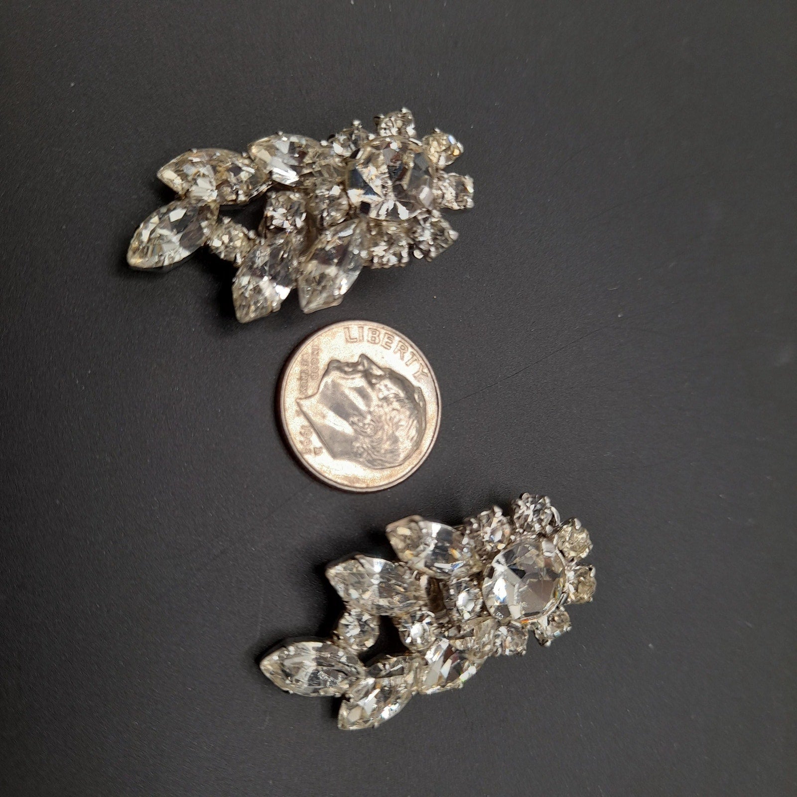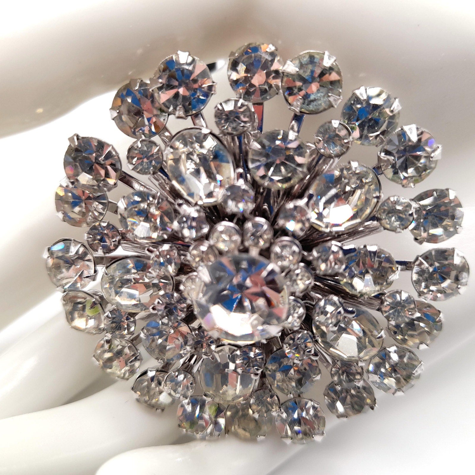 *Description: This is a beautiful vintage mid-century floral clear rhinestone round brooch with matching clip on earrings from the late 1950s. The brooch has a riveted design which allows the floral brooch to look three dimensional. The clip on earrings are rhodium plated. Both the brooch and earrings are full of sparkle and shine and would look beautiful for a wedding, the holidays, and many special events in the future. This would be a great addition to your vintage jewelry collection or make a great vintage gift!