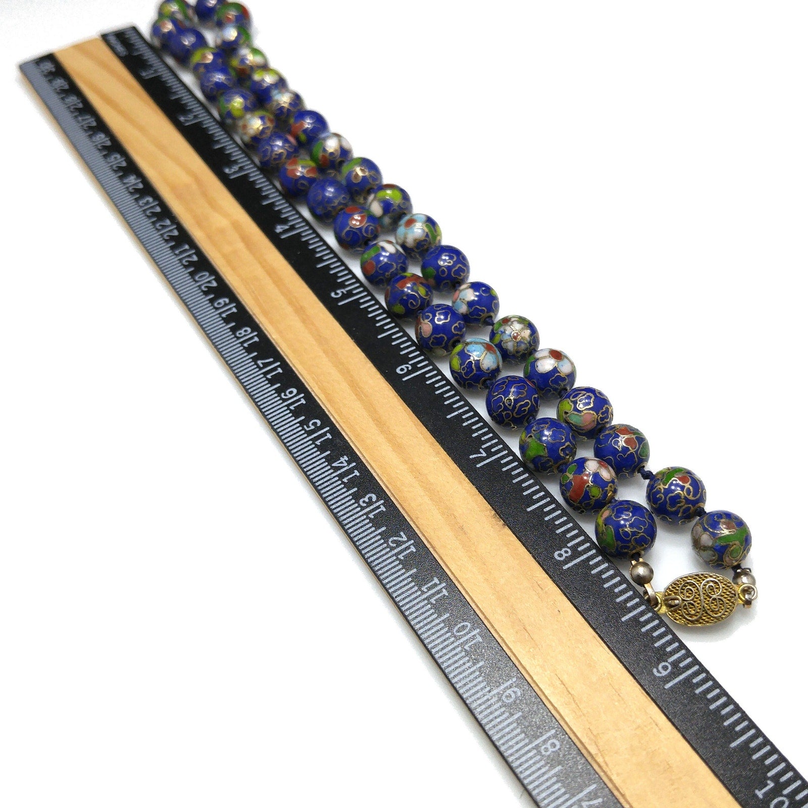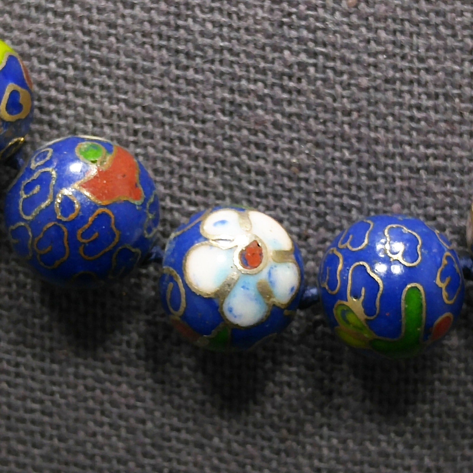 Cloisonne Blue Beaded Necklace, Floral Hand Painted Beads, 1960s Vintage Jewelry