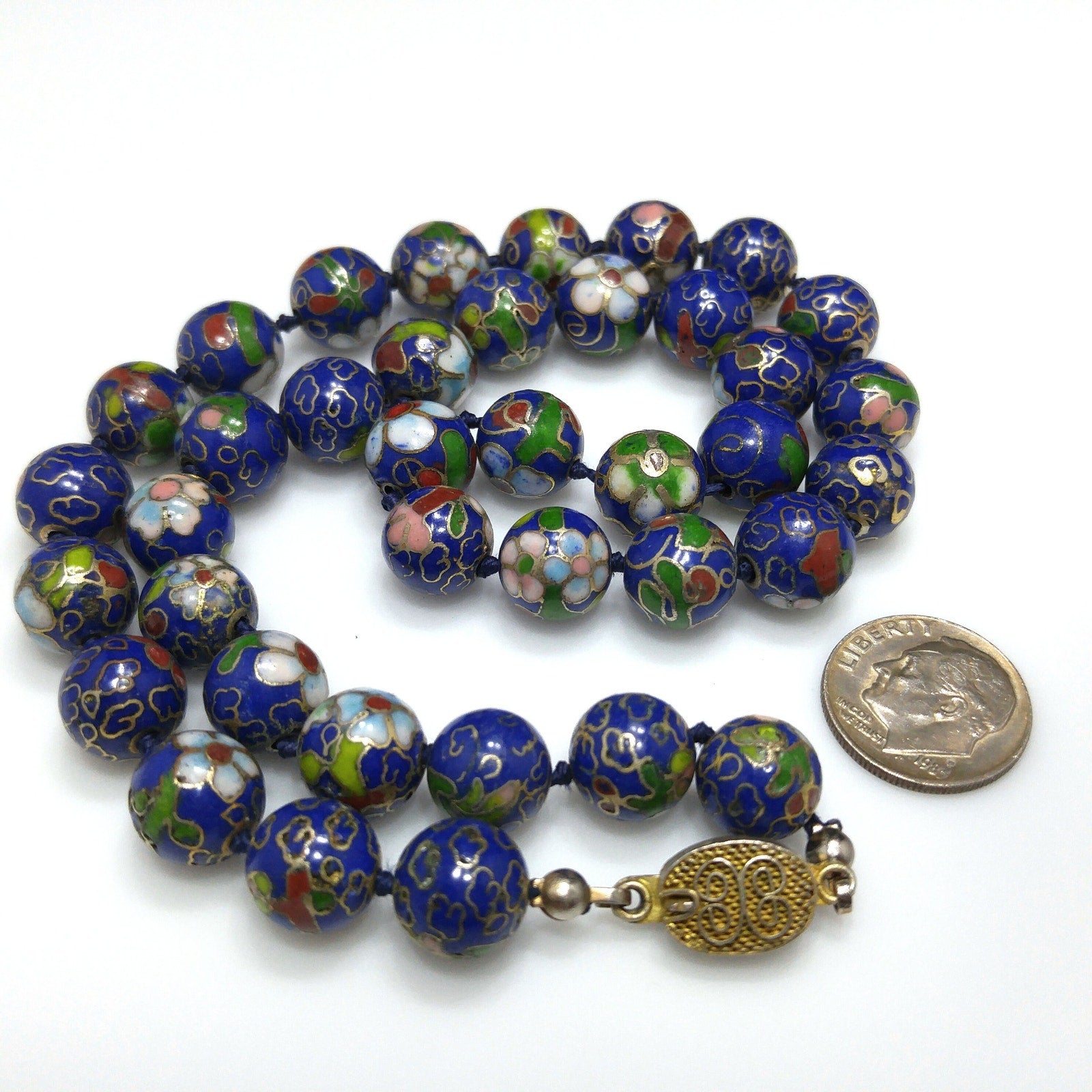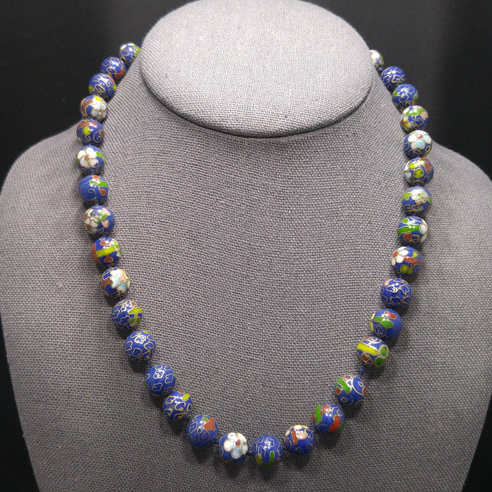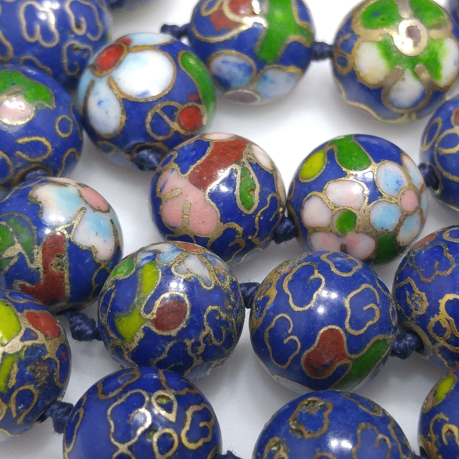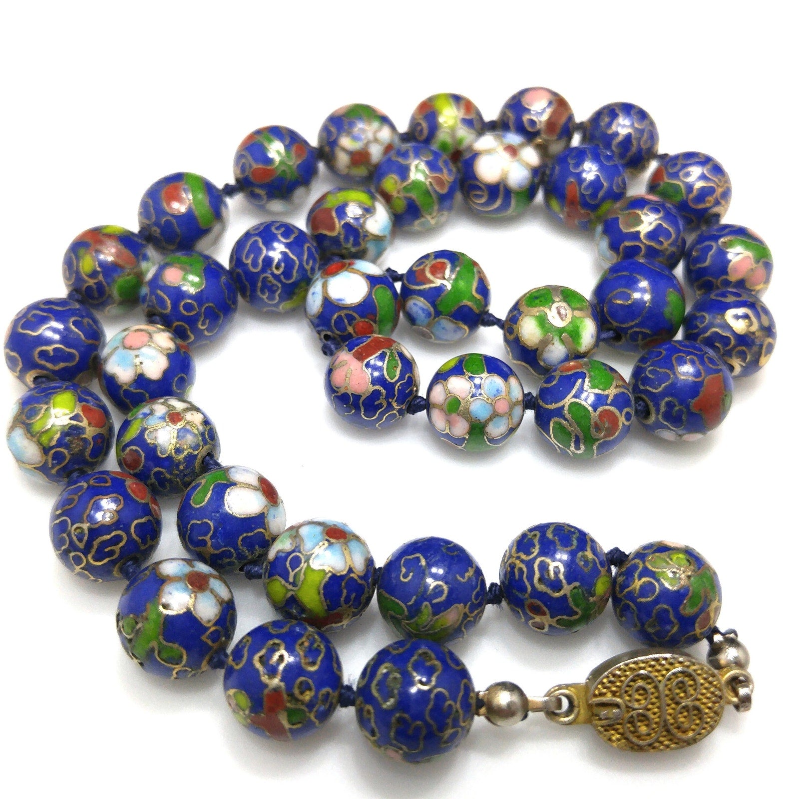 *Description: This is a beautiful cloisonne hand painted floral beaded necklace, early Chinese export, from the 1960s. The dark blue background has beautiful pink flowers, along with green leaves and red centers and blue and white flowers with red centers. There are also additional colors. Please see photos for details. The flowers are outlined in gold cloisonne on each bead and the beads are hand knotted with blue silk thread. They are approximately 10mm and the clasp is gold tone. This would be a great addition to your vintage jewelry collection or make a great vintage gift!