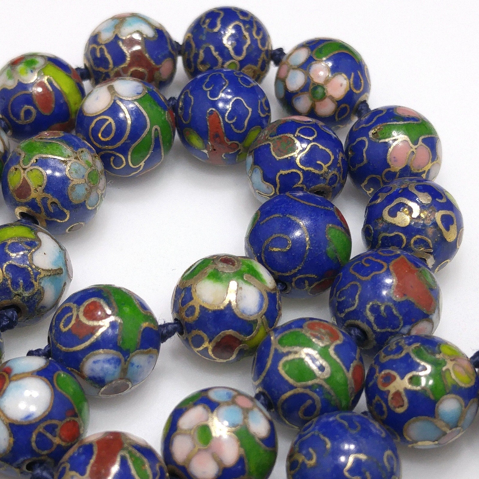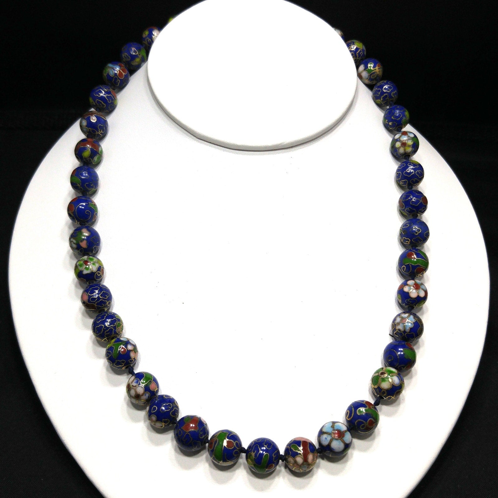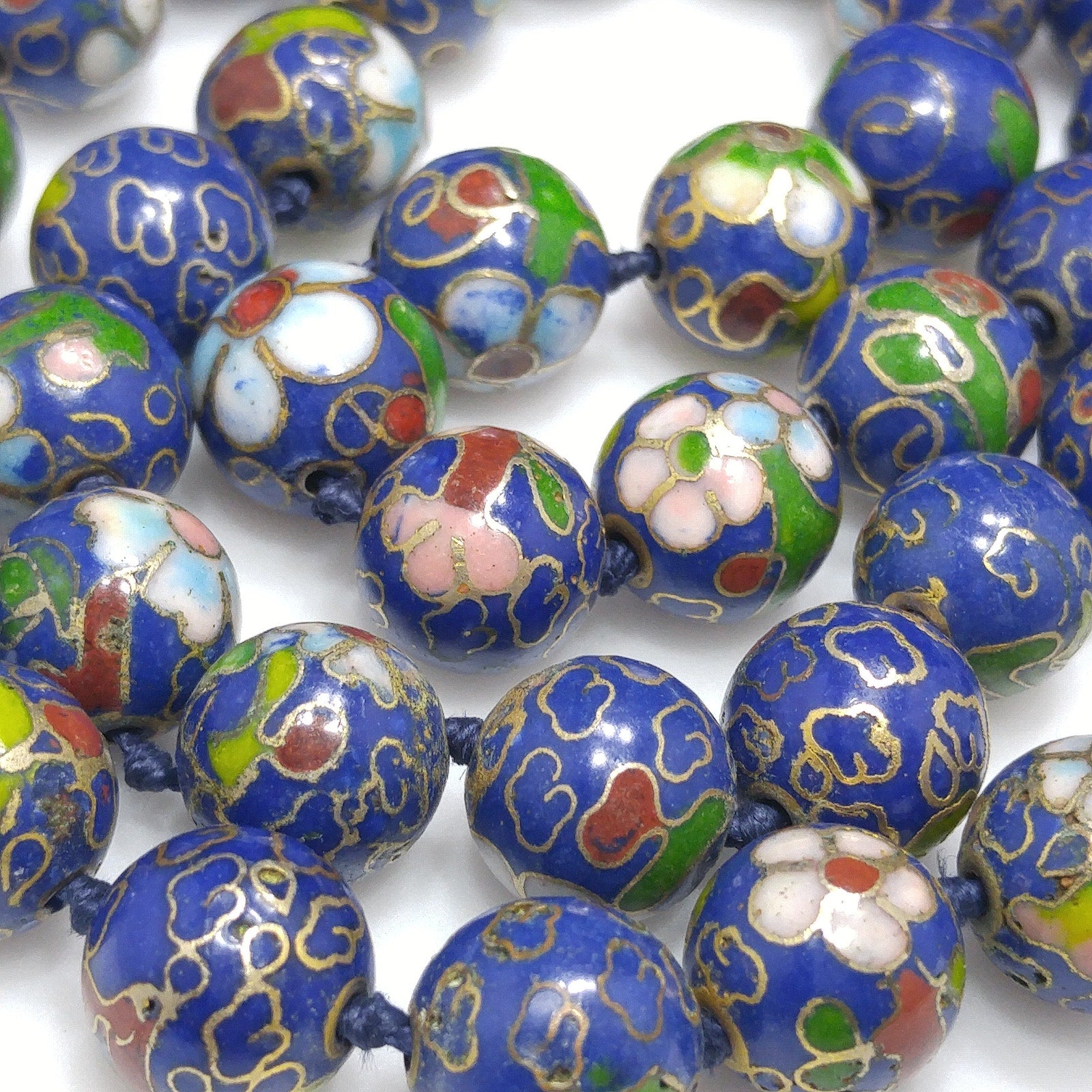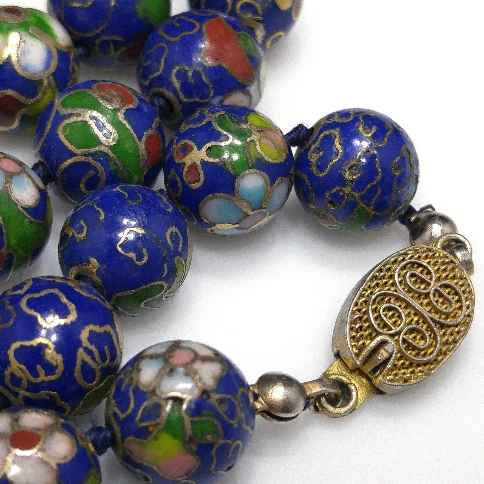 *Description: This is a beautiful cloisonne hand painted floral beaded necklace, early Chinese export, from the 1960s. The dark blue background has beautiful pink flowers, along with green leaves and red centers and blue and white flowers with red centers. There are also additional colors. Please see photos for details. The flowers are outlined in gold cloisonne on each bead and the beads are hand knotted with blue silk thread. They are approximately 10mm and the clasp is gold tone. This would be a great addition to your vintage jewelry collection or make a great vintage gift!