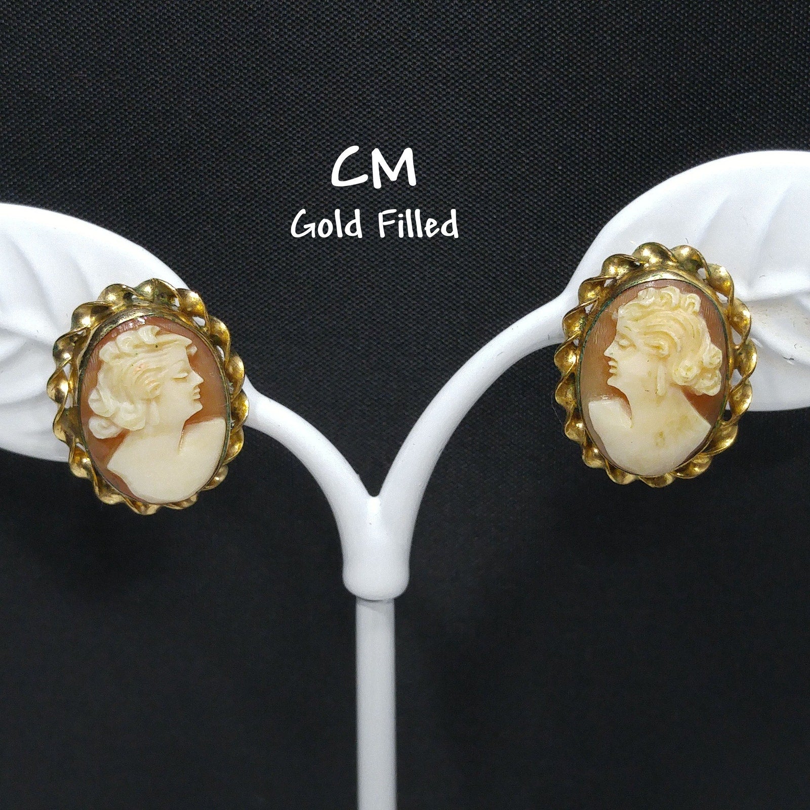 CM Carved Cameo Shell Earrings, Gold Filled, 1940s Vintage Jewelry