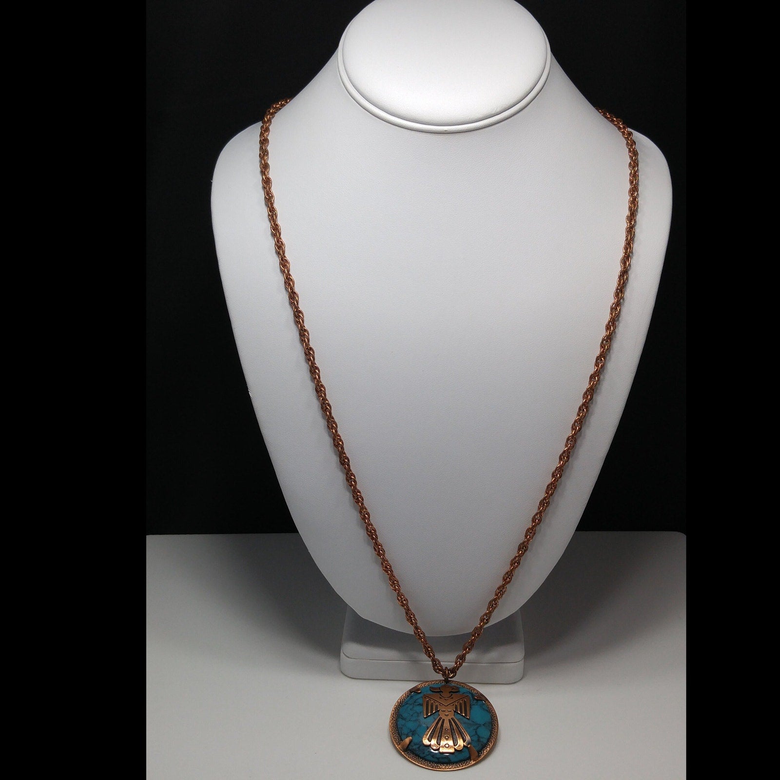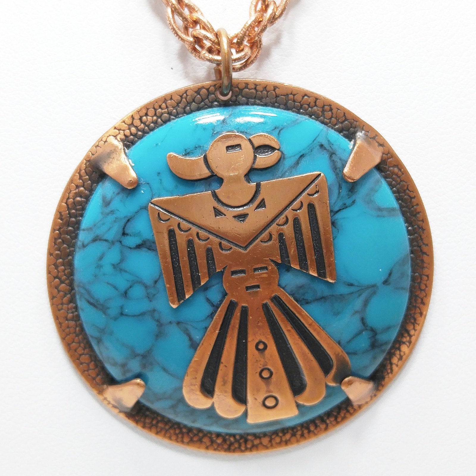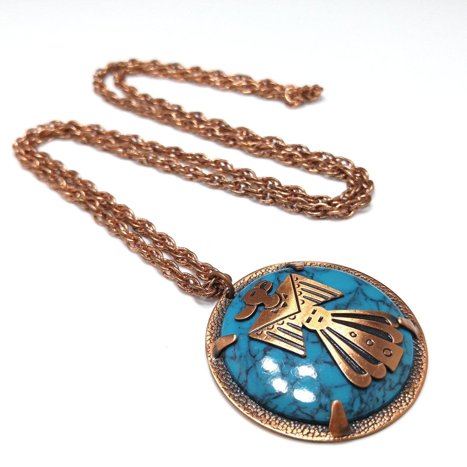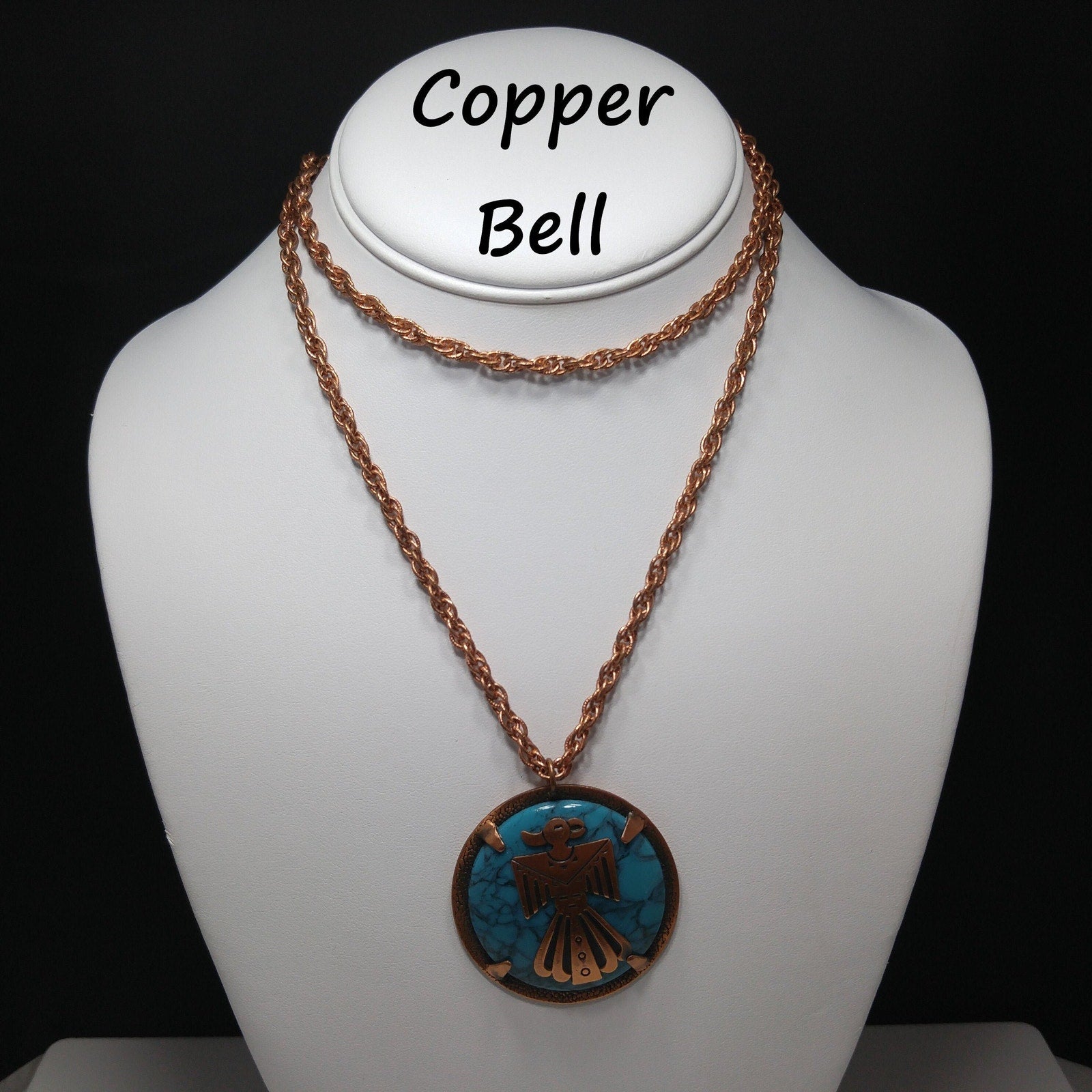*Description: This is a great Thunderbird pendant necklace made by "Copper by Bell" with the Thunderbird on top of the faux turquoise which is prong set on a copper pendant. The pendant and chain are in wonderful condition. The Thunderbird and faux turquoise is smooth to the touch. The back is stamped with the Copper by Bell and the bell image. This necklace has no clasp. It must be placed over your head to wear that is why the chain is a nice long length. This would be a great addition to your vintage jewelry collection or make a great vintage gift!