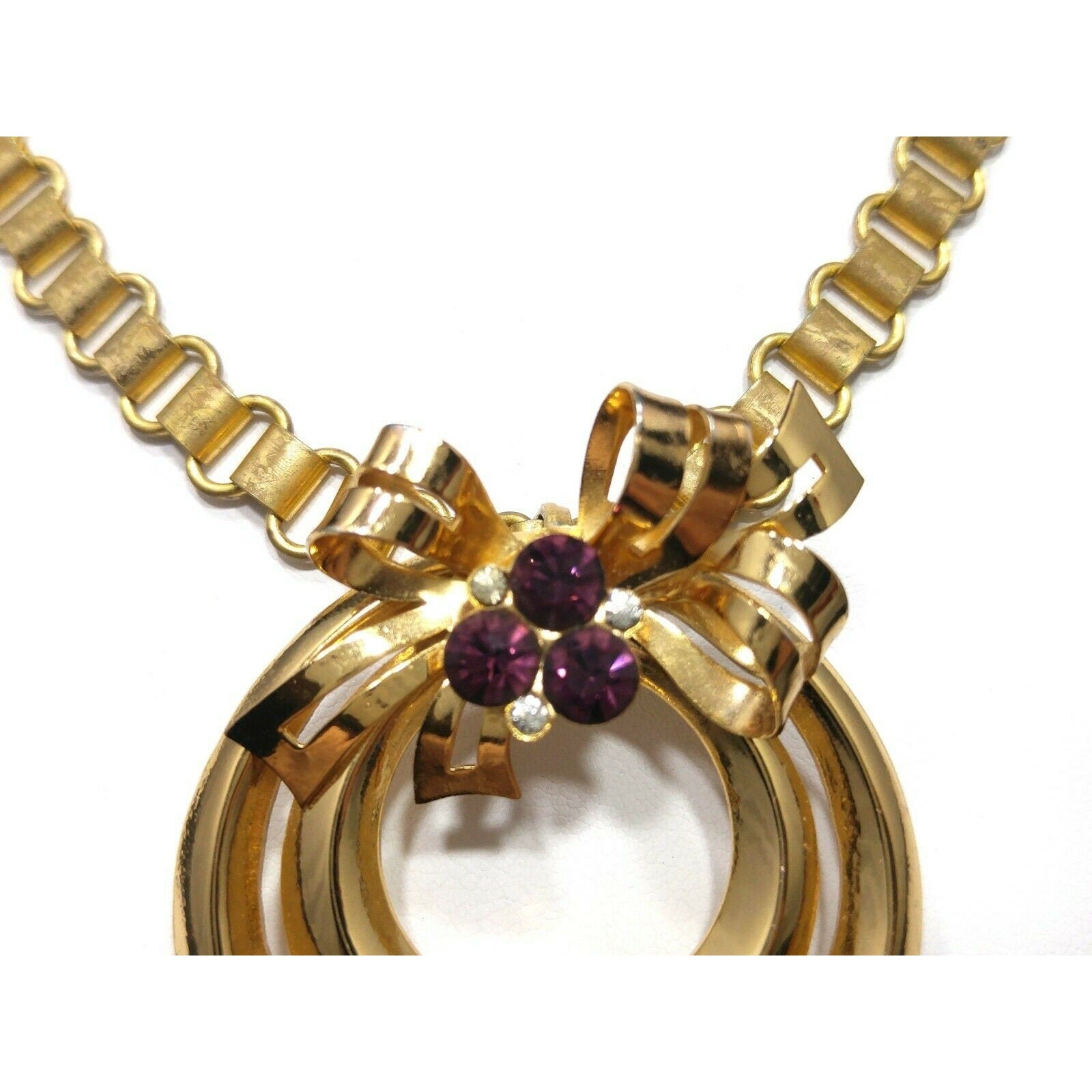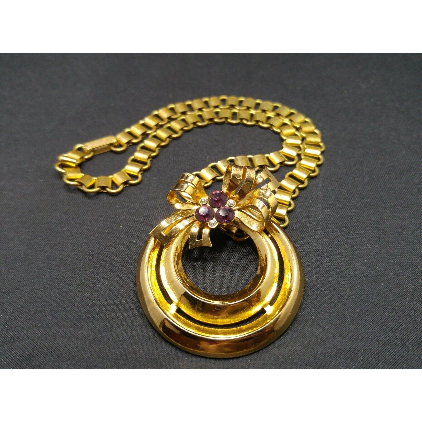 This is a stunning and rare 1948 Coro Adolph Katz design featuring a dimensional bow pendant suspended from a classic gold-plated book chain. The pendant has triple layered rings with a sculpted bow at the top, accented with three deep purple rhinestones and a single clear rhinestone. The back is stamped Coro twice—once on each circular layer—and the chain is also hallmarked Coro. A gorgeous, highly collectible mid-century piece that displays beautifully and wears even better.