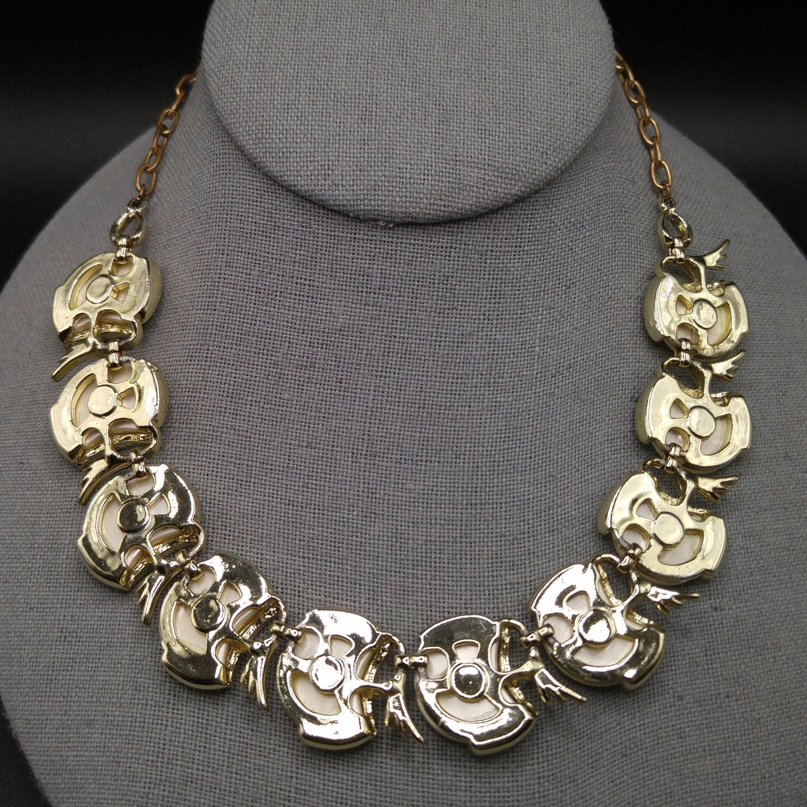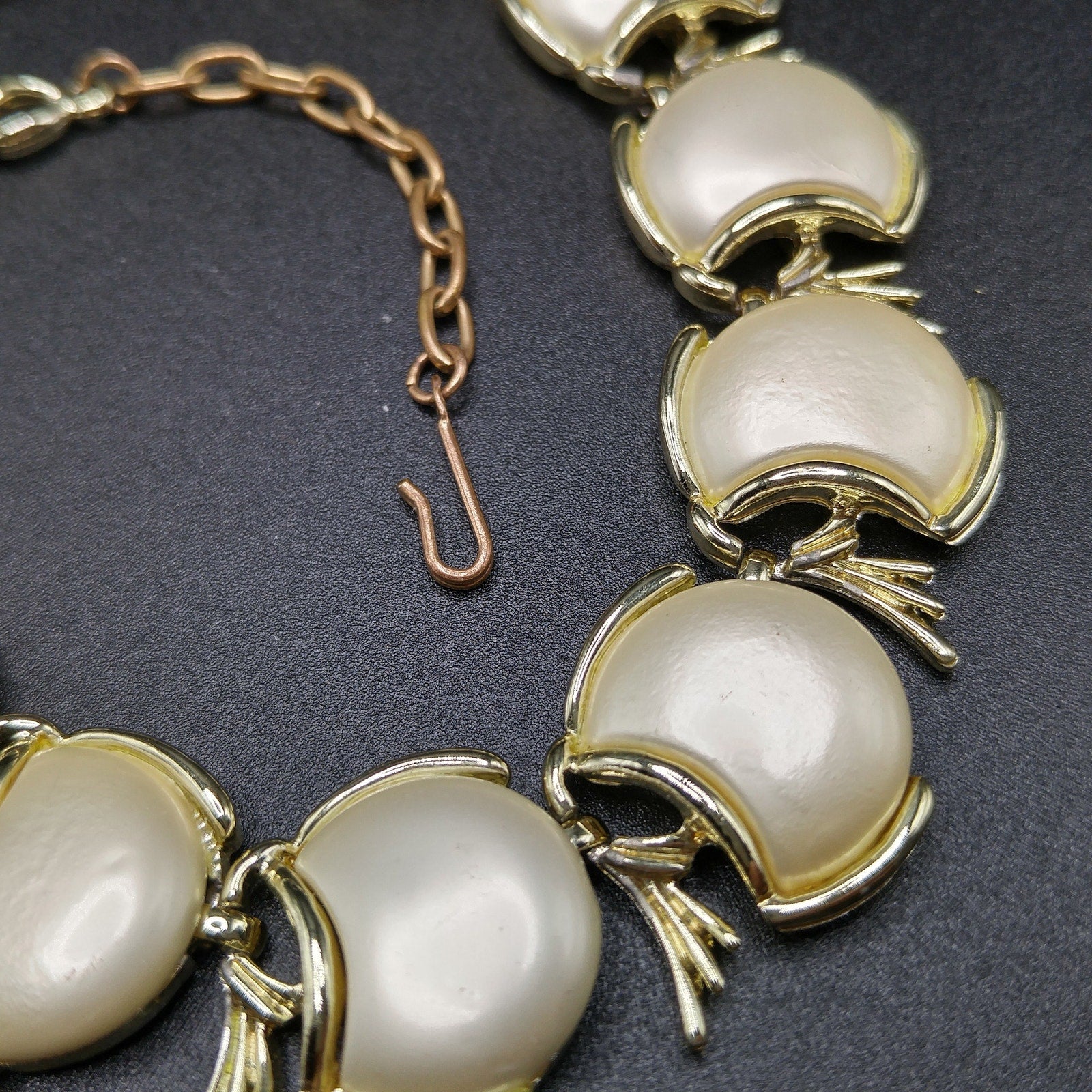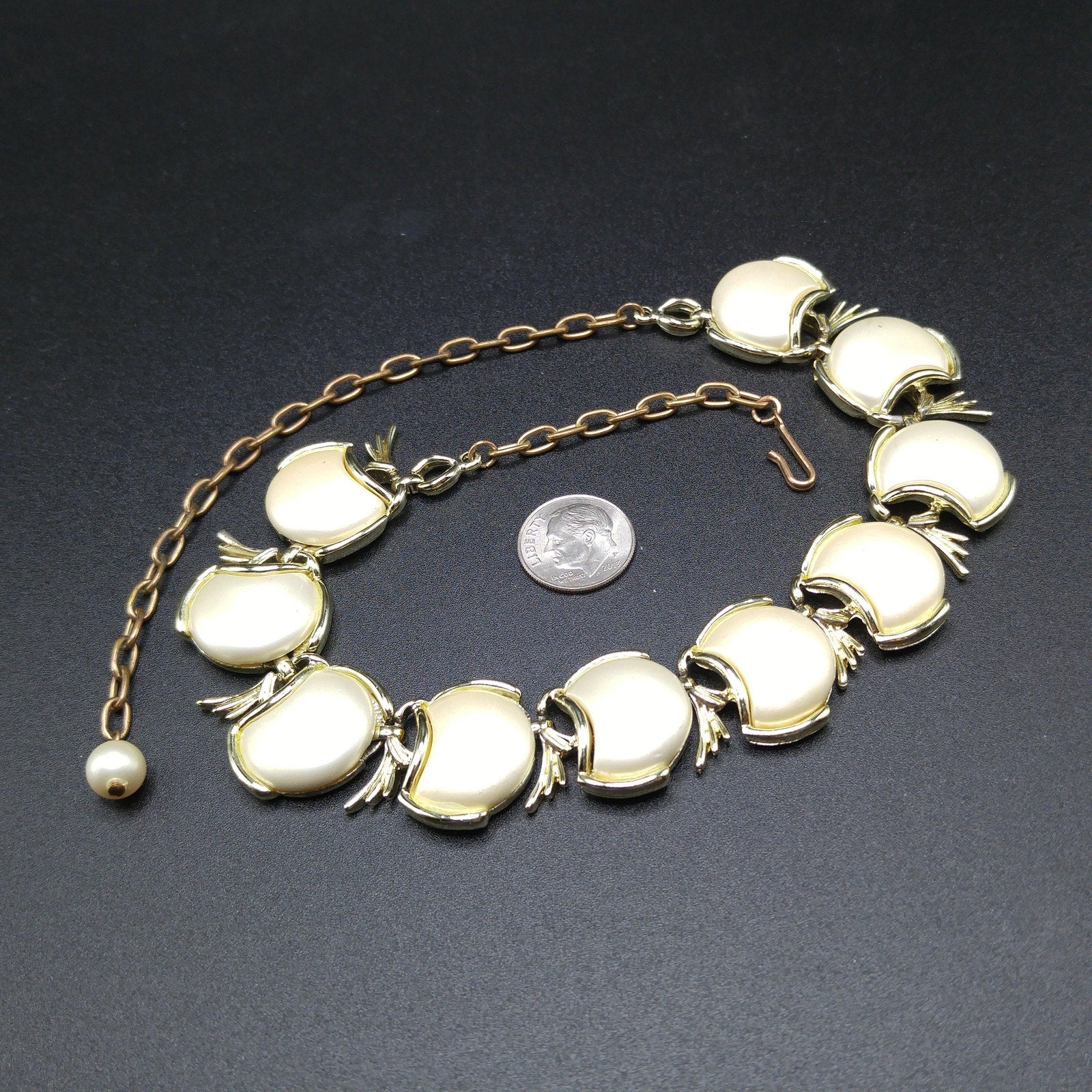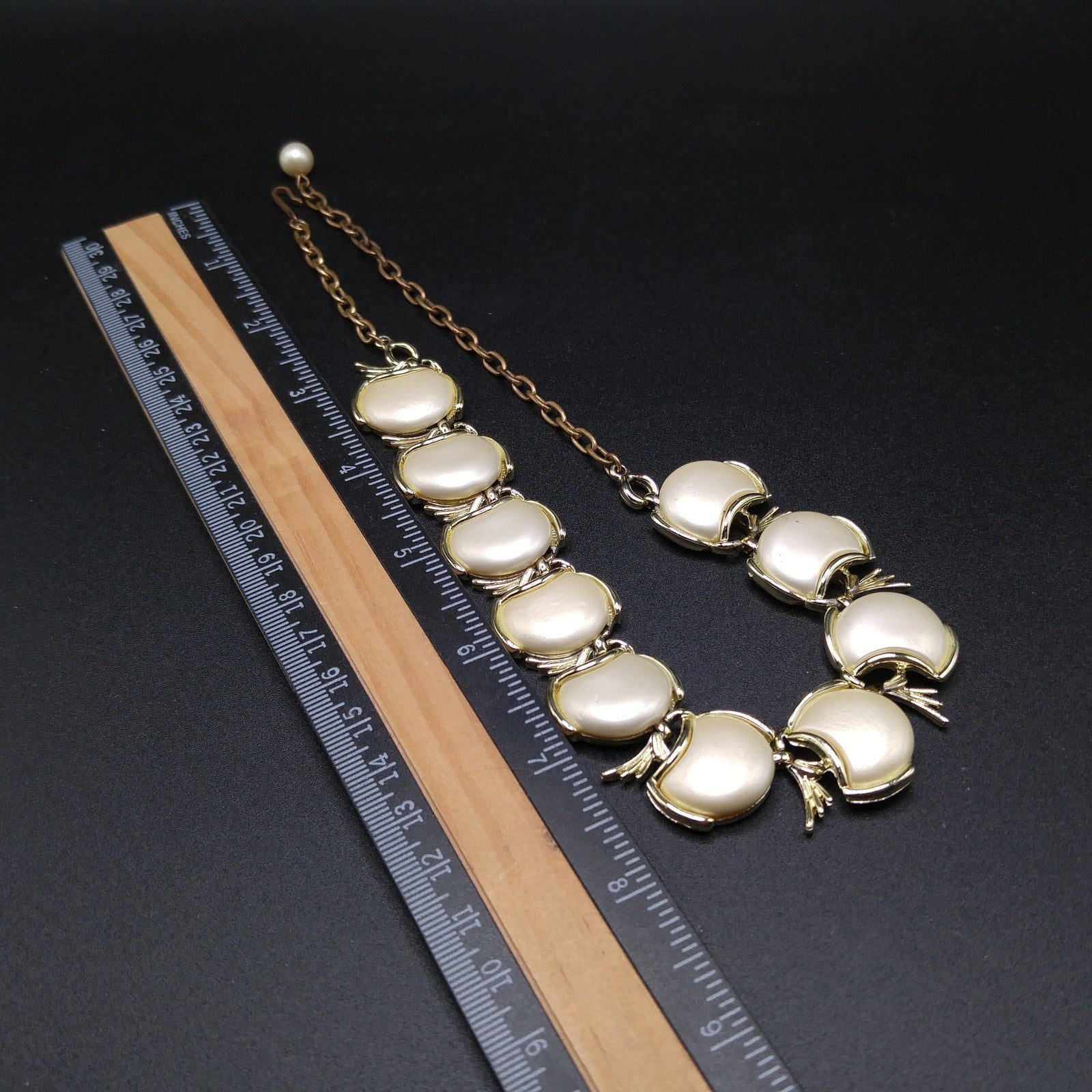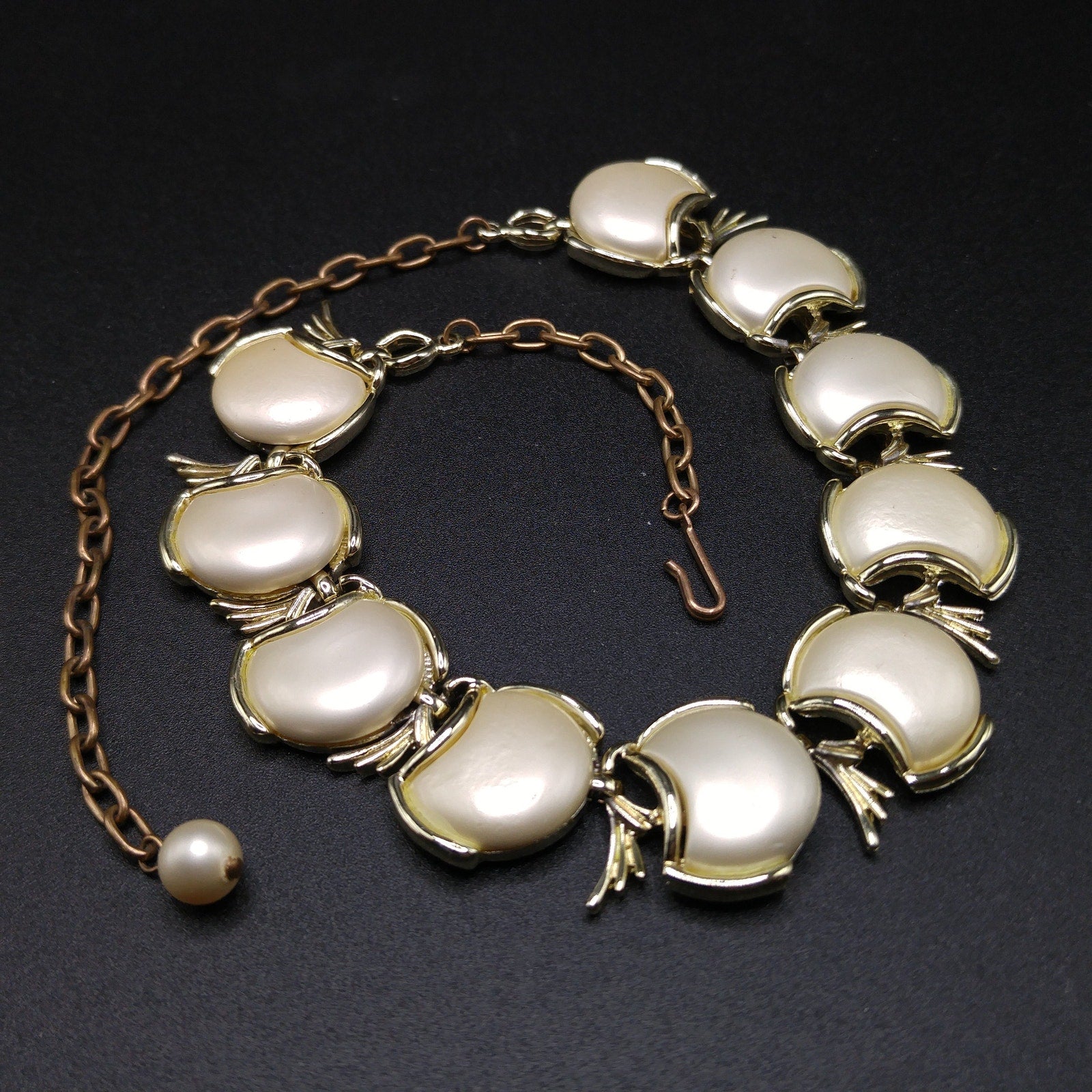 *Description: This is a great mid-century pearlescence creamy white choker necklace from the 1950s. Brass extension chain and hook; measuring up to 16 1/2 Inches. This would be a great addition to your vintage jewelry collection or make a great vintage gift!