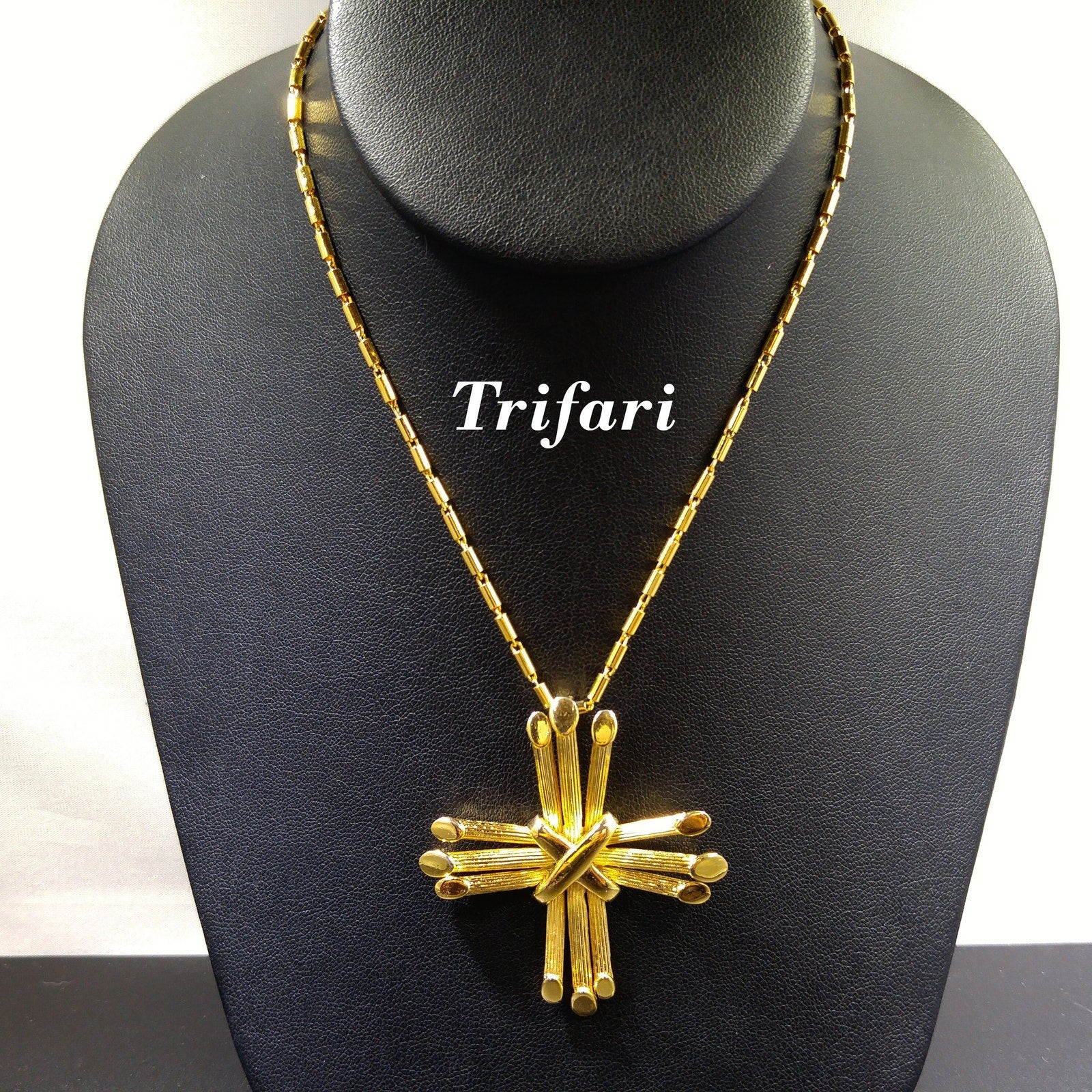 *Description: This is a classic Crown Trifari cross pendant necklace from the 1970s. The necklace is gold plated and stamped on the back of the pendant with the TRIFARI and crown above the T. The chain is a very unique and beautiful chain and looks great with the pendant. This would be a great addition to your vintage jewelry collection or make a great vintage gift!