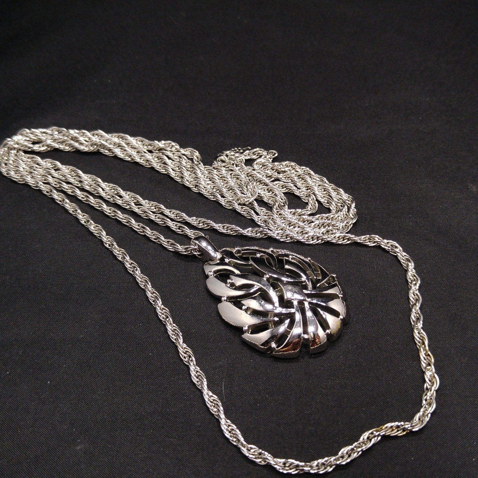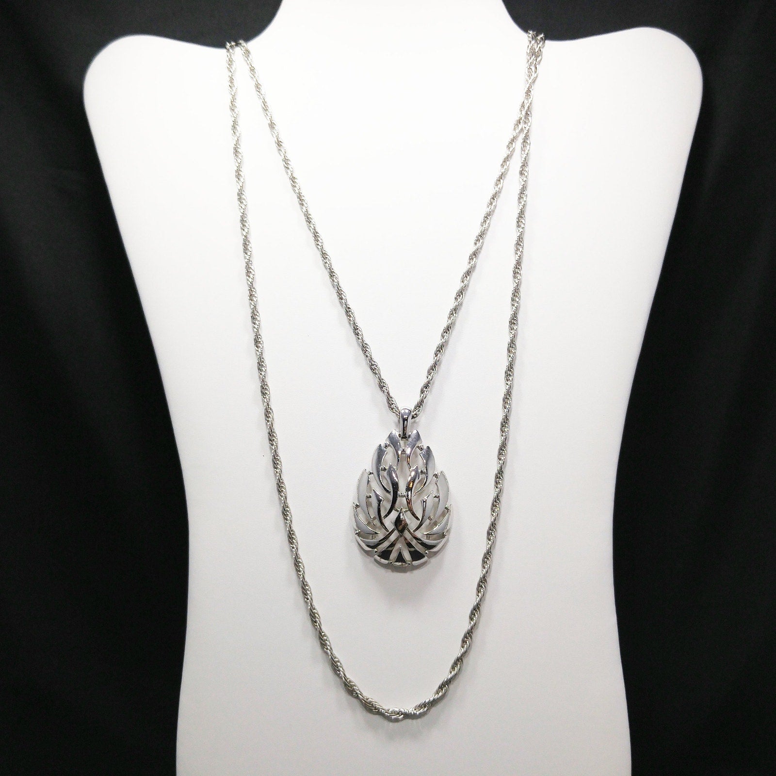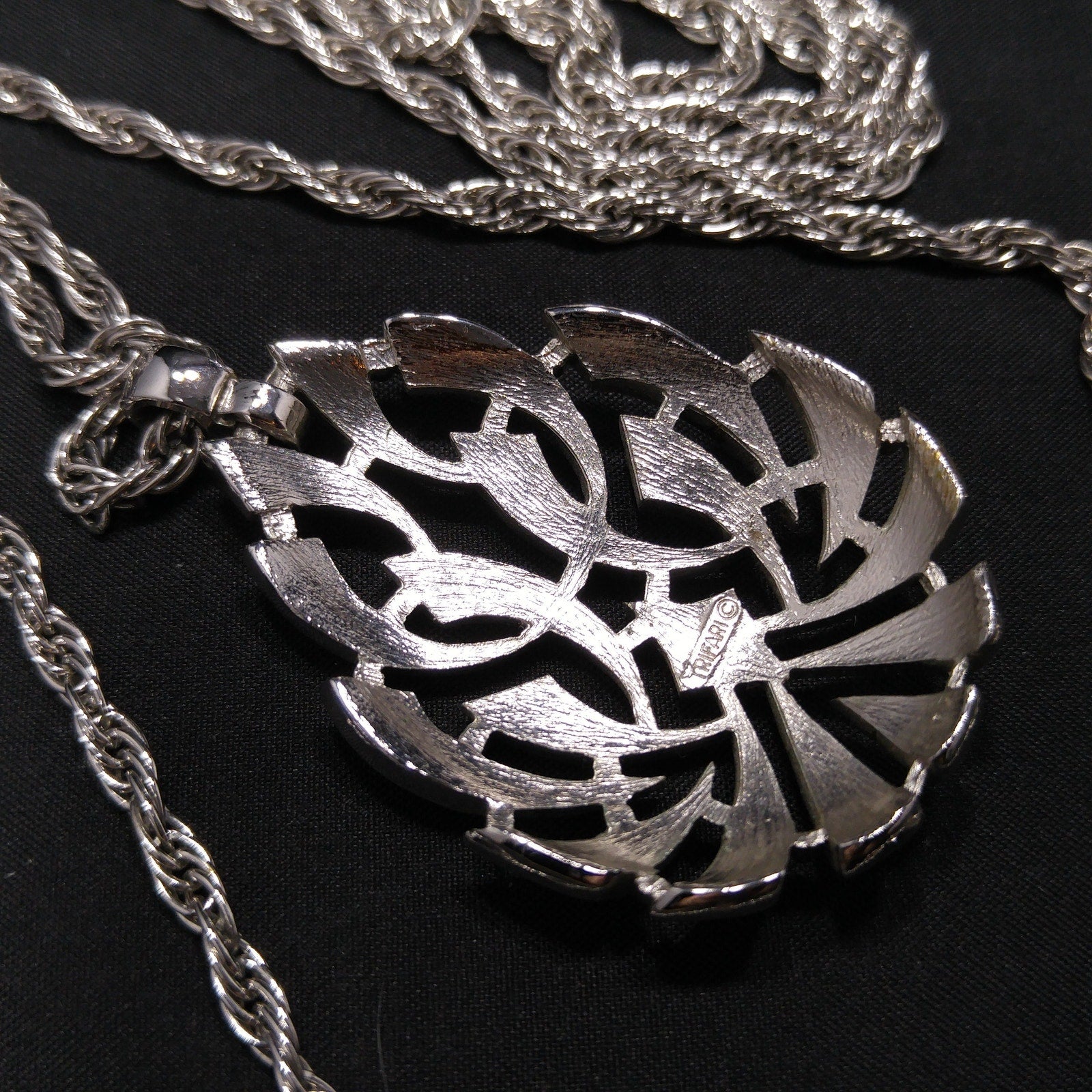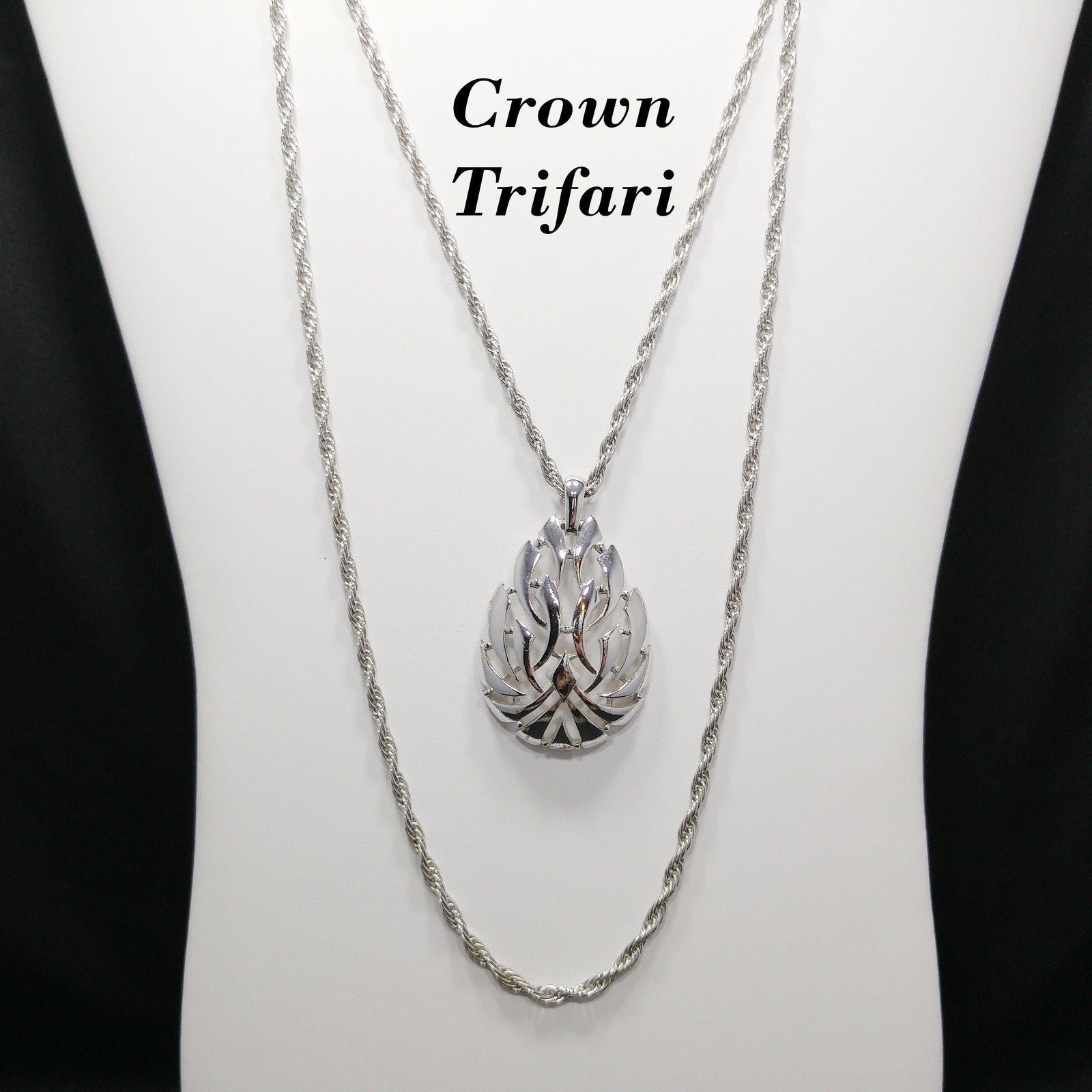*Description: This is a beautiful Crown Trifari rhodium plated necklace with two strands of chain and a smooth teardrop pendant from the 1960s. The pendant has open work and is signed Trifari with the crown on the back. The rope chain is in a 32 inch and 23 inch length which give the necklace a layered look. One of the great benefits of vintage Crown Trifari is in the quality of the piece. Given as a gift, it looks almost as new and fresh today as in the 1960s. This would be a great addition to your vintage jewelry collection or make a great vintage gift!