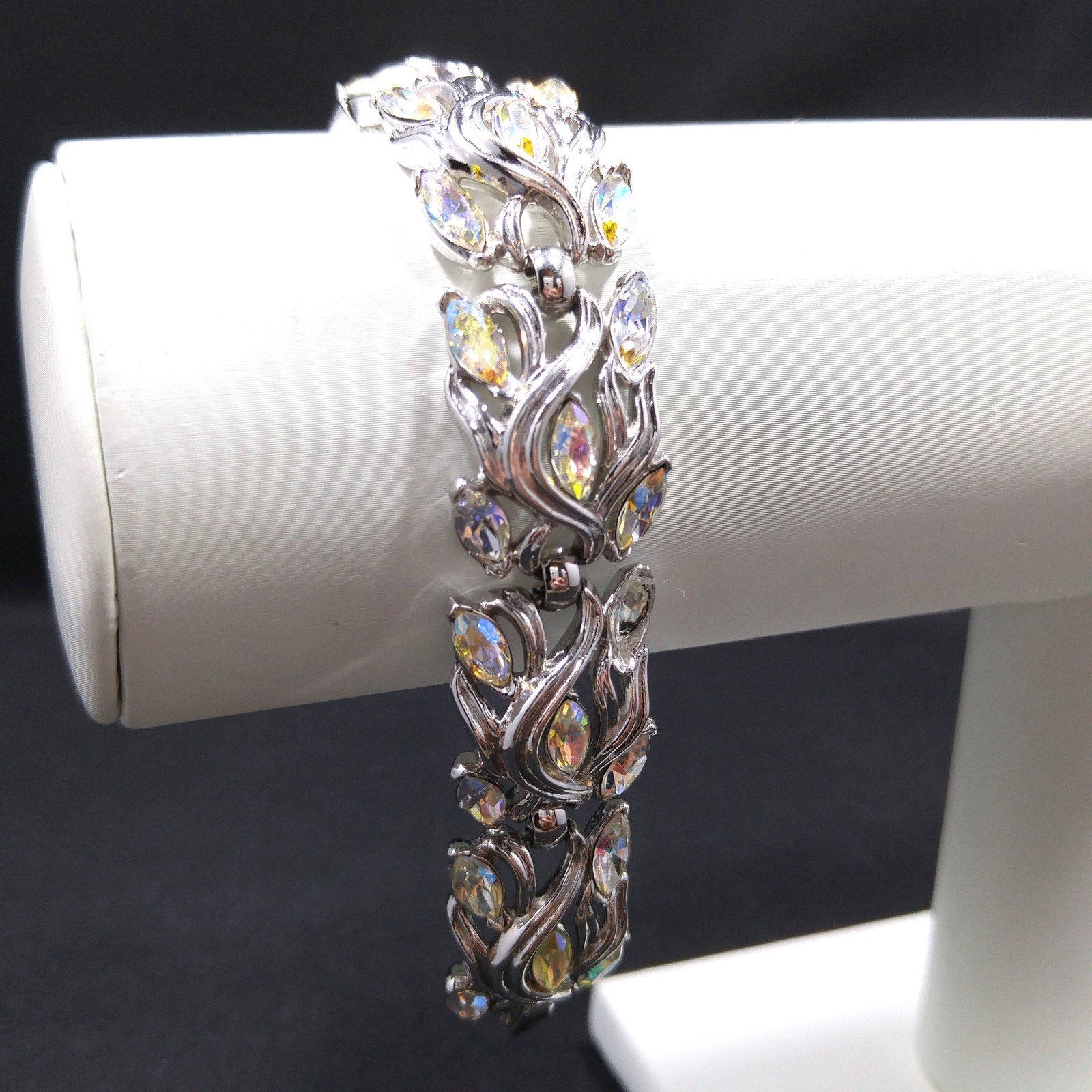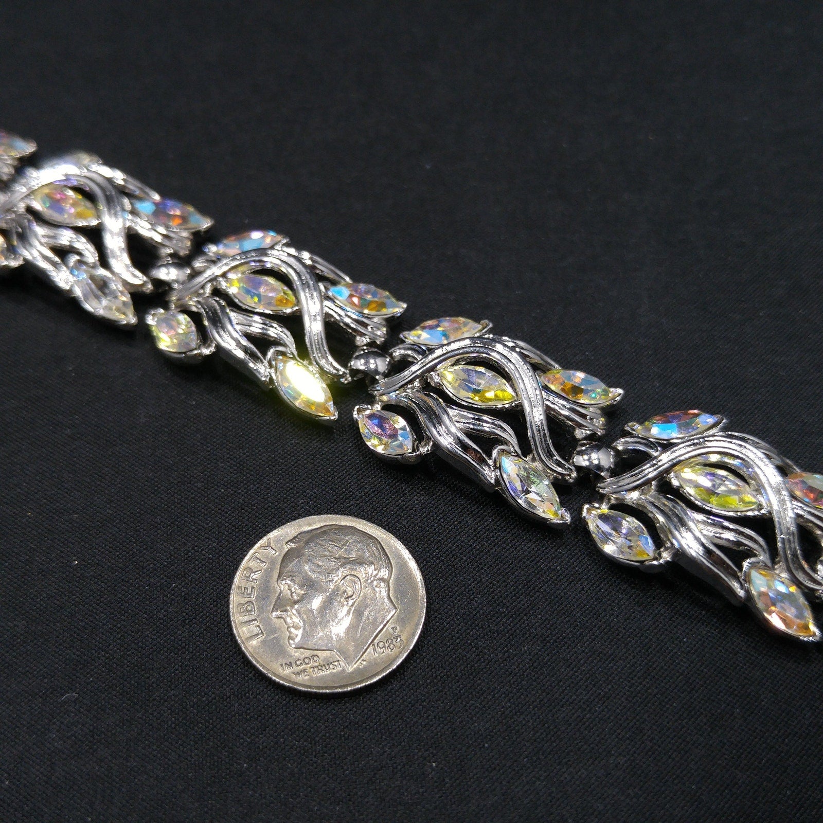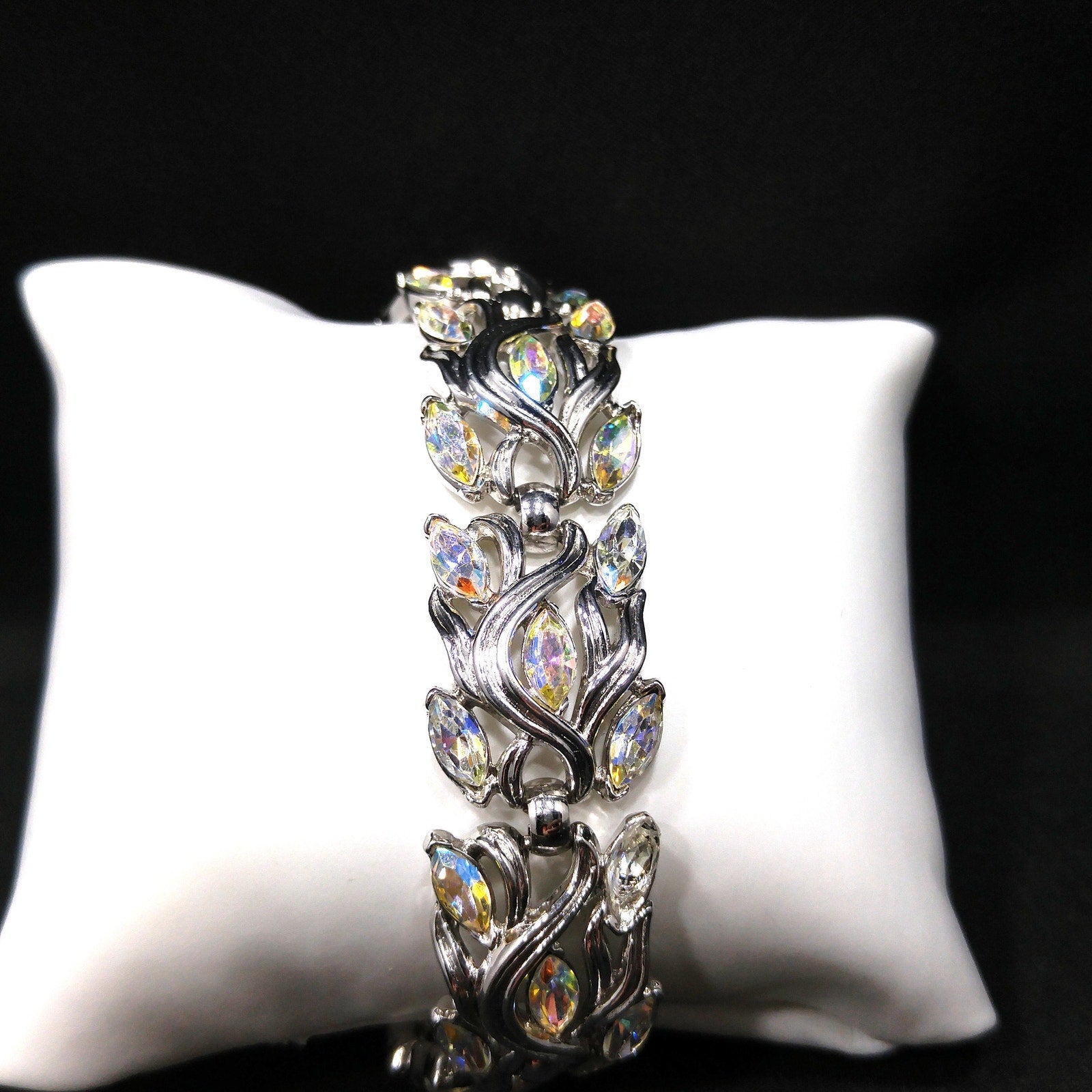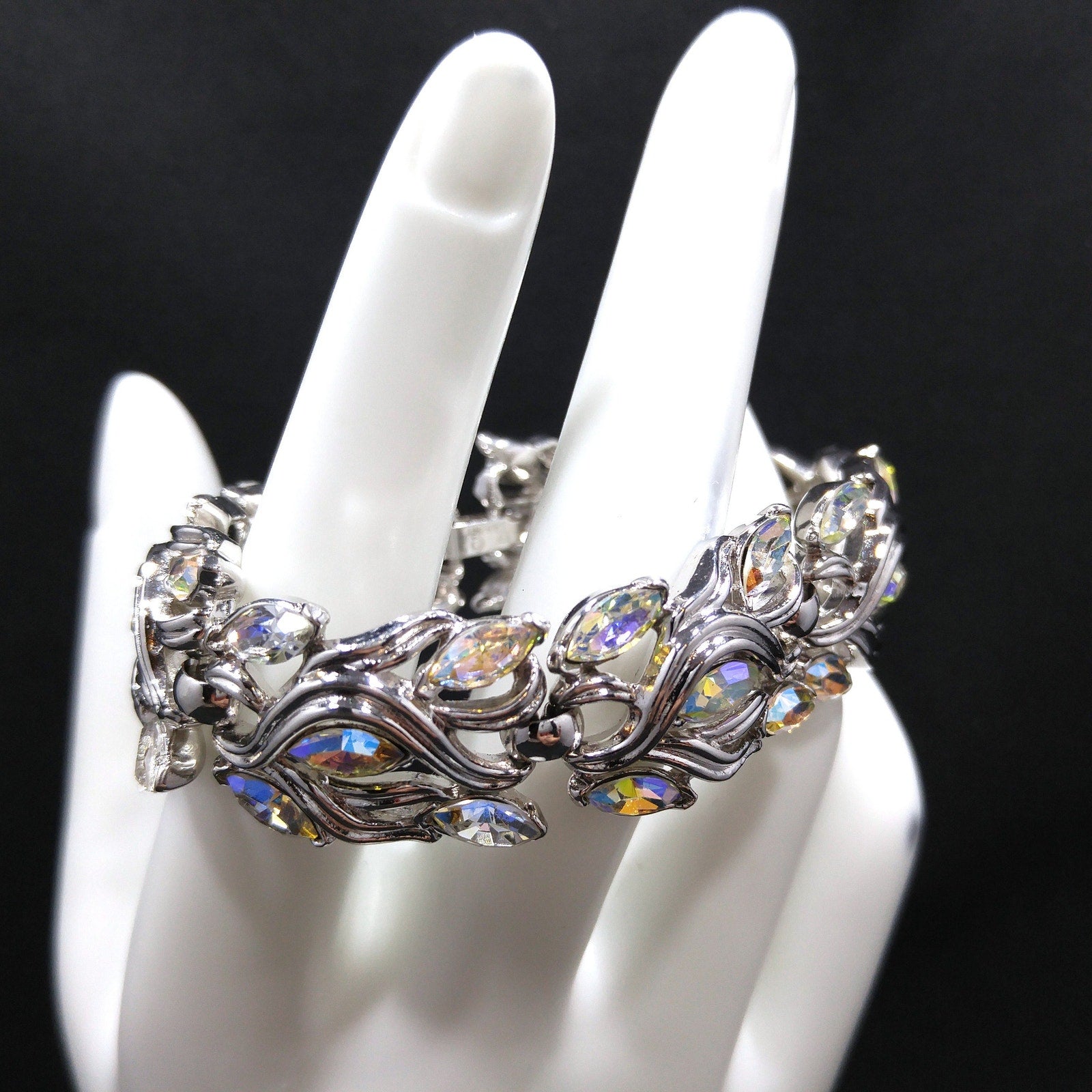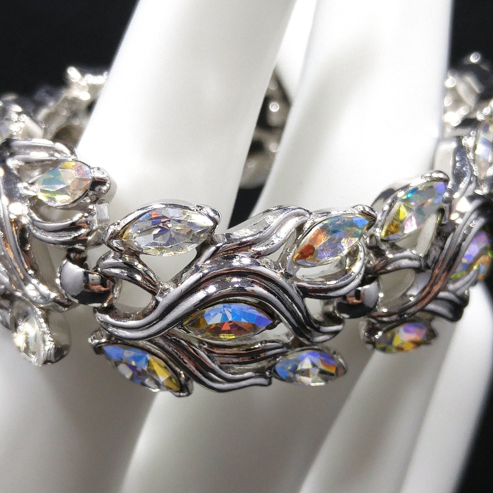 *Description: This is a beautiful Crown Trifari wedding bracelet with aurora borealis and clear marquise cut rhinestones on a rhodium plated background from the late 1950s to 1960s. The rhinestones are marquise cut and would be perfect for a wedding or bridal accessory. It would also make a great wedding gift. This bracelet is designer quality and would be a great addition to your vintage jewelry collection or make a great vintage gift!