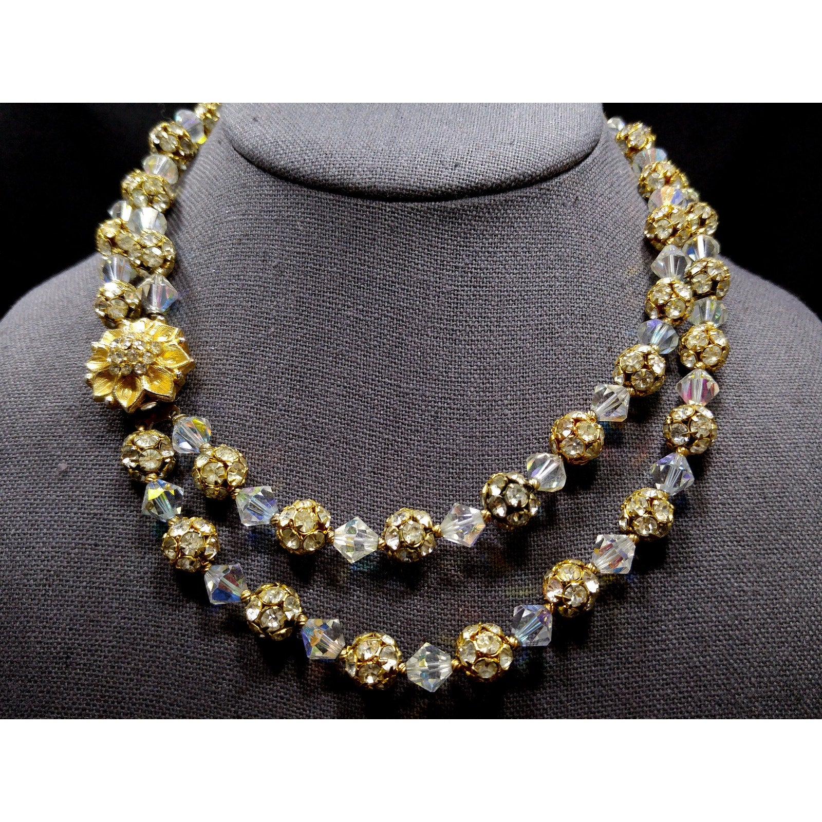 Crystal & Rhinestone Bead Two Strand Necklace, Gold Plated Rhinestone Clasp, 1960s Vintage Jewelry