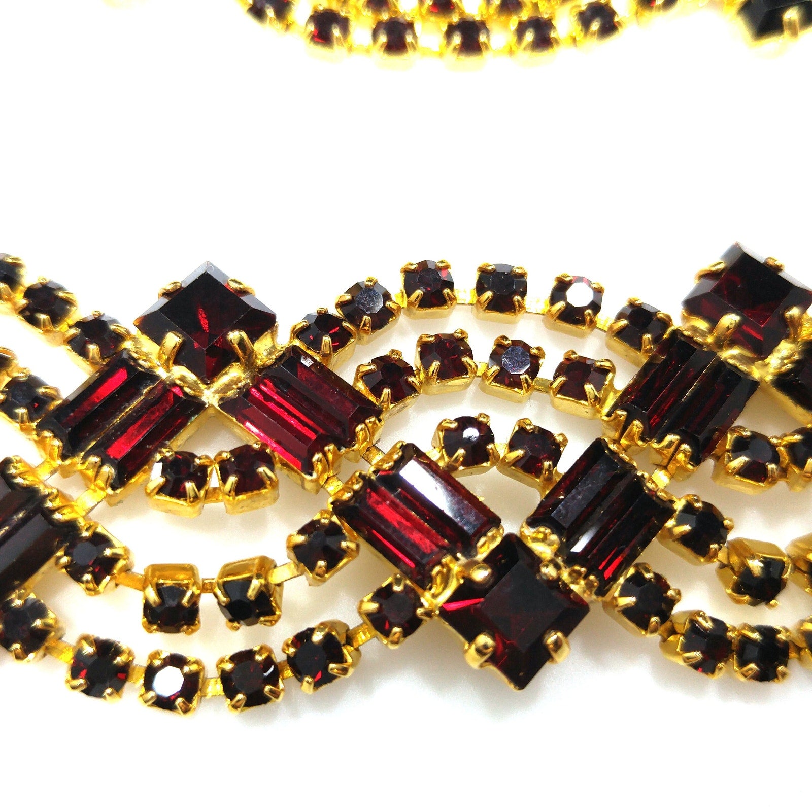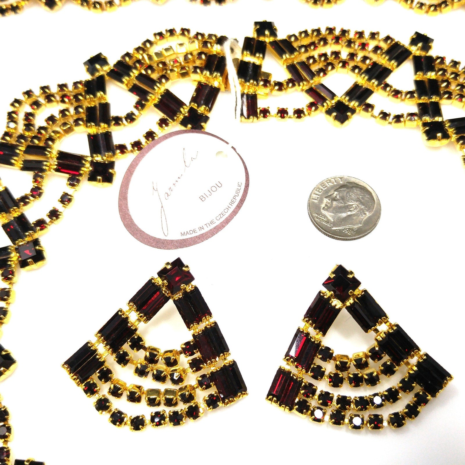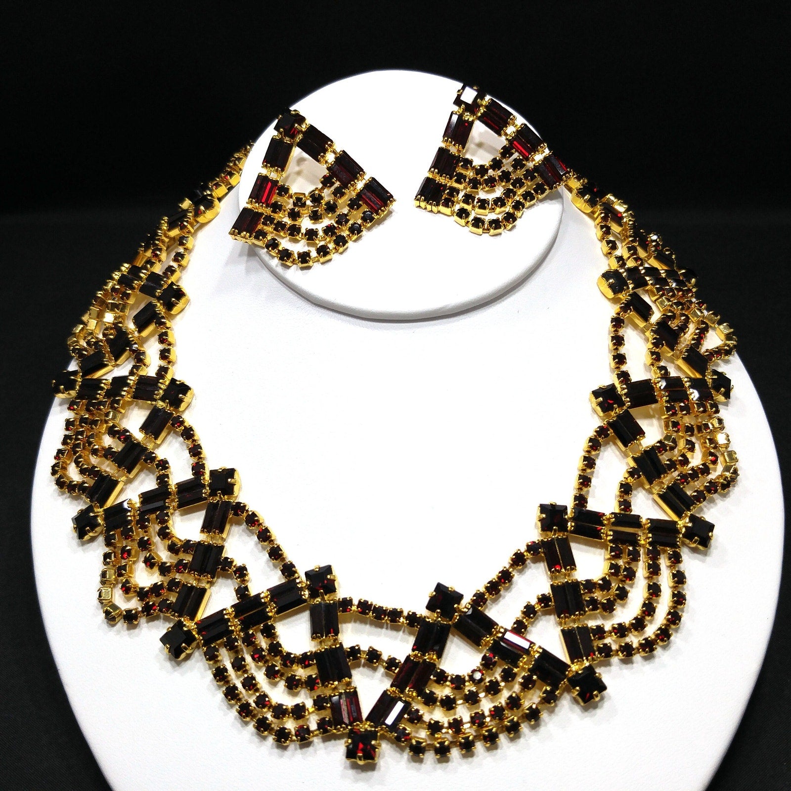 *Description: This is a gorgeous Czech Republic faux garnet red rhinestone necklace, bracelet, and post earrings from the 1990s. The necklace is a wide prong set rhinestone collar necklace and the matching bracelet is also slightly curved and equally wide. The post earrings match the bracelet and necklace and each of the rhinestones are prong set. The necklace has the original paper tags listing it as a three piece set. It appears to have never been worn and it would be a great addition to your vintage jewelry collection or make a great vintage gift!