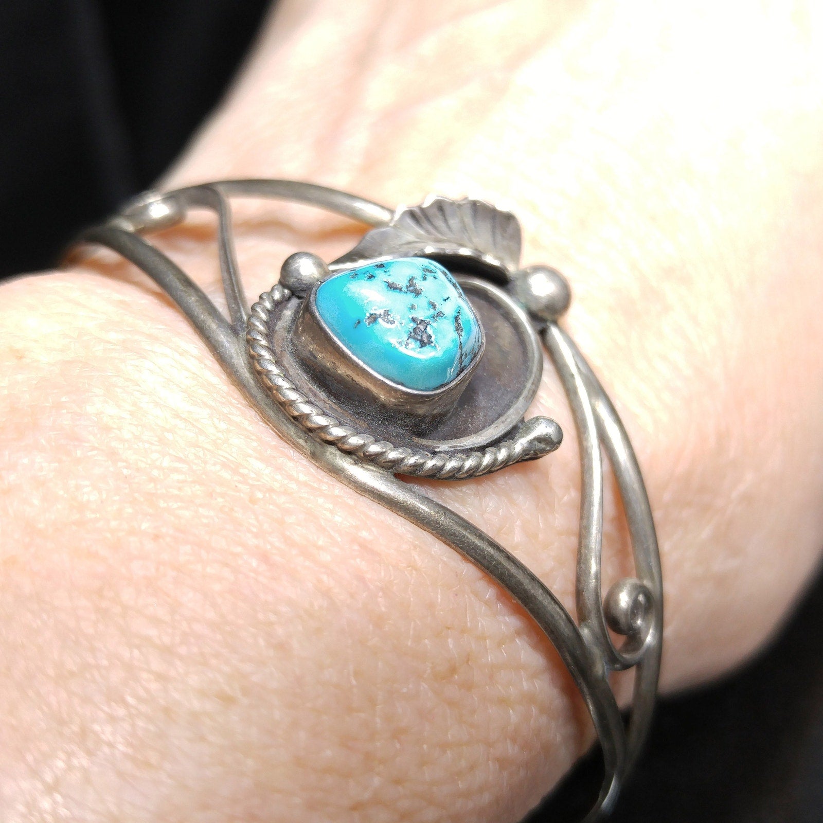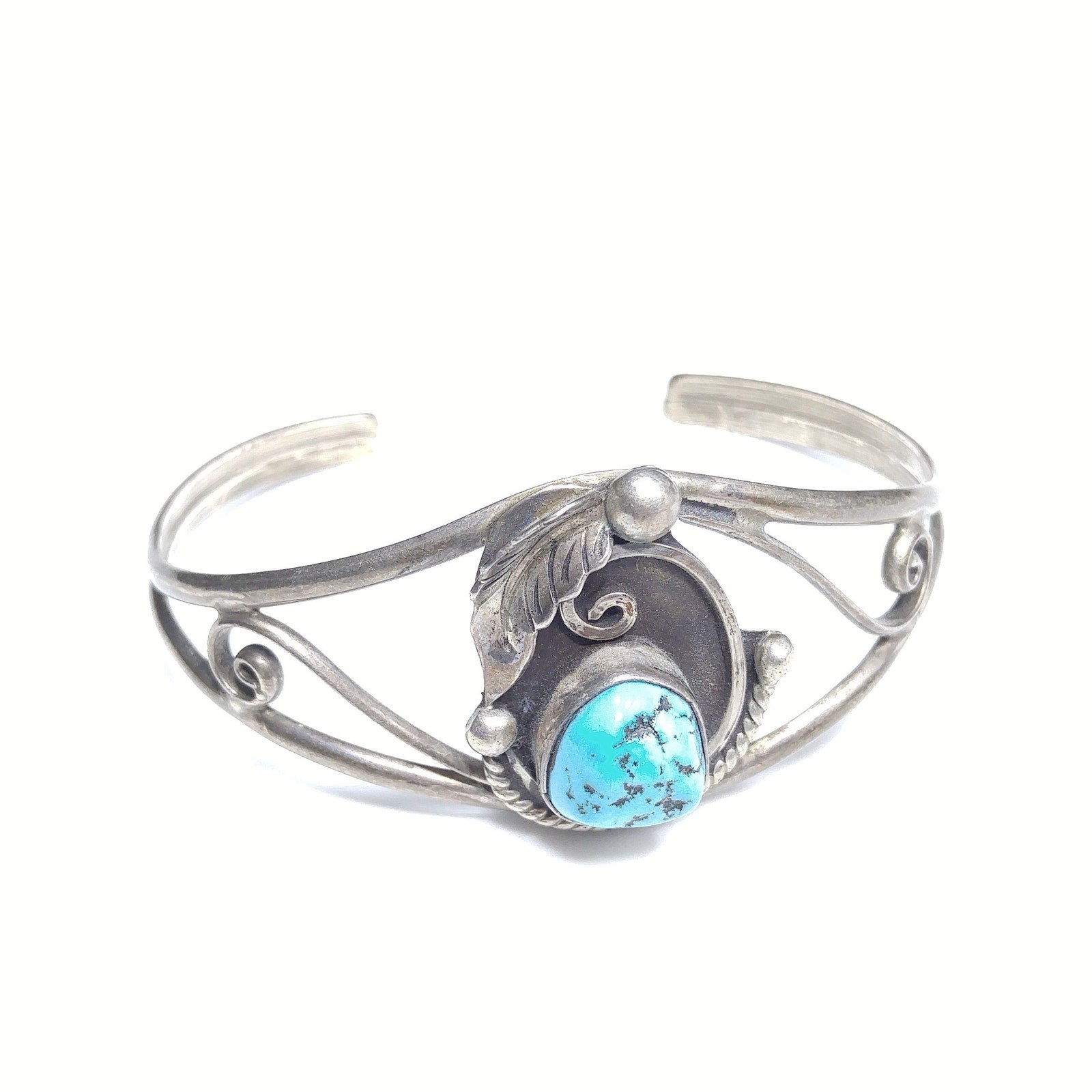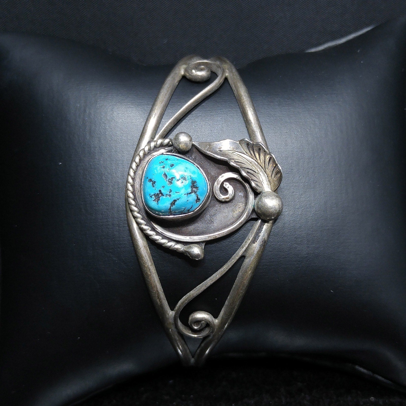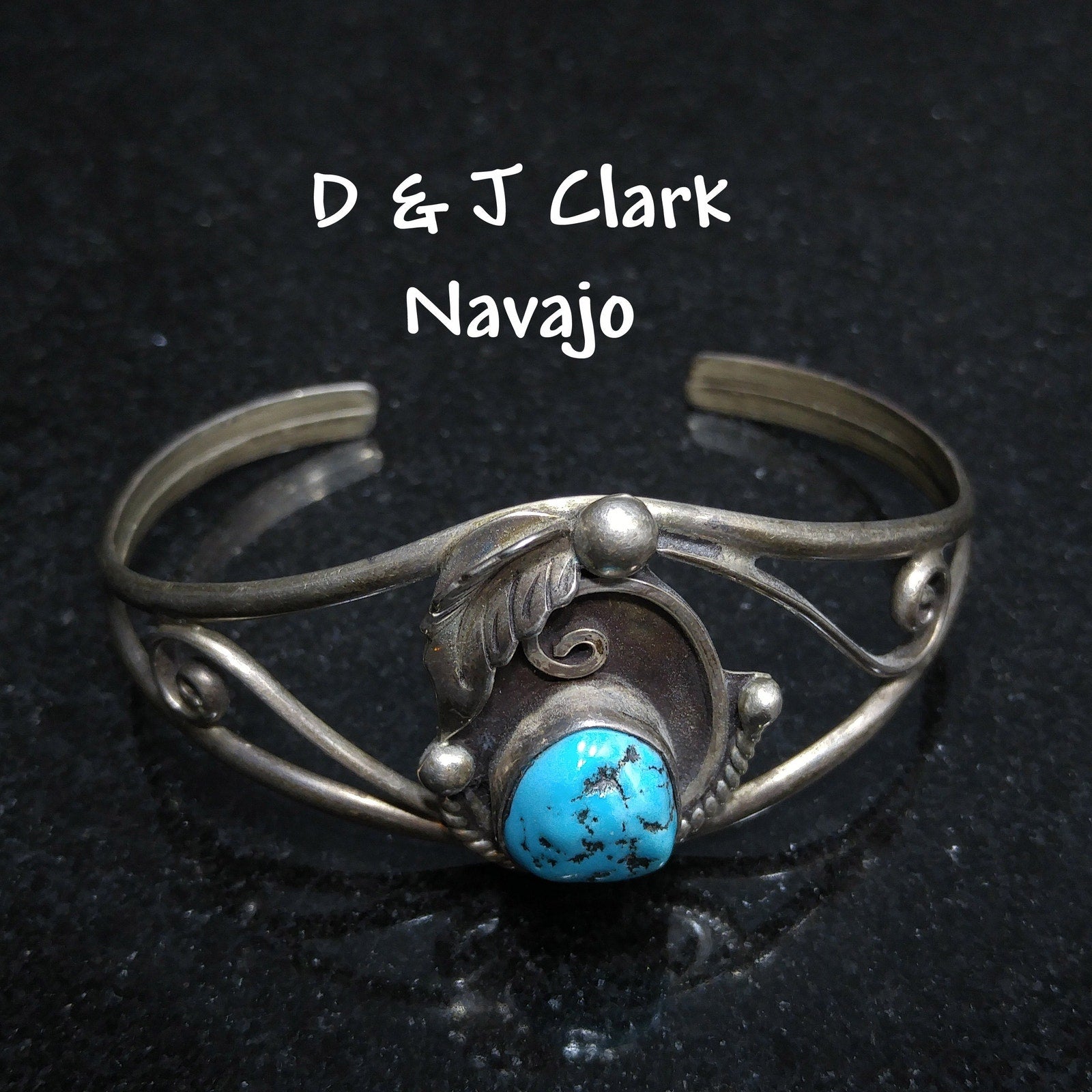 *Description: This is a beautiful D&J CLARK Vintage Navajo Sterling Silver Turquoise Leaf Applique Cuff Bracelet. It has a turquoise gemstone approximately 1/2 Inch in length & width. The unique cuff bracelet is signed on the back D & J Clark Navajo. I tested it for silver and it did test sterling. This would be a great addition to your vintage jewelry collection or make an excellent vintage gift.