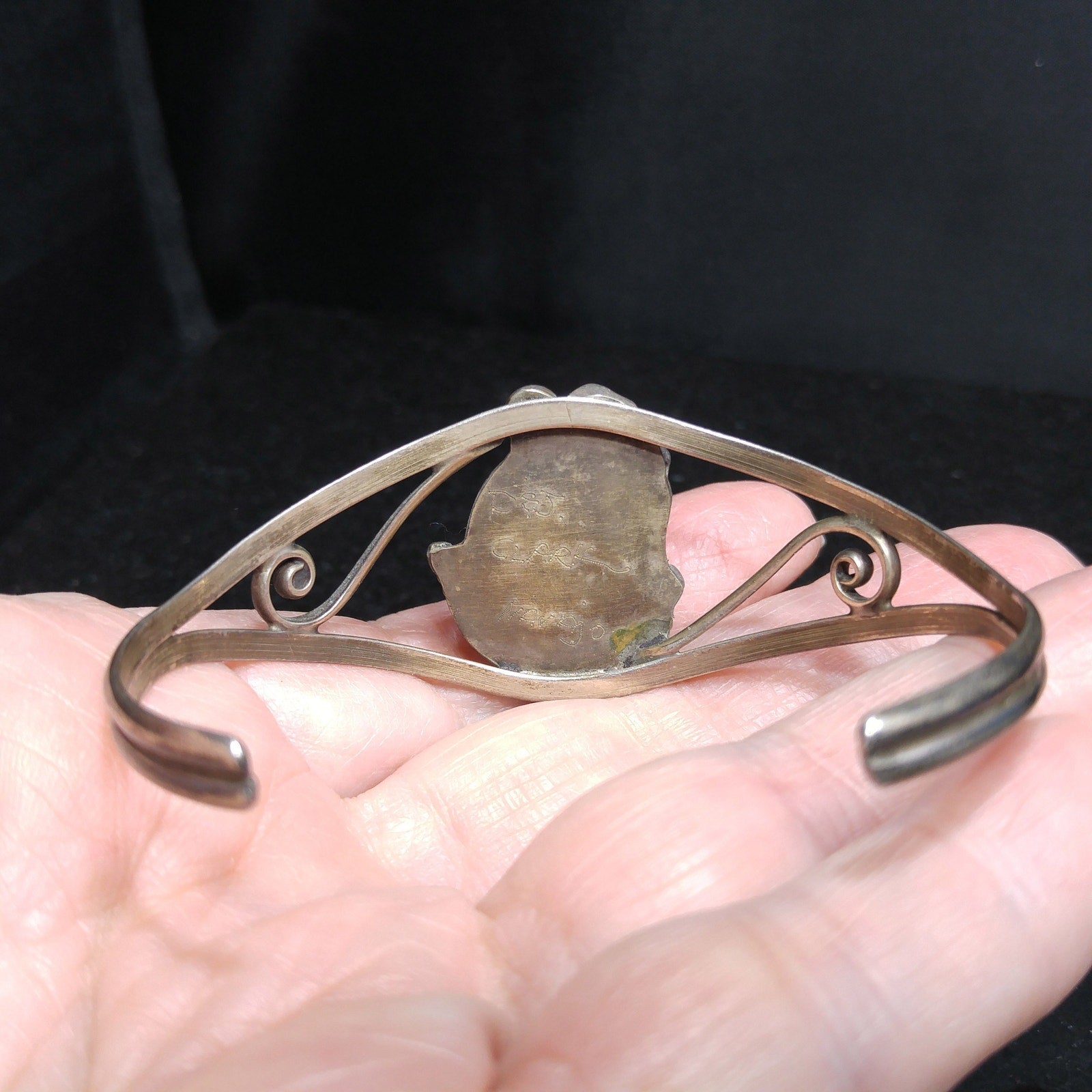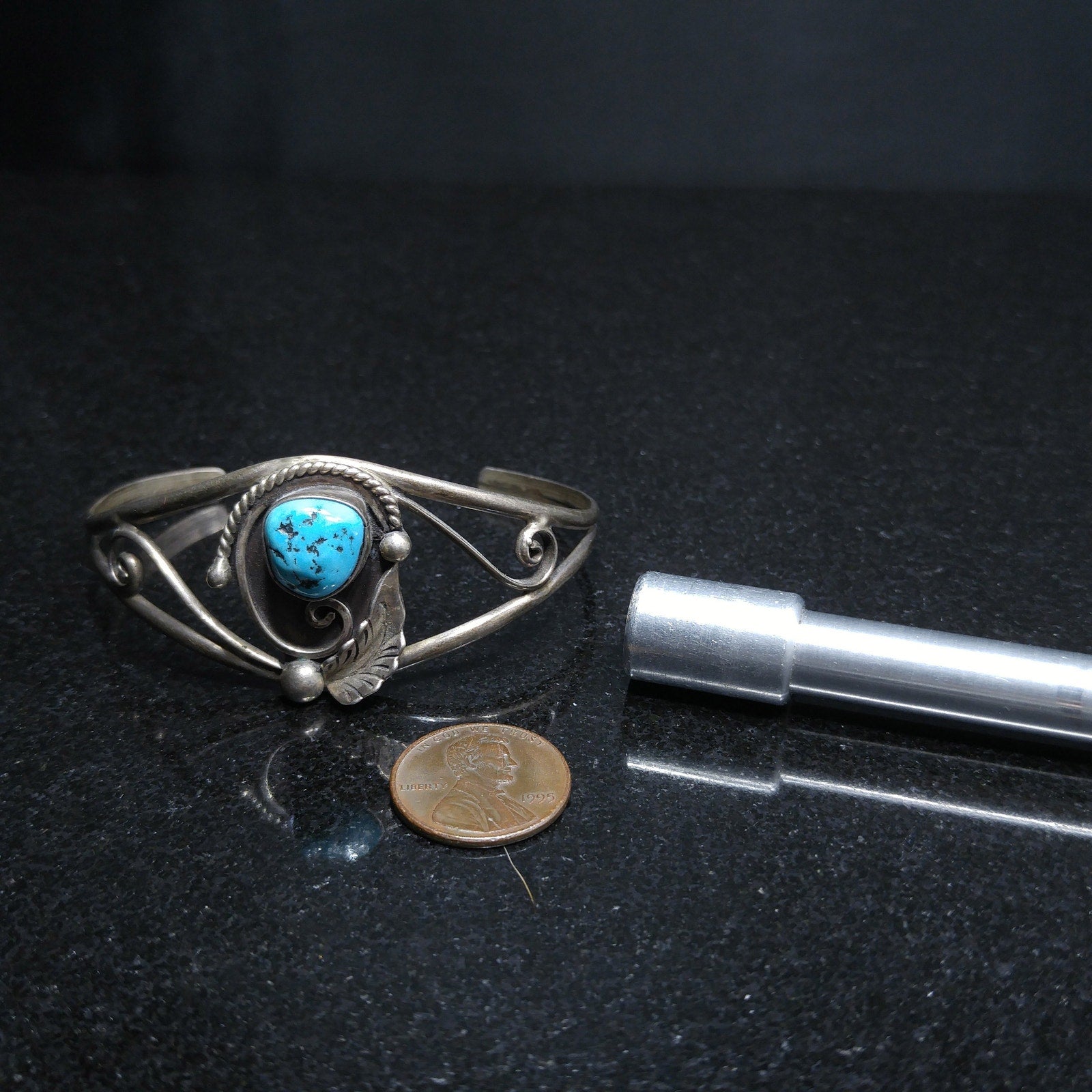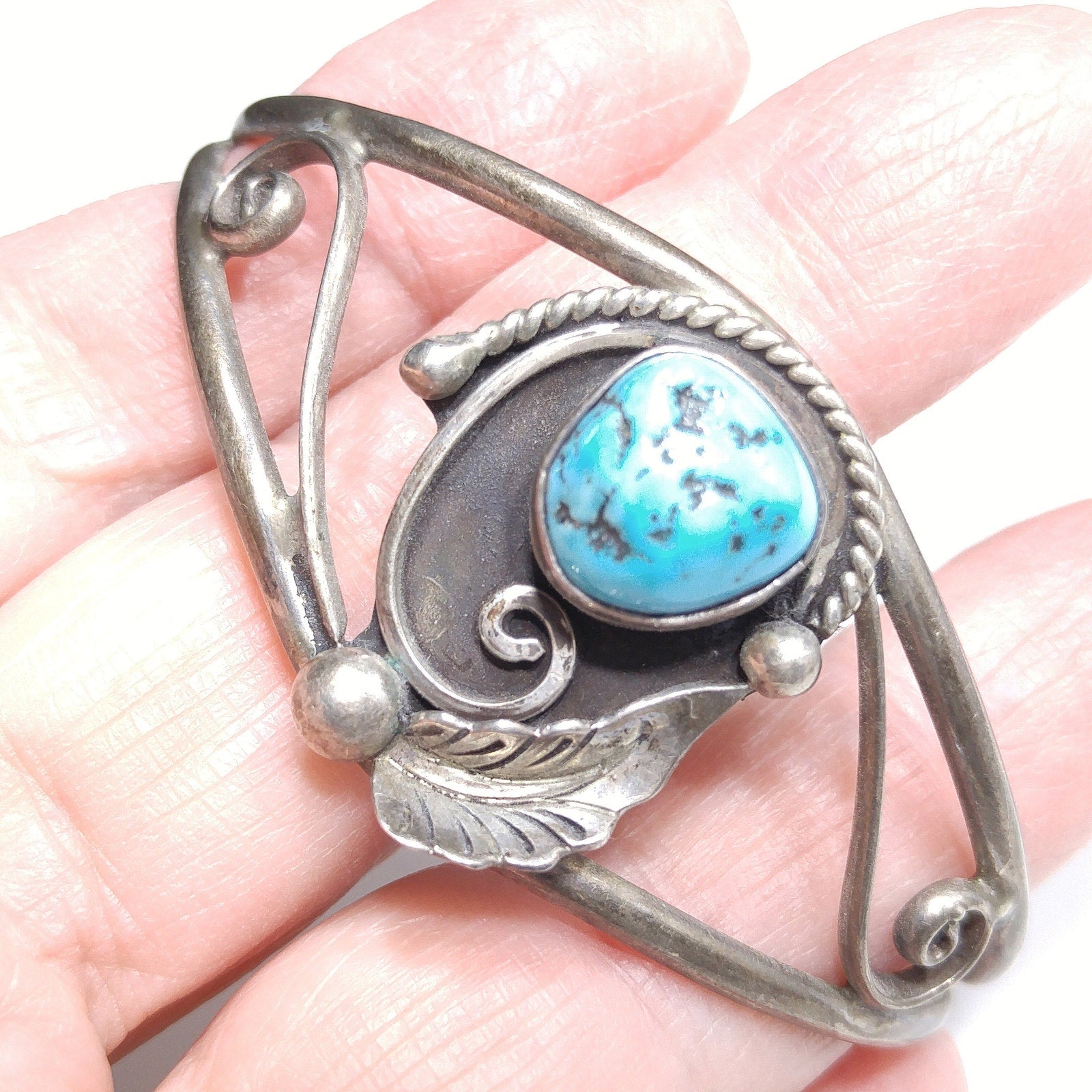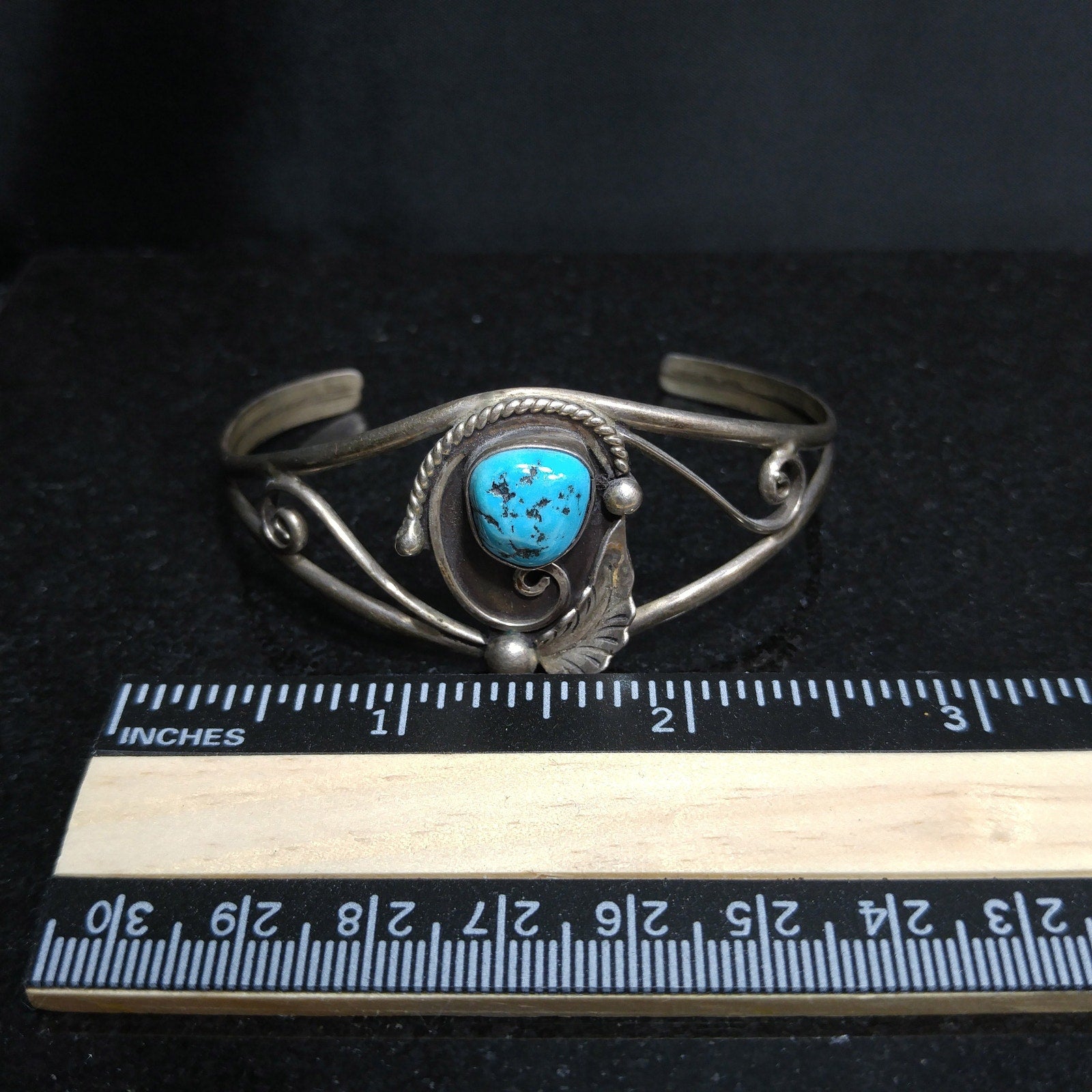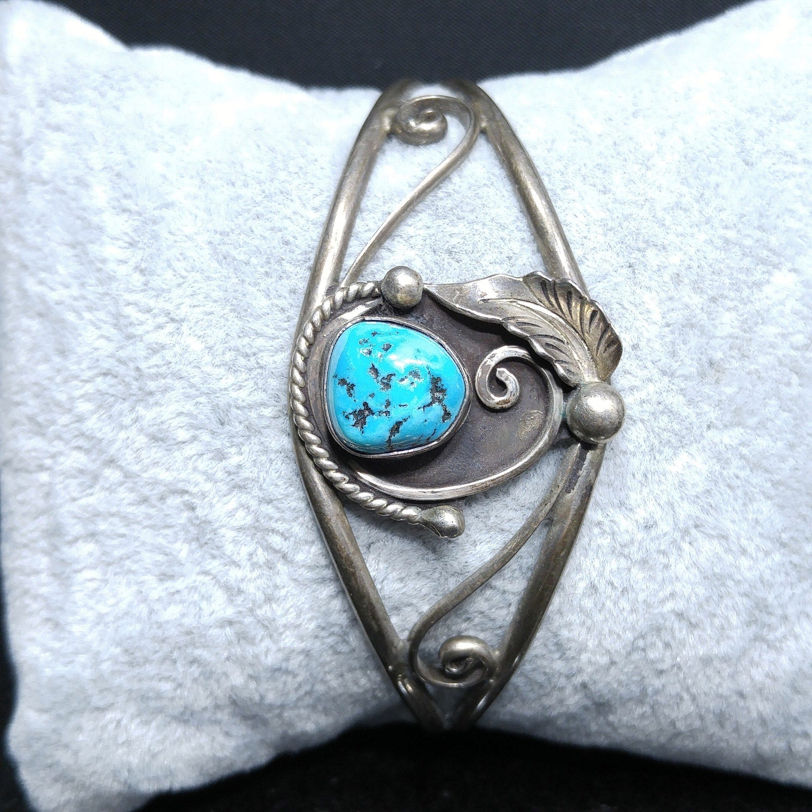 *Description: This is a beautiful D&J CLARK Vintage Navajo Sterling Silver Turquoise Leaf Applique Cuff Bracelet. It has a turquoise gemstone approximately 1/2 Inch in length & width. The unique cuff bracelet is signed on the back D & J Clark Navajo. I tested it for silver and it did test sterling. This would be a great addition to your vintage jewelry collection or make an excellent vintage gift.