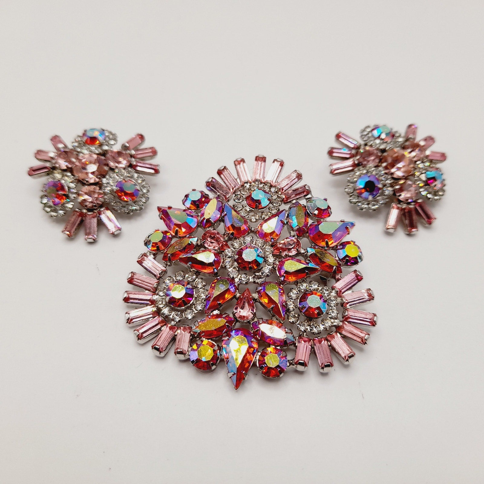 Turn heads with this breathtaking vintage WEISS jewelry set, featuring a radiant pink rhinestone floral brooch paired with matching clip-on earrings. Dating from the 1950s to 1960s, this signed WEISS set exemplifies mid-century costume jewelry elegance. The brooch bursts with brilliant faceted pink rhinestones in various shades—light blush, deep rose, and fuchsia—all hand-set in a silver-tone setting. The coordinating earrings echo the same shimmering design, making this a show-stopping ensemble perfect for collectors, vintage brides, or glamorous evening wear.