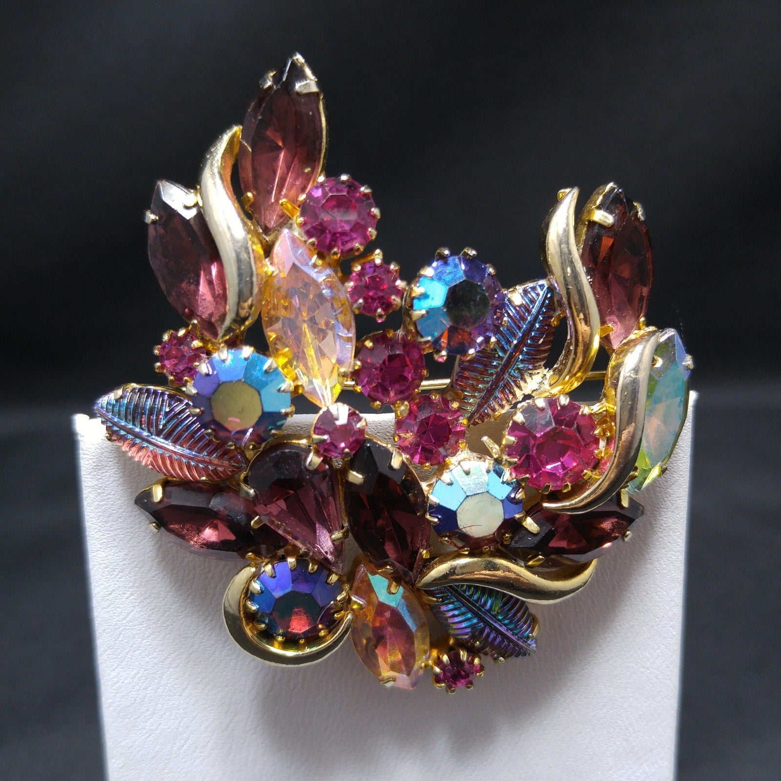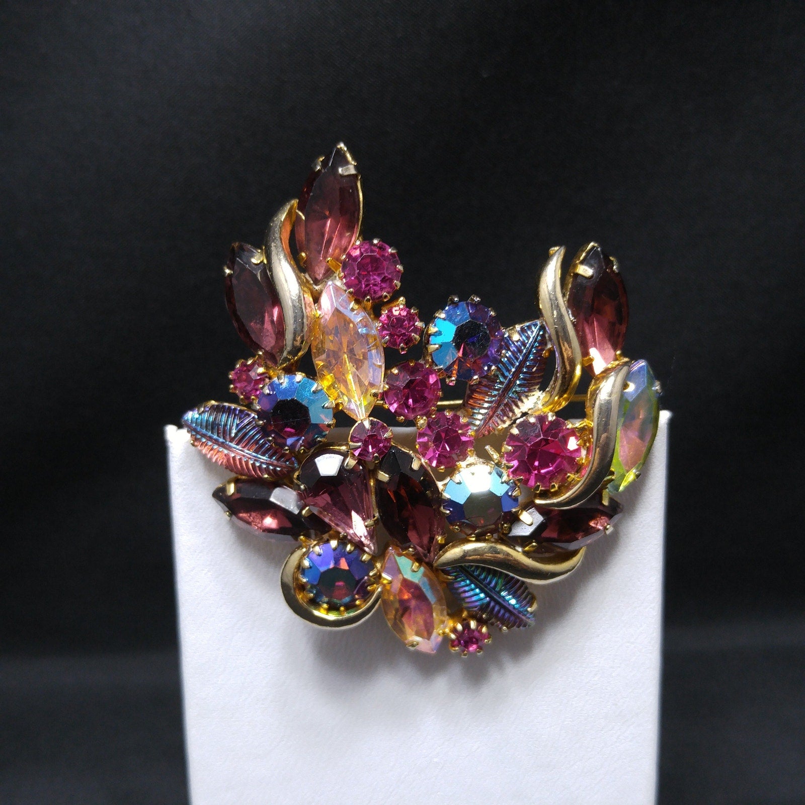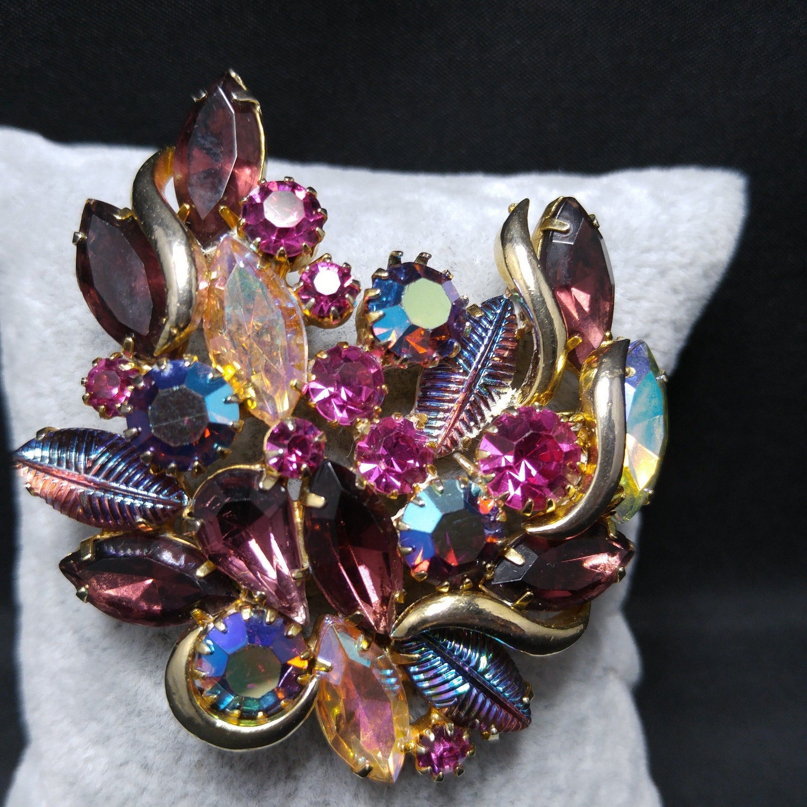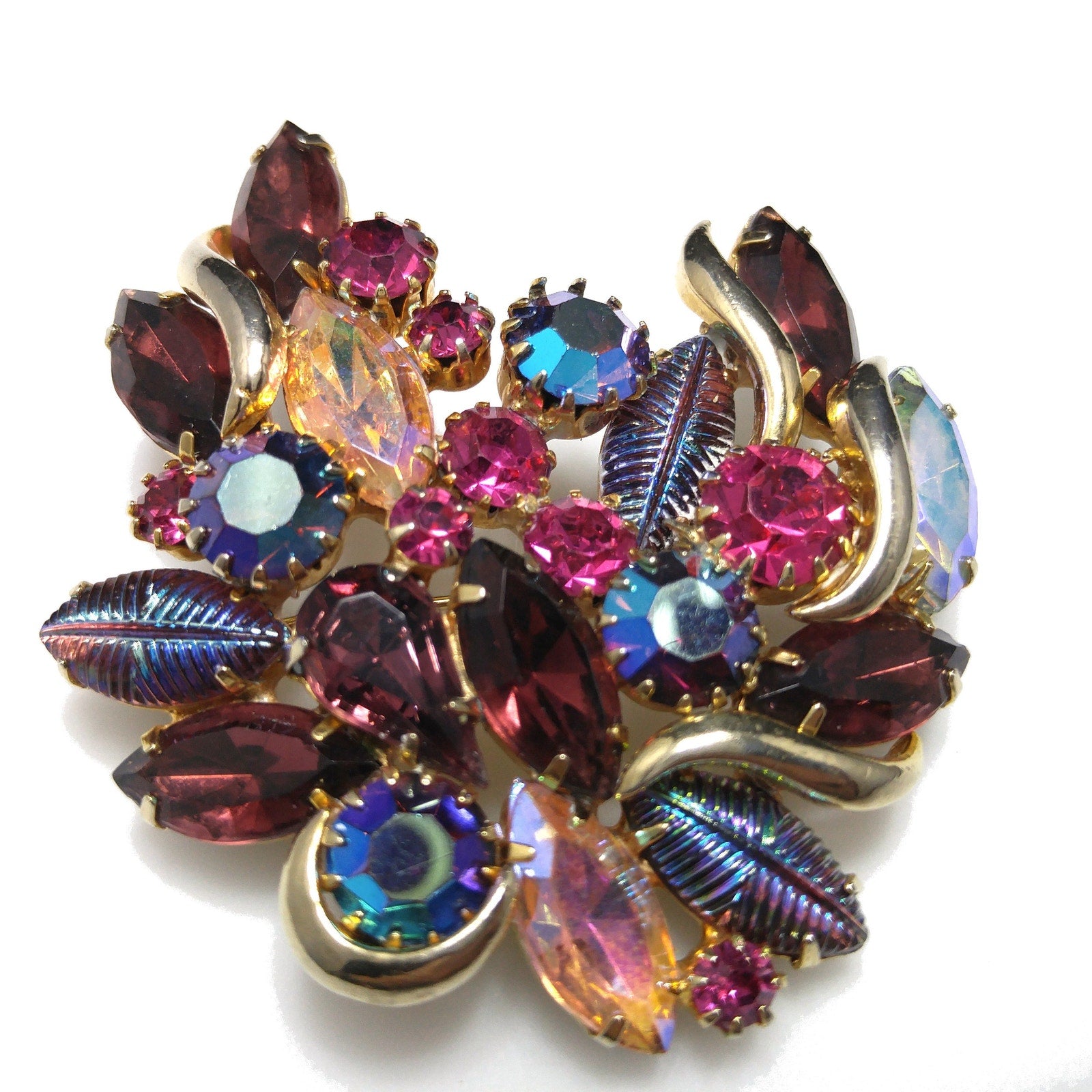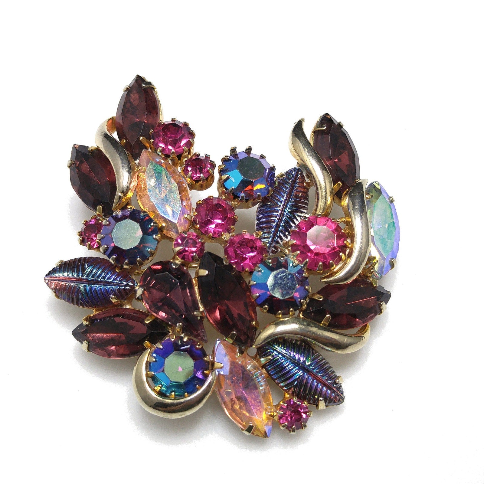 *Description: This is a gorgeous designer rhinestone and art glass brooch on a gold plated backing from the 1950s. This brooch is an unsigned designer piece with carnival glass prong set stones and molded carnival glass leaves. Many of the large rhinestones are dog-toothed prong set, multiple prongs, on each rhinestone. The combination of pink, red, and blue makes this brooch outstanding. This would be a great addition to your vintage jewelry collection or make a great vintage gift!