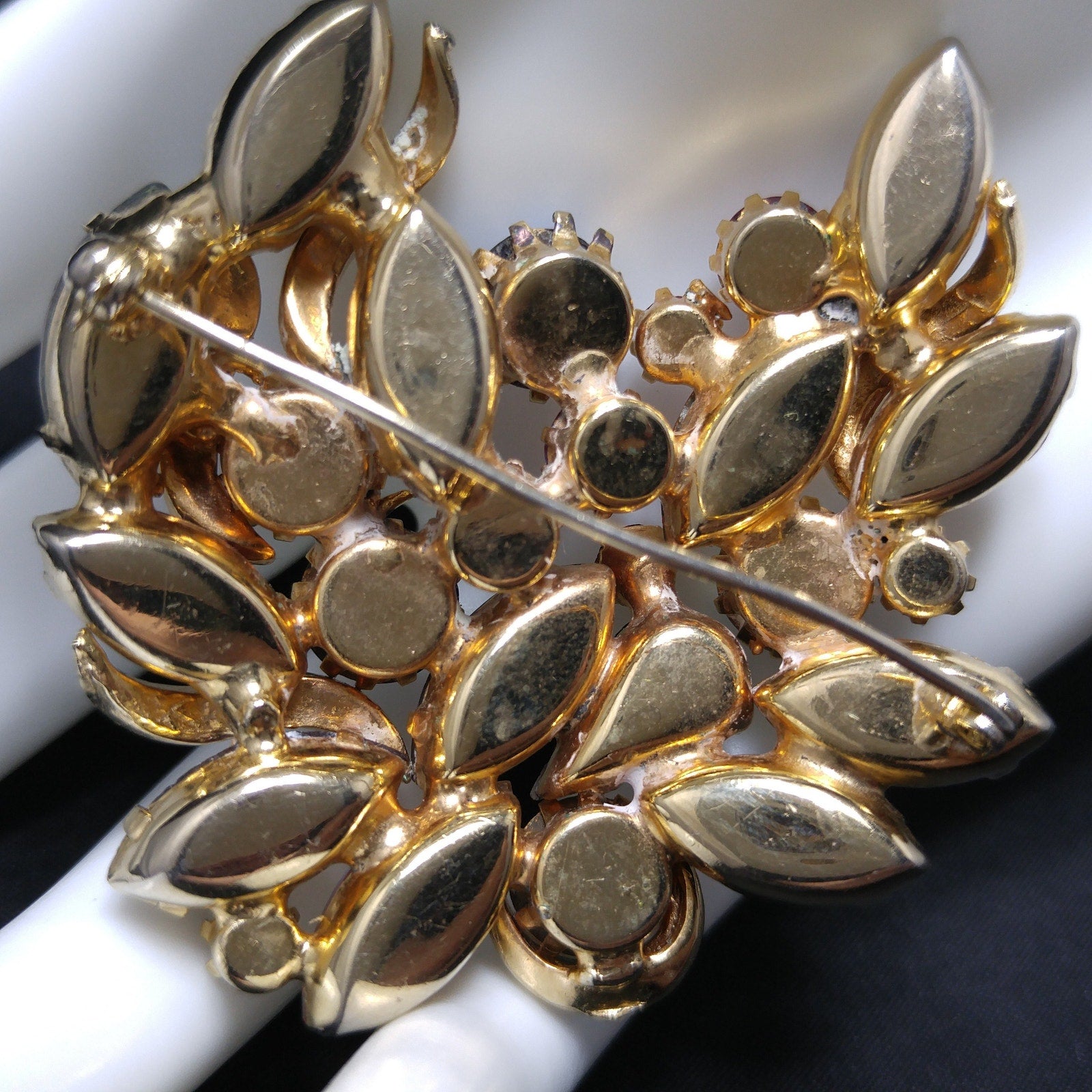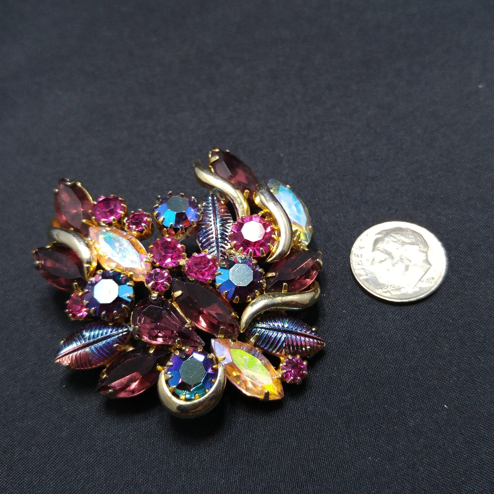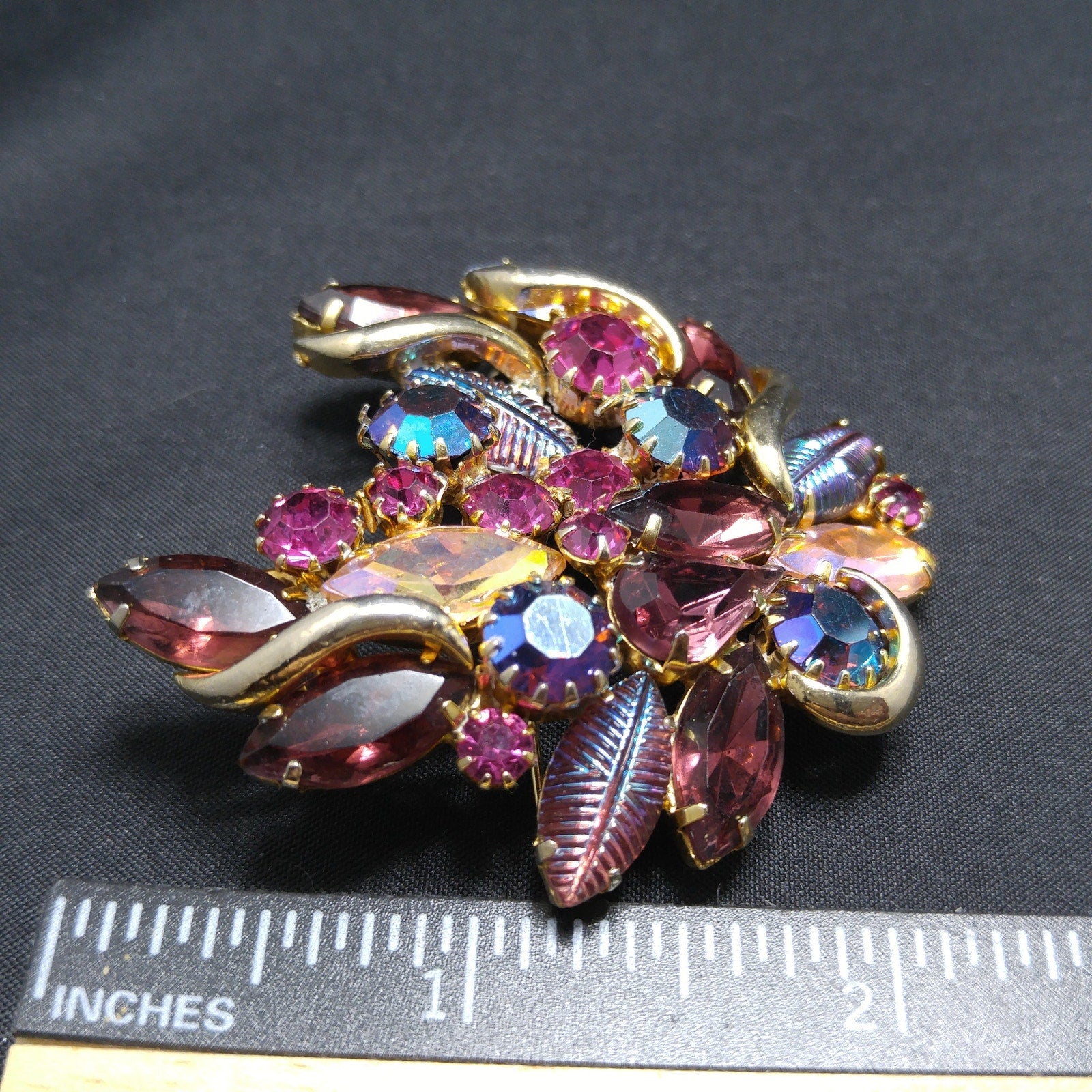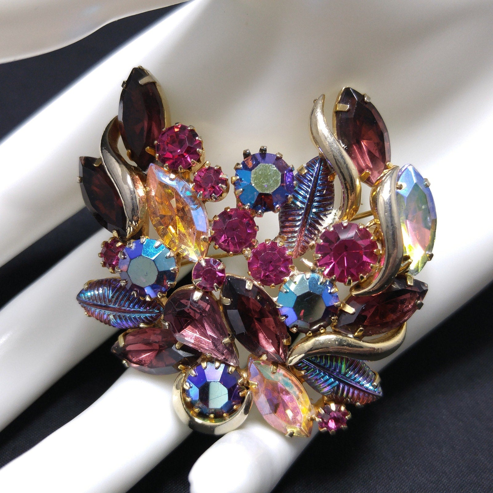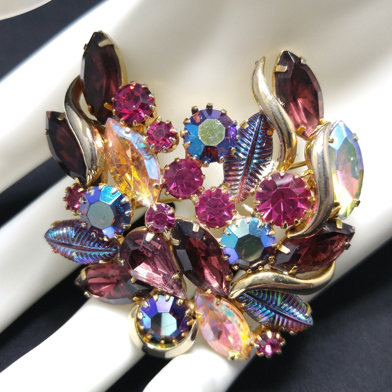 *Description: This is a gorgeous designer rhinestone and art glass brooch on a gold plated backing from the 1950s. This brooch is an unsigned designer piece with carnival glass prong set stones and molded carnival glass leaves. Many of the large rhinestones are dog-toothed prong set, multiple prongs, on each rhinestone. The combination of pink, red, and blue makes this brooch outstanding. This would be a great addition to your vintage jewelry collection or make a great vintage gift!
