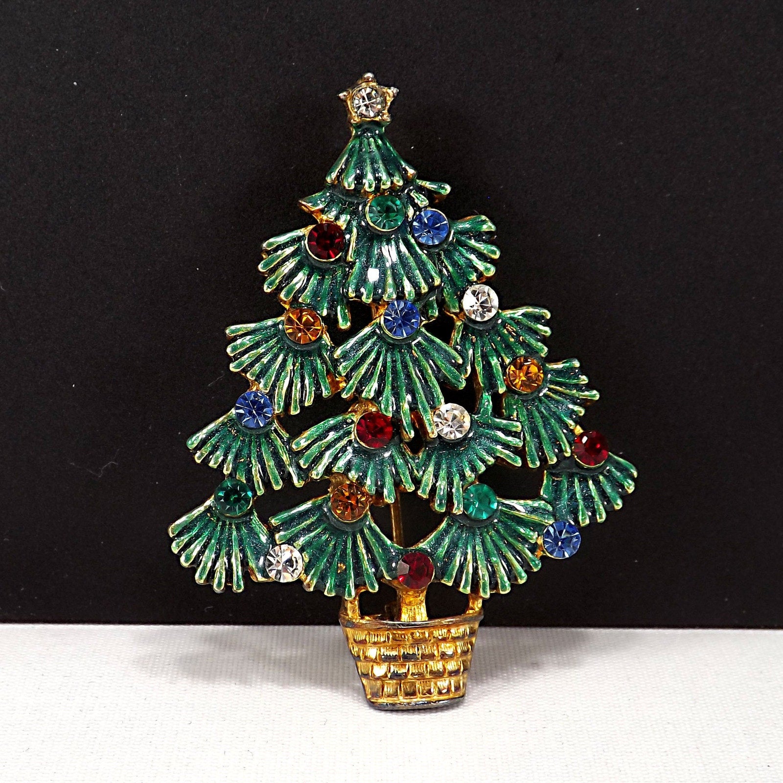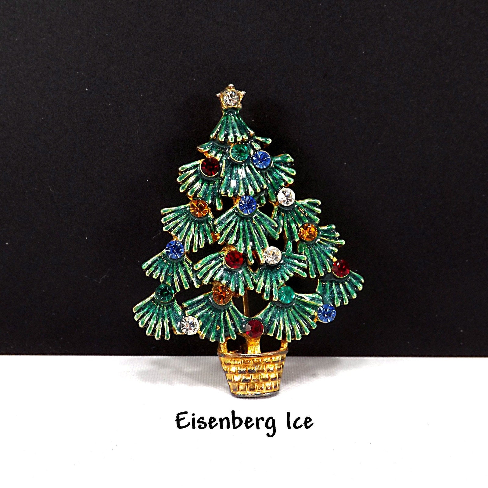 This vintage Eisenberg Ice Christmas Tree brooch from the 1970s is a true holiday treasure. The textured branches are painted with green enamel over an antique gold tone setting, giving the piece depth and dimension. The festive basket base is finished in a warm antique gold to bronze tone, complementing the design.